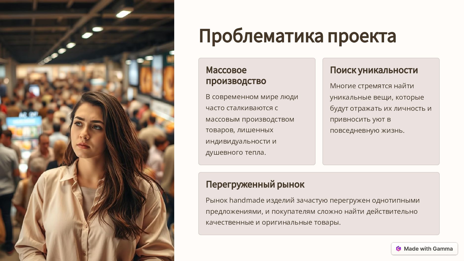 с массовым производством товаров, лишенных индивидуальности и душевного тепла. Поиск уникальности Многие стремятся найти уникальные вещи, которые будут отражать их личность и привносить уют в повседневную жизнь. Перегруженный рынок Рынок handmade изделий зачастую перегружен однотипными предложениями, и покупателям сложно найти действительно качественные и оригинальные товары.