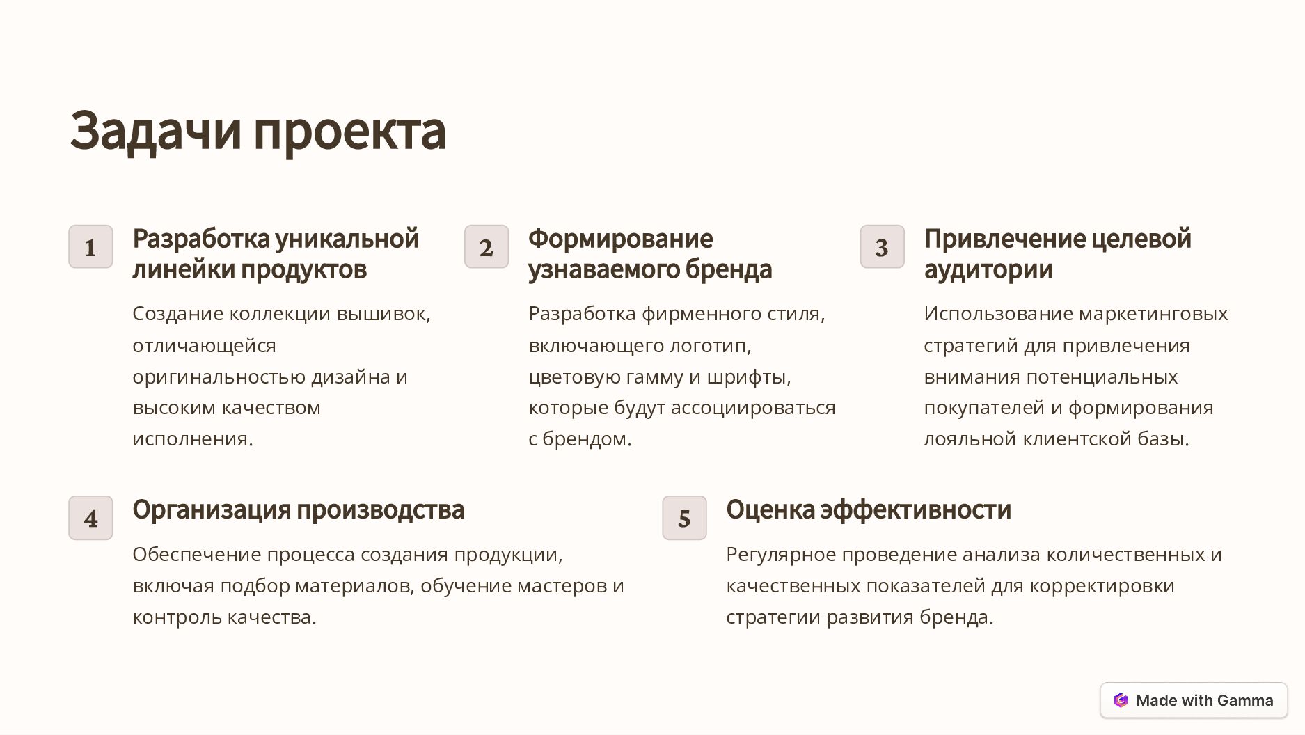 отличающейся оригинальностью дизайна и высоким качеством исполнения. 2 Формирование узнаваемого бренда Разработка фирменного стиля, включающего логотип, цветовую гамму и шрифты, которые будут ассоциироваться с брендом. 3 Привлечение целевой аудитории Использование маркетинговых стратегий для привлечения внимания потенциальных покупателей и формирования лояльной клиентской базы. 4 Организация производства Обеспечение процесса создания продукции, включая подбор материалов, обучение мастеров и контроль качества. 5 Оценка эффективности Регулярное проведение анализа количественных и качественных показателей для корректировки стратегии развития бренда.