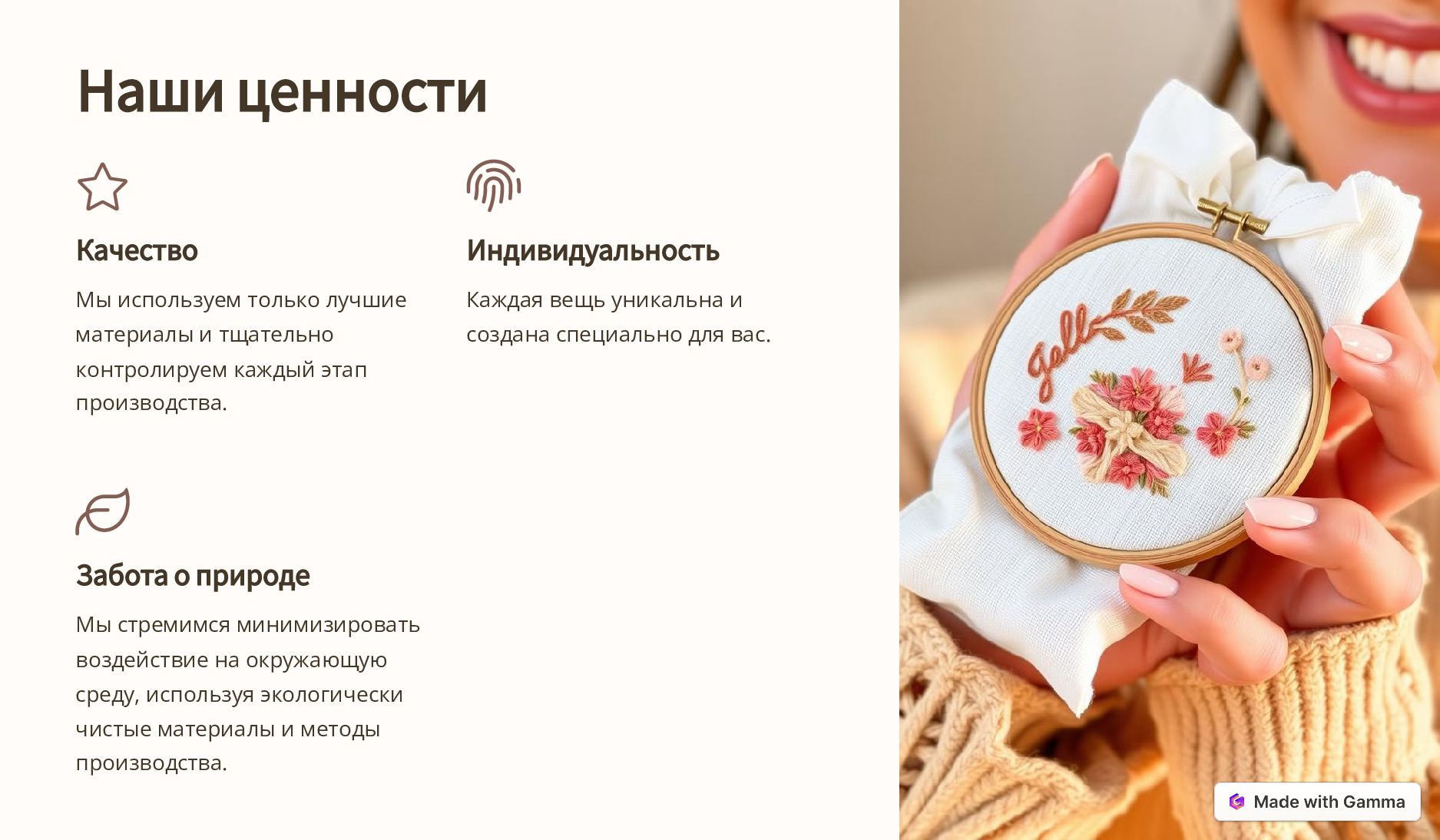 контролируем каждый этап производства. Индивидуальность Каждая вещь уникальна и создана специально для вас. Забота о природе Мы стремимся минимизировать воздействие на окружающую среду, используя экологически чистые материалы и методы производства.