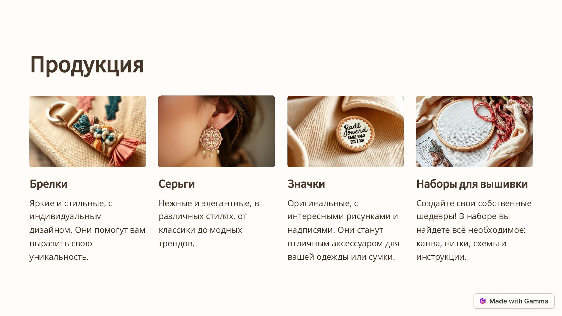 вам выразить свою уникальность. Серьги Нежные и элегантные, в различных стилях, от классики до модных трендов. Значки Оригинальные, с интересными рисунками и надписями. Они станут отличным аксессуаром для вашей одежды или сумки. Наборы для вышивки Создайте свои собственные шедевры! В наборе вы найдете всё необходимое: канва, нитки, схемы и инструкции.