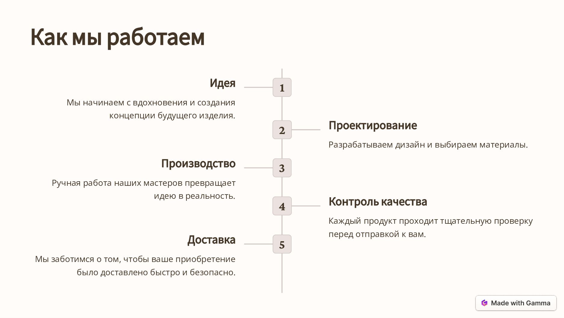 создания концепции будущего изделия. 2 Проектирование Разрабатываем дизайн и выбираем материалы. 3 Производство Ручная работа наших мастеров превращает идею в реальность. 4 Контроль качества Каждый продукт проходит тщательную проверку перед отправкой к вам. 5 Доставка Мы заботимся о том, чтобы ваше приобретение было доставлено быстро и безопасно.