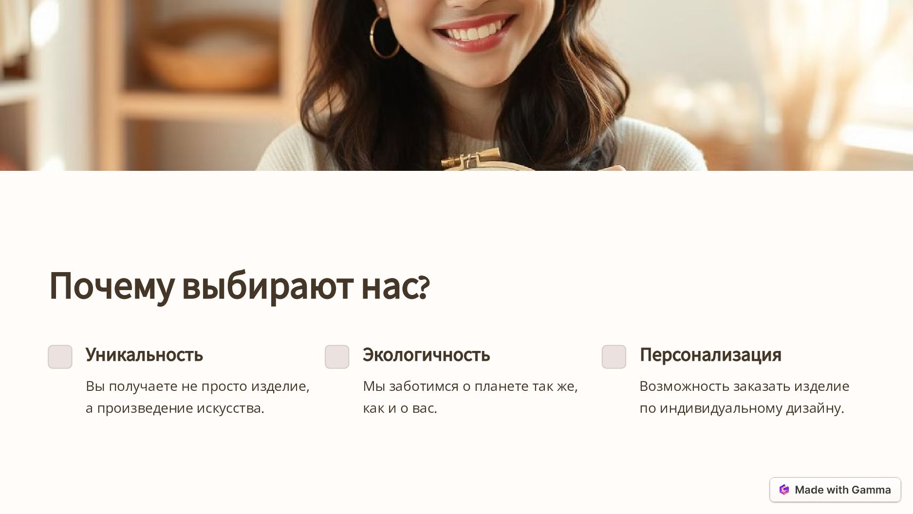 произведение искусства. Экологичность Мы заботимся о планете так же, как и о вас. Персонализация Возможность заказать изделие по индивидуальному дизайну.