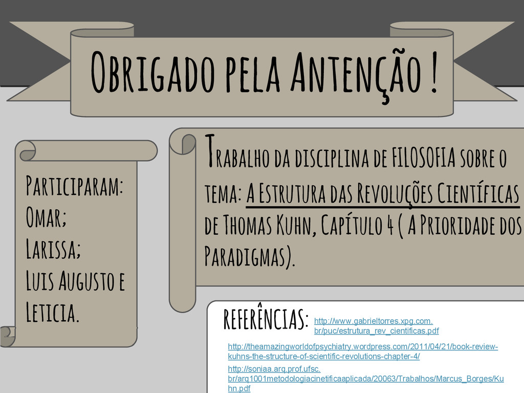Leticia. Trabalho da disciplina de FILOSOFIA sobre o tema: A Estrutura das Revoluções Científicas de Thomas Kuhn, Capítulo 4 ( A Prioridade dos Paradigmas). REFERÊNCIAS: http://www.gabrieltorres.xpg.com. br/puc/estrutura_rev_cientificas.pdf http://theamazingworldofpsychiatry.wordpress.com/2011/04/21/book-review- kuhns-the-structure-of-scientific-revolutions-chapter-4/ http://soniaa.arq.prof.ufsc. br/arq1001metodologiacinetificaaplicada/20063/Trabalhos/Marcus_Borges/Ku hn.pdf