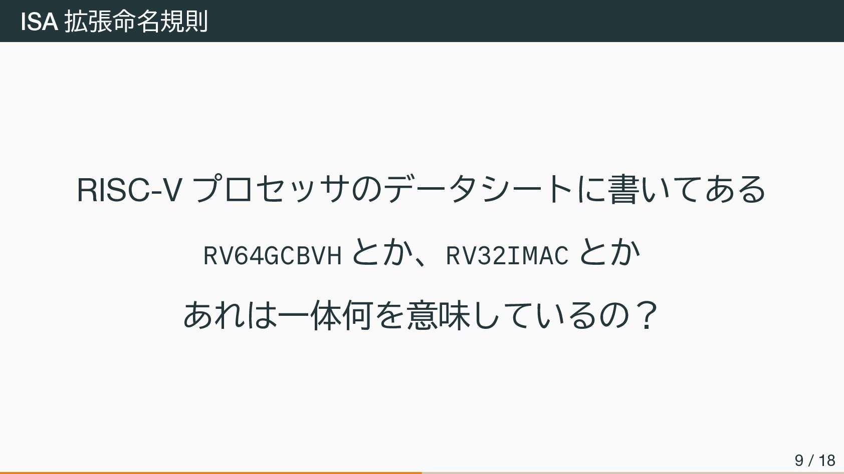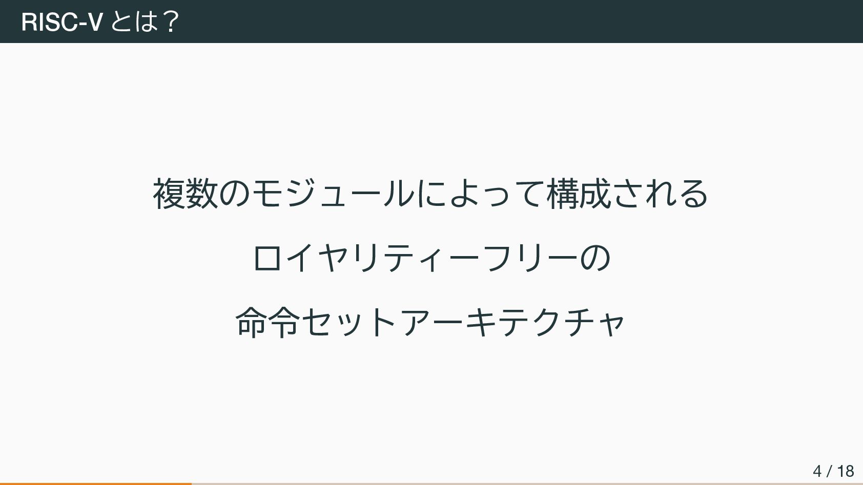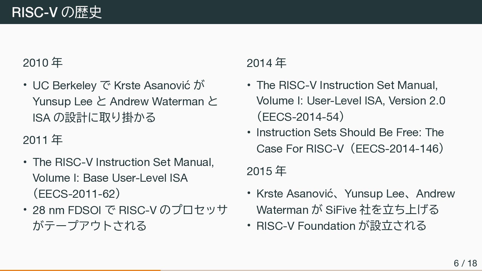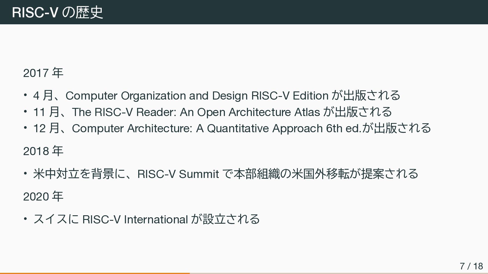 が Yunsup Lee と Andrew Waterman と ISA の設計に取り掛かる 2011 年 • The RISC-V Instruction Set Manual, Volume I: Base User-Level ISA (EECS-2011-62) • 28 nm FDSOI で RISC-V のプロセッサ がテープアウトされる 2014 年 • The RISC-V Instruction Set Manual, Volume I: User-Level ISA, Version 2.0 (EECS-2014-54) • Instruction Sets Should Be Free: The Case For RISC-V(EECS-2014-146) 2015 年 • Krste Asanović、Yunsup Lee、Andrew Waterman が SiFive 社を立ち上げる • RISC-V Foundation が設立される 6 / 18