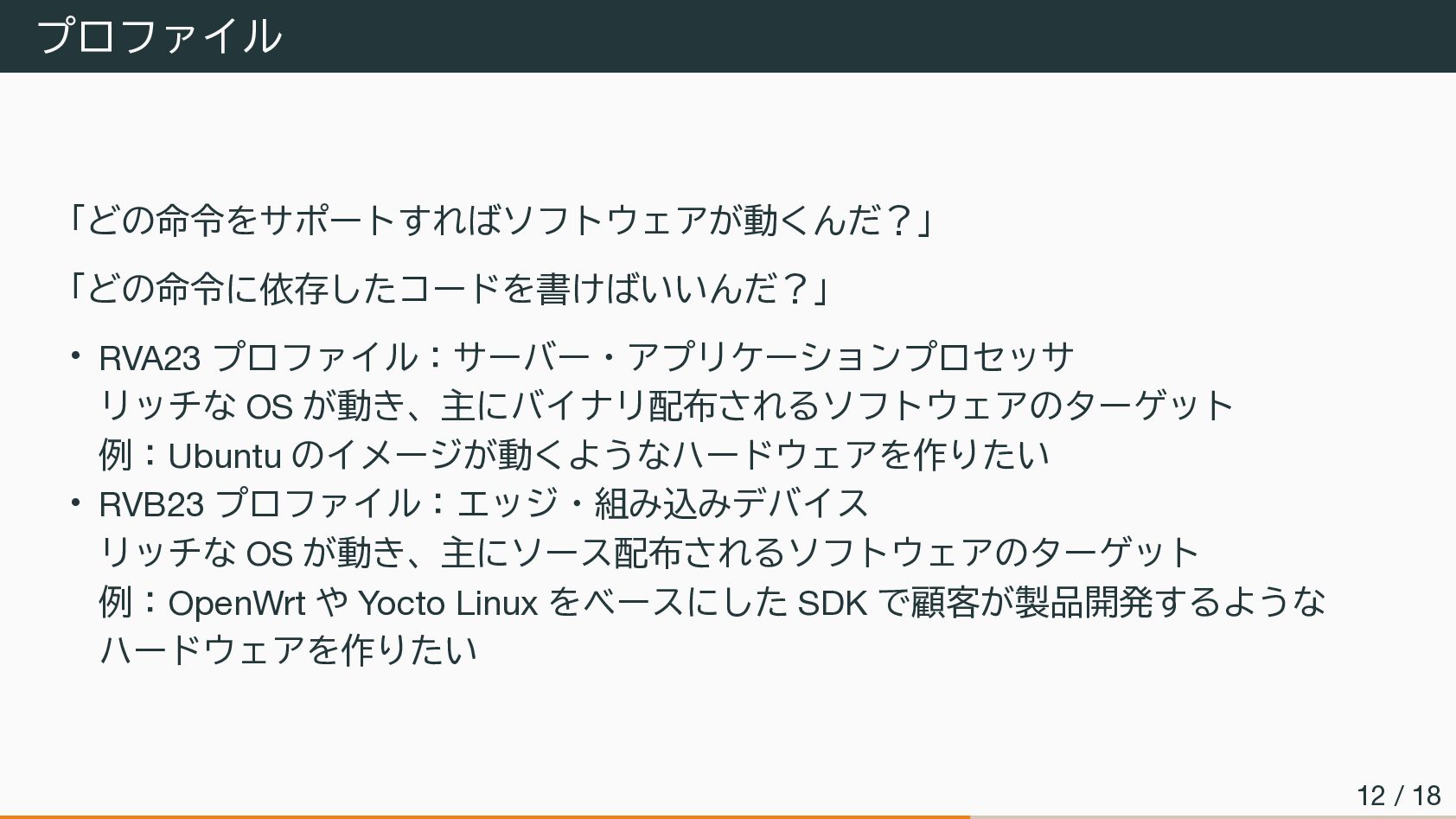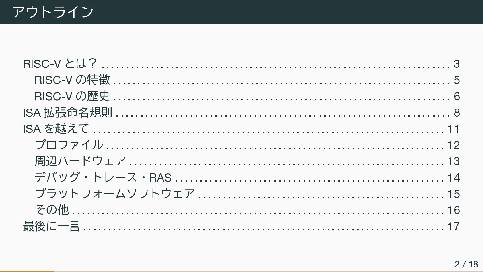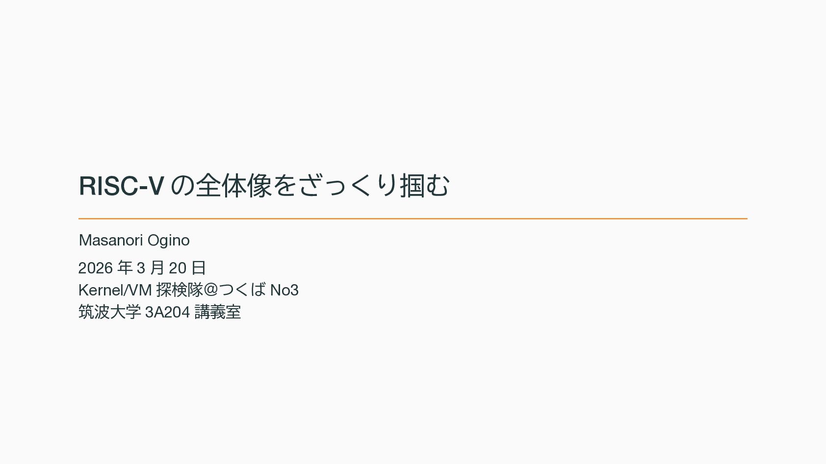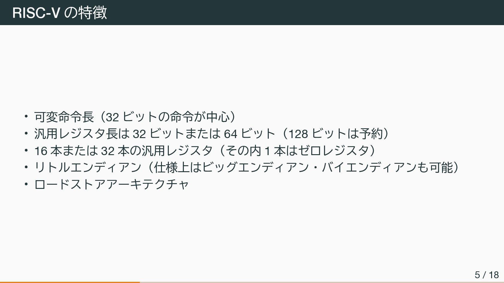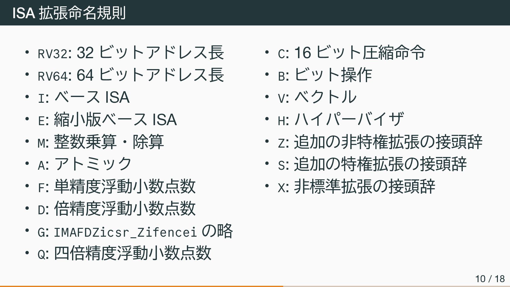 が Yunsup Lee と Andrew Waterman と ISA の設計に取り掛かる 2011 年 • The RISC-V Instruction Set Manual, Volume I: Base User-Level ISA (EECS-2011-62) • 28 nm FDSOI で RISC-V のプロセッサ がテープアウトされる 2014 年 • The RISC-V Instruction Set Manual, Volume I: User-Level ISA, Version 2.0 (EECS-2014-54) • Instruction Sets Should Be Free: The Case For RISC-V(EECS-2014-146) 2015 年 • Krste Asanović、Yunsup Lee、Andrew Waterman が SiFive 社を立ち上げる • RISC-V Foundation が設立される 6 / 18