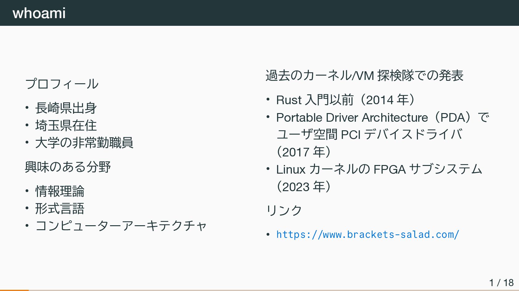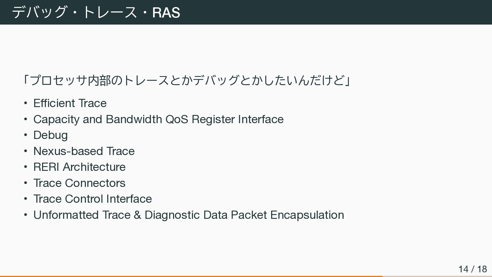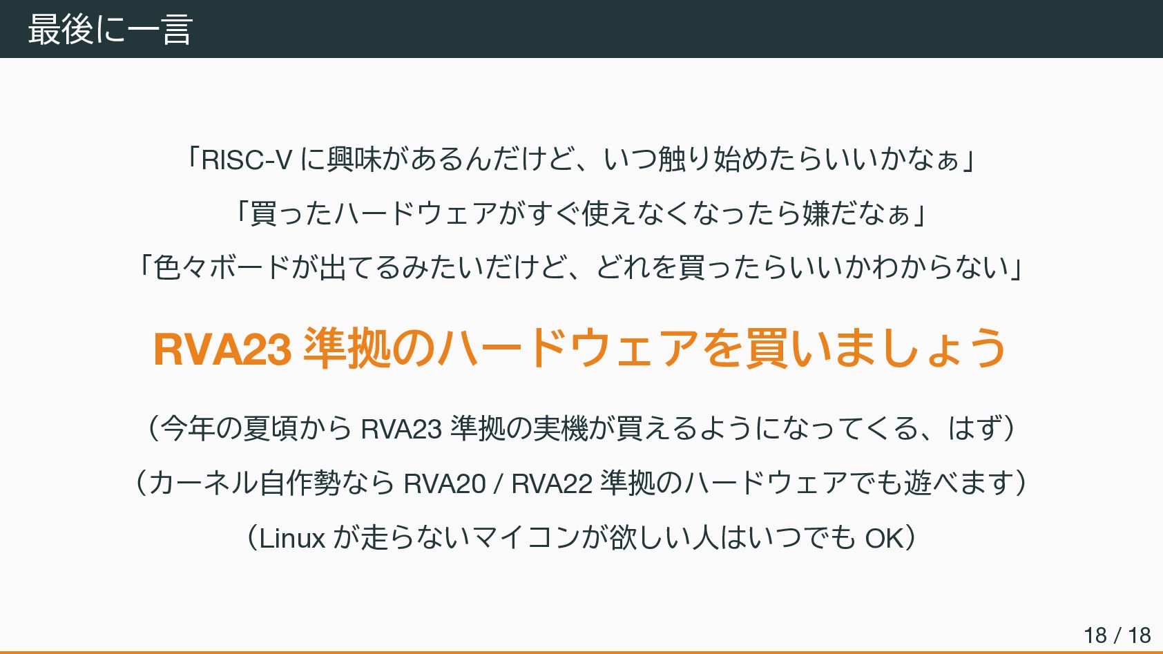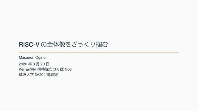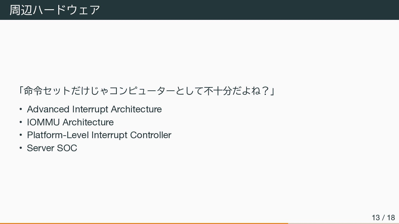 が Yunsup Lee と Andrew Waterman と ISA の設計に取り掛かる 2011 年 • The RISC-V Instruction Set Manual, Volume I: Base User-Level ISA (EECS-2011-62) • 28 nm FDSOI で RISC-V のプロセッサ がテープアウトされる 2014 年 • The RISC-V Instruction Set Manual, Volume I: User-Level ISA, Version 2.0 (EECS-2014-54) • Instruction Sets Should Be Free: The Case For RISC-V(EECS-2014-146) 2015 年 • Krste Asanović、Yunsup Lee、Andrew Waterman が SiFive 社を立ち上げる • RISC-V Foundation が設立される 6 / 18