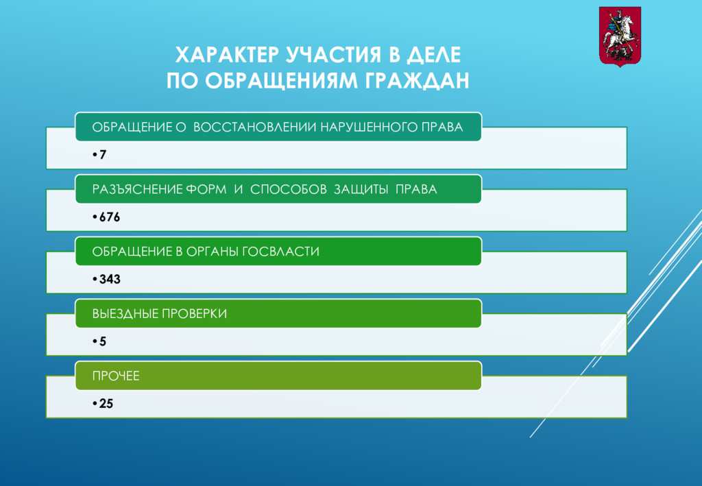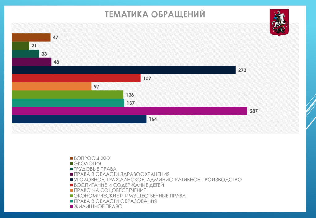 47 ТЕМАТИКА ОБРАЩЕНИЙ ВОПРОСЫ ЖКХ ЭКОЛОГИЯ ТРУДОВЫЕ ПРАВА ПРАВА В ОБЛАСТИ ЗДРАВООХРАНЕНИЯ УГОЛОВНОЕ, ГРАЖДАНСКОЕ, АДМИНИСТРАТИВНОЕ ПРОИЗВОДСТВО ВОСПИТАНИЕ И СОДЕРЖАНИЕ ДЕТЕЙ ПРАВО НА СОЦОБЕСПЕЧЕНИЕ ЭКОНОМИЧЕСКИЕ И ИМУЩЕСТВЕННЫЕ ПРАВА ПРАВА В ОБЛАСТИ ОБРАЗОВАНИЯ ЖИЛИЩНОЕ ПРАВО