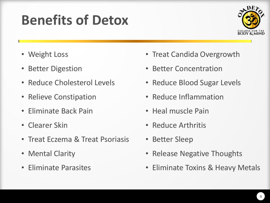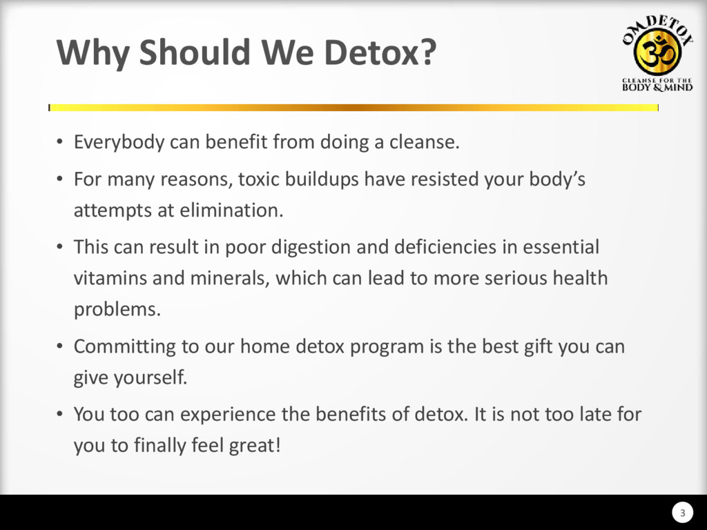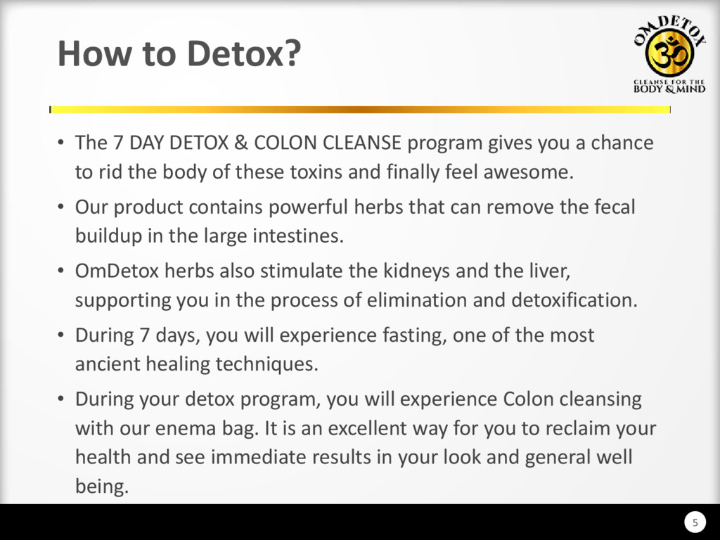 The 7 Day Detox & Colon Cleanse involves fasting with the help of supplements and our detox drink formula. There is no solid food taken during the entire program. Fasting is one of the most important methods for promoting longevity. It detoxifies the bloodstream, restores mental clarity, eliminates toxins and waste materials from our digestive track. This process starts after 24 hours without the intake of food. To Know More: http://www.omdetox.com/