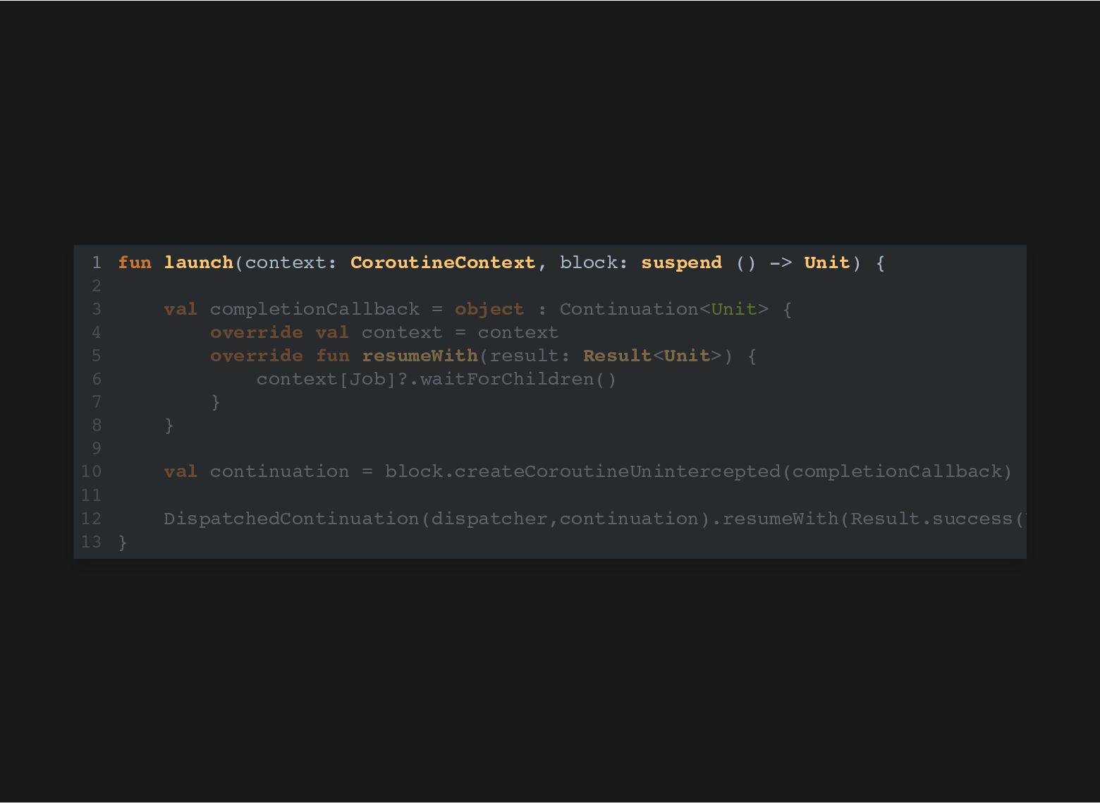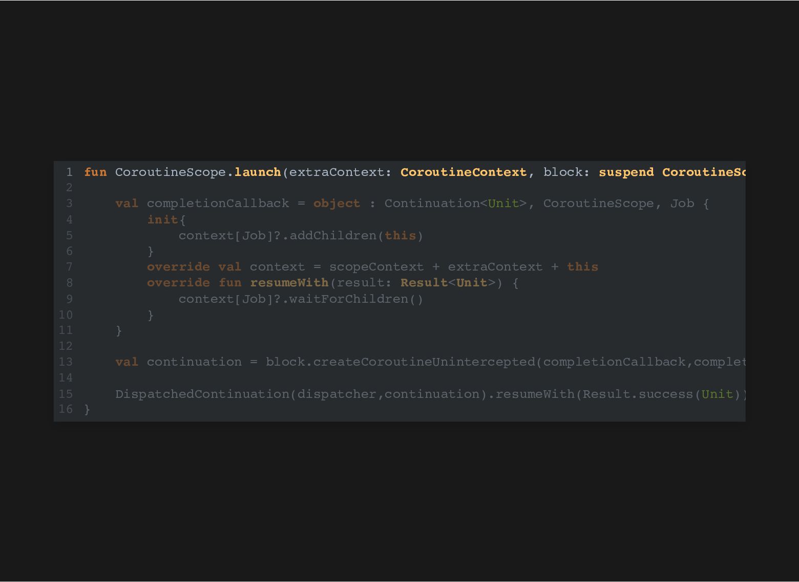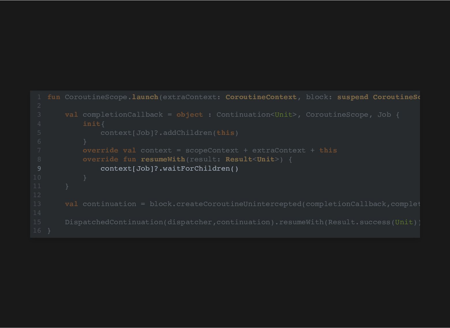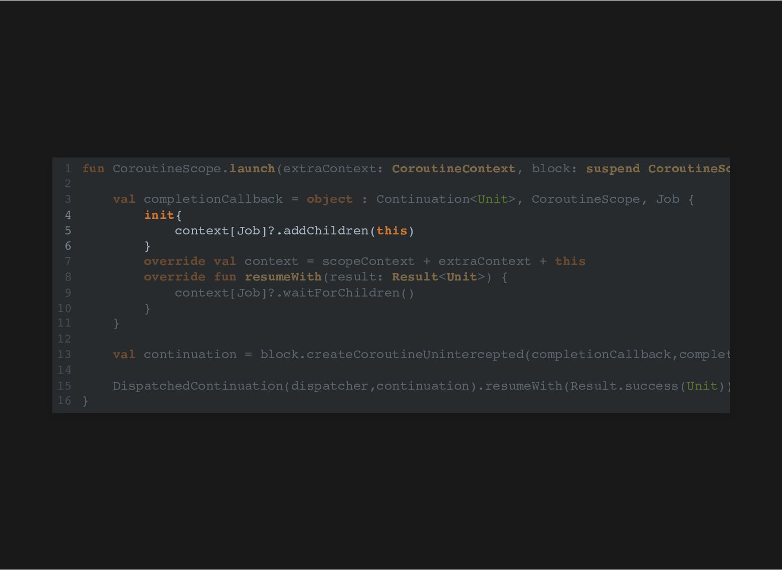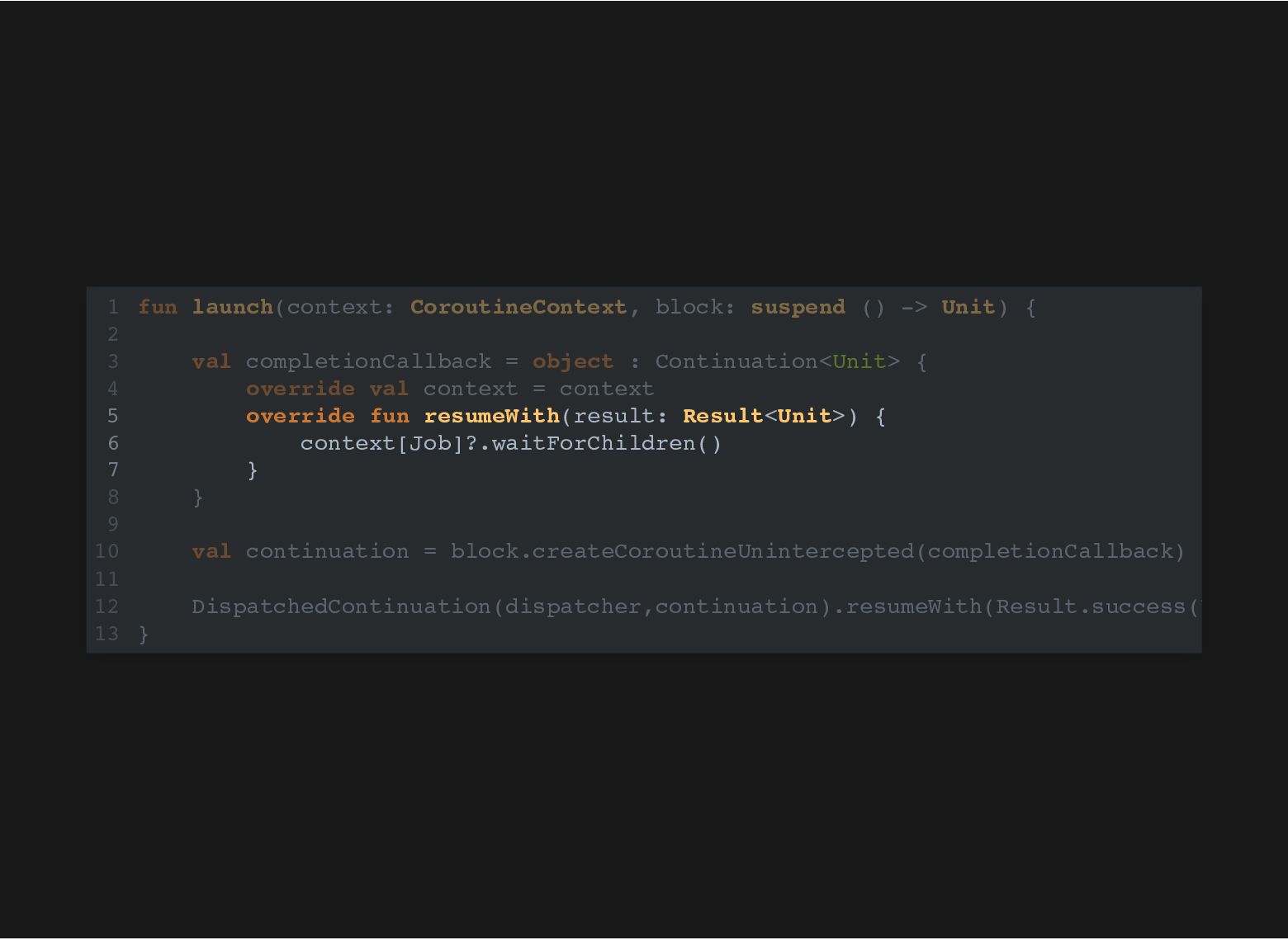 = object : Continuation<Unit>, CoroutineScope, Job { 3 init{ 4 context[Job]?.addChildren(this) 5 } 6 override val context = scopeContext + extraContext + this 7 override fun resumeWith(result: Result<Unit>) { 8 context[Job]?.waitForChildren() 9 } 10 } 11 12 val continuation = block.createCoroutineUnintercepted(completionCallback,complet 13 14 DispatchedContinuation(dispatcher,continuation).resumeWith(Result.success(Unit)) 15 } 16 val completionCallback = object : Continuation<Unit>, CoroutineScope, Job { fun CoroutineScope.launch(extraContext: CoroutineContext, block: suspend CoroutineSc 1 2 3 init{ 4 context[Job]?.addChildren(this) 5 } 6 override val context = scopeContext + extraContext + this 7 override fun resumeWith(result: Result<Unit>) { 8 context[Job]?.waitForChildren() 9 } 10 } 11 12 val continuation = block.createCoroutineUnintercepted(completionCallback,complet 13 14 DispatchedContinuation(dispatcher,continuation).resumeWith(Result.success(Unit)) 15 } 16 init{ context[Job]?.addChildren(this) } fun CoroutineScope.launch(extraContext: CoroutineContext, block: suspend CoroutineSc 1 2 val completionCallback = object : Continuation<Unit>, CoroutineScope, Job { 3 4 5 6 override val context = scopeContext + extraContext + this 7 override fun resumeWith(result: Result<Unit>) { 8 context[Job]?.waitForChildren() 9 } 10 } 11 12 val continuation = block.createCoroutineUnintercepted(completionCallback,complet 13 14 DispatchedContinuation(dispatcher,continuation).resumeWith(Result.success(Unit)) 15 } 16 context[Job]?.waitForChildren() fun CoroutineScope.launch(extraContext: CoroutineContext, block: suspend CoroutineSc 1 2 val completionCallback = object : Continuation<Unit>, CoroutineScope, Job { 3 init{ 4 context[Job]?.addChildren(this) 5 } 6 override val context = scopeContext + extraContext + this 7 override fun resumeWith(result: Result<Unit>) { 8 9 } 10 } 11 12 val continuation = block.createCoroutineUnintercepted(completionCallback,complet 13 14 DispatchedContinuation(dispatcher,continuation).resumeWith(Result.success(Unit)) 15 } 16 fun CoroutineScope.launch(extraContext: CoroutineContext, block: suspend CoroutineSc val completionCallback = object : Continuation<Unit>, CoroutineScope, Job { init{ context[Job]?.addChildren(this) } override val context = scopeContext + extraContext + this override fun resumeWith(result: Result<Unit>) { context[Job]?.waitForChildren() } } val continuation = block.createCoroutineUnintercepted(completionCallback,complet DispatchedContinuation(dispatcher,continuation).resumeWith(Result.success(Unit)) } 1 2 3 4 5 6 7 8 9 10 11 12 13 14 15 16