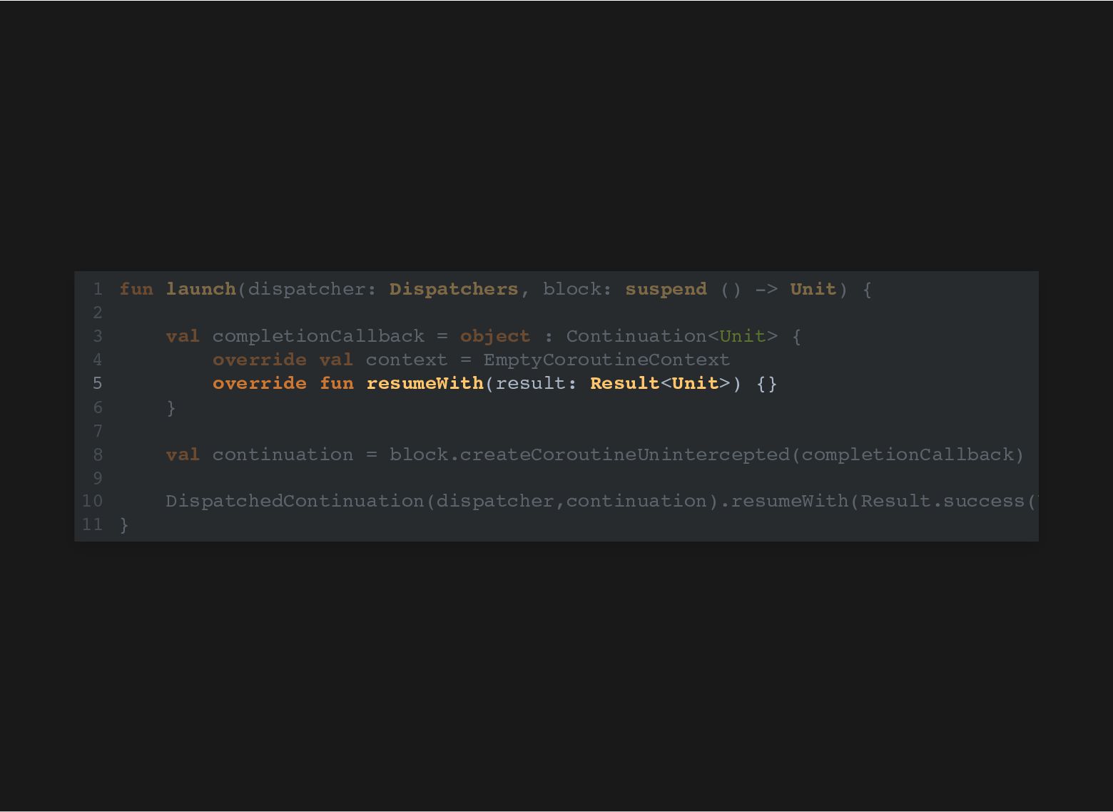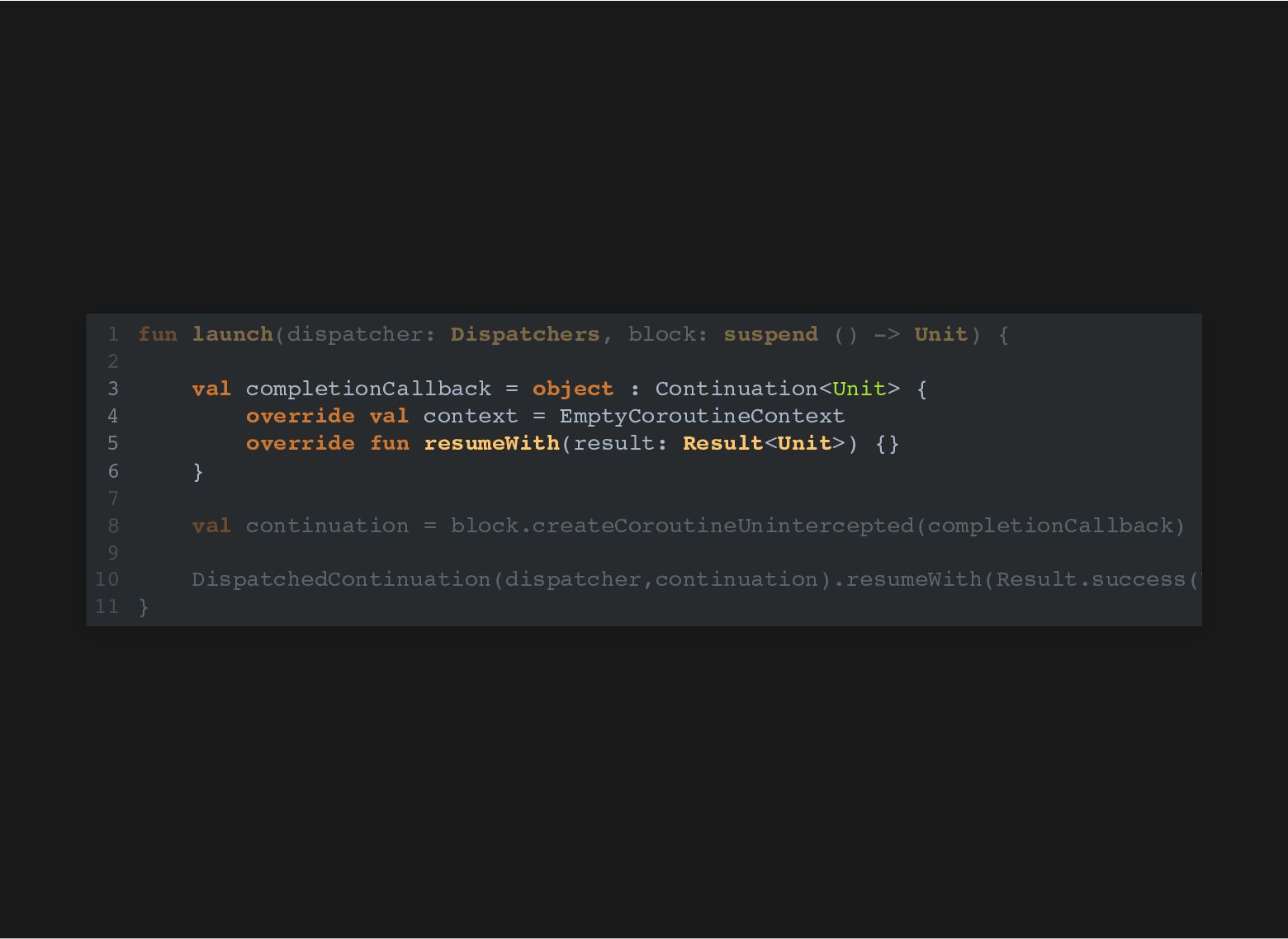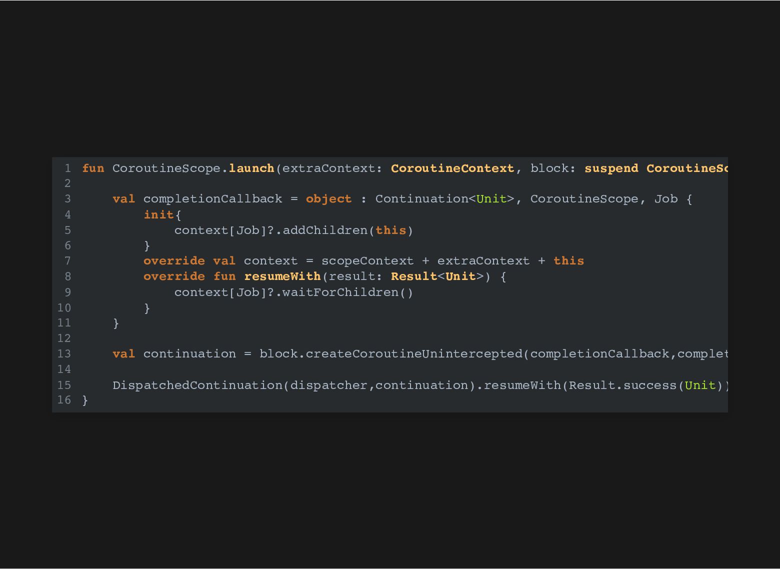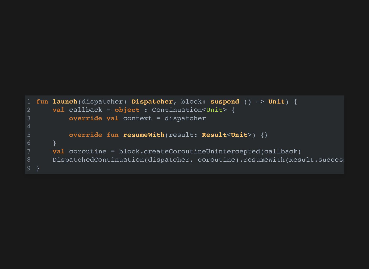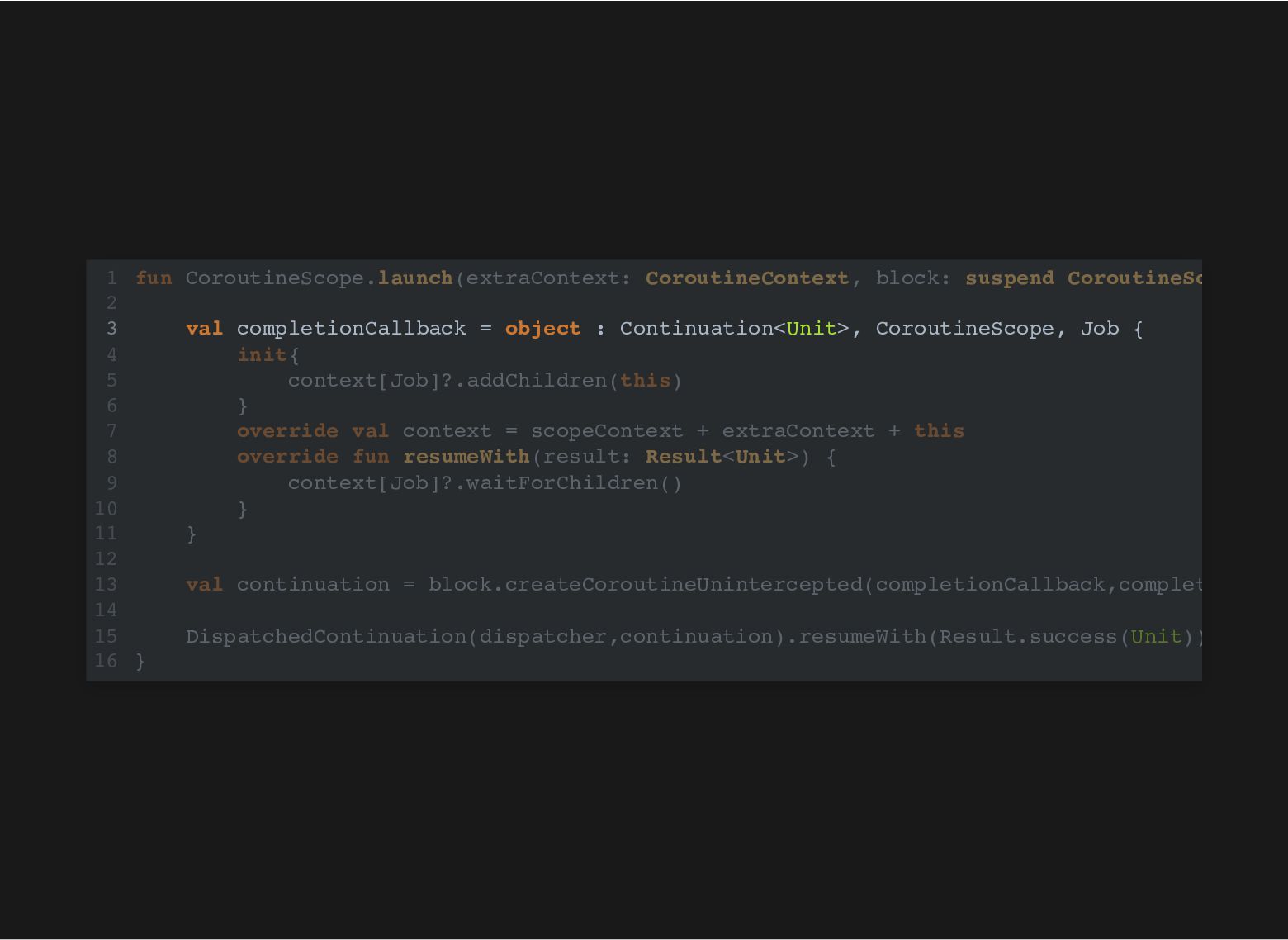 = object : Continuation<Unit>, CoroutineScope, Job { 3 init{ 4 context[Job]?.addChildren(this) 5 } 6 override val context = scopeContext + extraContext + this 7 override fun resumeWith(result: Result<Unit>) { 8 context[Job]?.waitForChildren() 9 } 10 } 11 12 val continuation = block.createCoroutineUnintercepted(completionCallback,complet 13 14 DispatchedContinuation(dispatcher,continuation).resumeWith(Result.success(Unit)) 15 } 16 val completionCallback = object : Continuation<Unit>, CoroutineScope, Job { fun CoroutineScope.launch(extraContext: CoroutineContext, block: suspend CoroutineSc 1 2 3 init{ 4 context[Job]?.addChildren(this) 5 } 6 override val context = scopeContext + extraContext + this 7 override fun resumeWith(result: Result<Unit>) { 8 context[Job]?.waitForChildren() 9 } 10 } 11 12 val continuation = block.createCoroutineUnintercepted(completionCallback,complet 13 14 DispatchedContinuation(dispatcher,continuation).resumeWith(Result.success(Unit)) 15 } 16 init{ context[Job]?.addChildren(this) } fun CoroutineScope.launch(extraContext: CoroutineContext, block: suspend CoroutineSc 1 2 val completionCallback = object : Continuation<Unit>, CoroutineScope, Job { 3 4 5 6 override val context = scopeContext + extraContext + this 7 override fun resumeWith(result: Result<Unit>) { 8 context[Job]?.waitForChildren() 9 } 10 } 11 12 val continuation = block.createCoroutineUnintercepted(completionCallback,complet 13 14 DispatchedContinuation(dispatcher,continuation).resumeWith(Result.success(Unit)) 15 } 16 context[Job]?.waitForChildren() fun CoroutineScope.launch(extraContext: CoroutineContext, block: suspend CoroutineSc 1 2 val completionCallback = object : Continuation<Unit>, CoroutineScope, Job { 3 init{ 4 context[Job]?.addChildren(this) 5 } 6 override val context = scopeContext + extraContext + this 7 override fun resumeWith(result: Result<Unit>) { 8 9 } 10 } 11 12 val continuation = block.createCoroutineUnintercepted(completionCallback,complet 13 14 DispatchedContinuation(dispatcher,continuation).resumeWith(Result.success(Unit)) 15 } 16 fun CoroutineScope.launch(extraContext: CoroutineContext, block: suspend CoroutineSc val completionCallback = object : Continuation<Unit>, CoroutineScope, Job { init{ context[Job]?.addChildren(this) } override val context = scopeContext + extraContext + this override fun resumeWith(result: Result<Unit>) { context[Job]?.waitForChildren() } } val continuation = block.createCoroutineUnintercepted(completionCallback,complet DispatchedContinuation(dispatcher,continuation).resumeWith(Result.success(Unit)) } 1 2 3 4 5 6 7 8 9 10 11 12 13 14 15 16