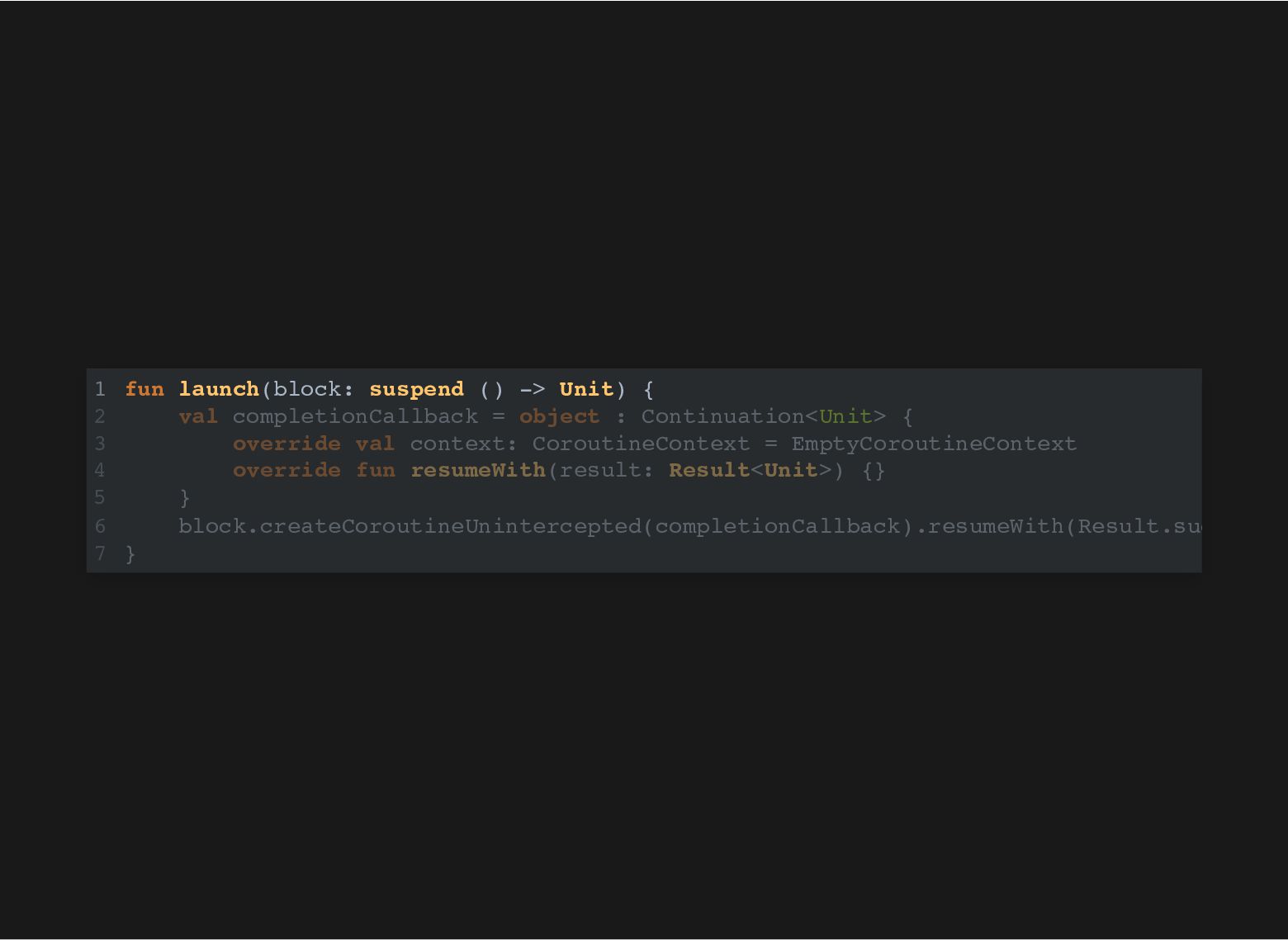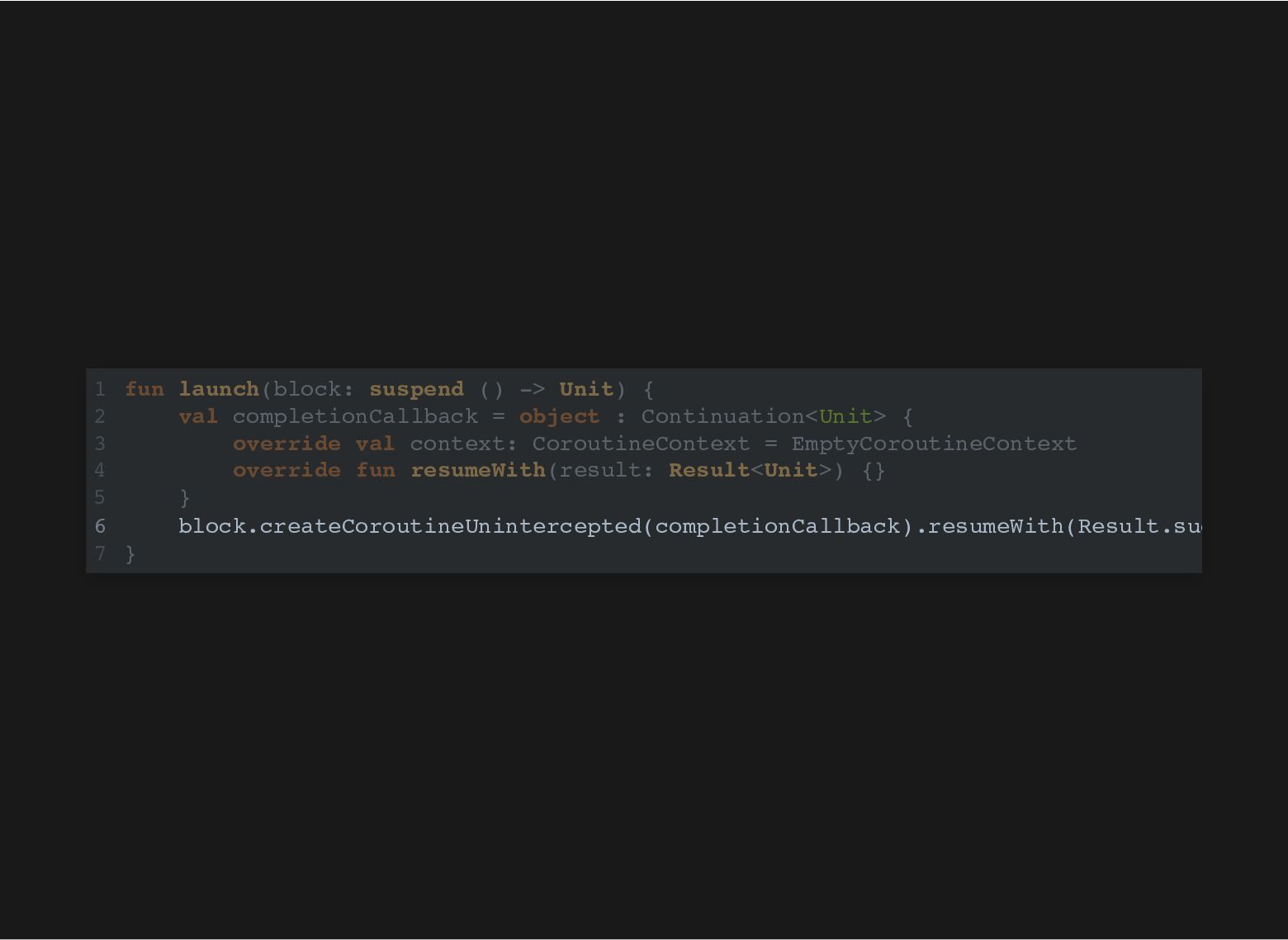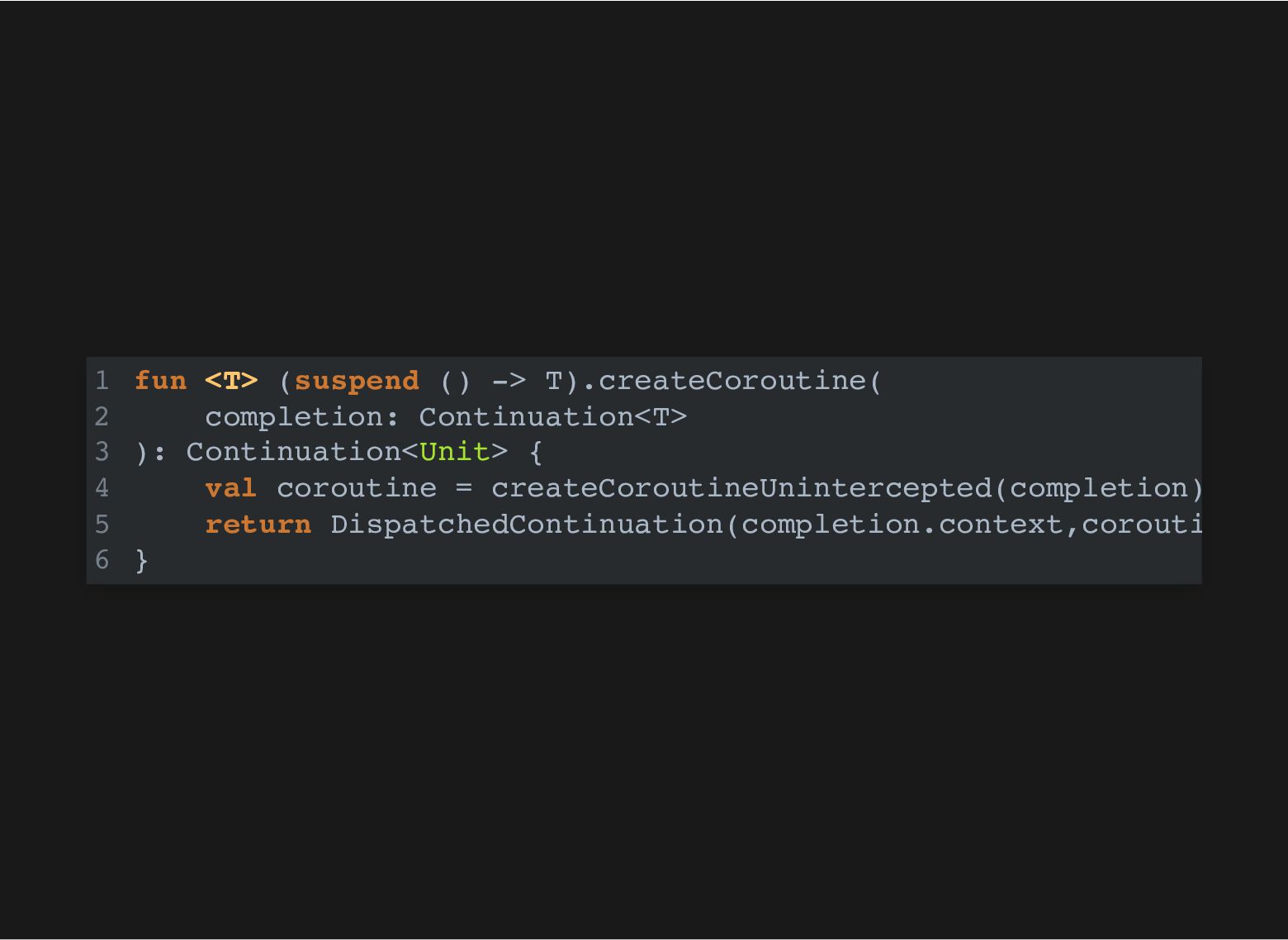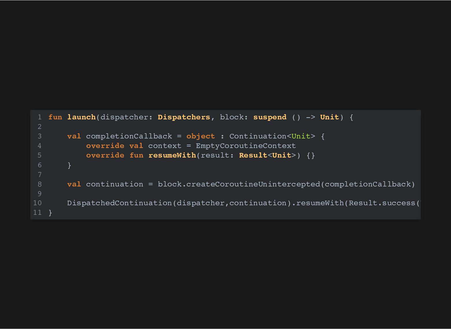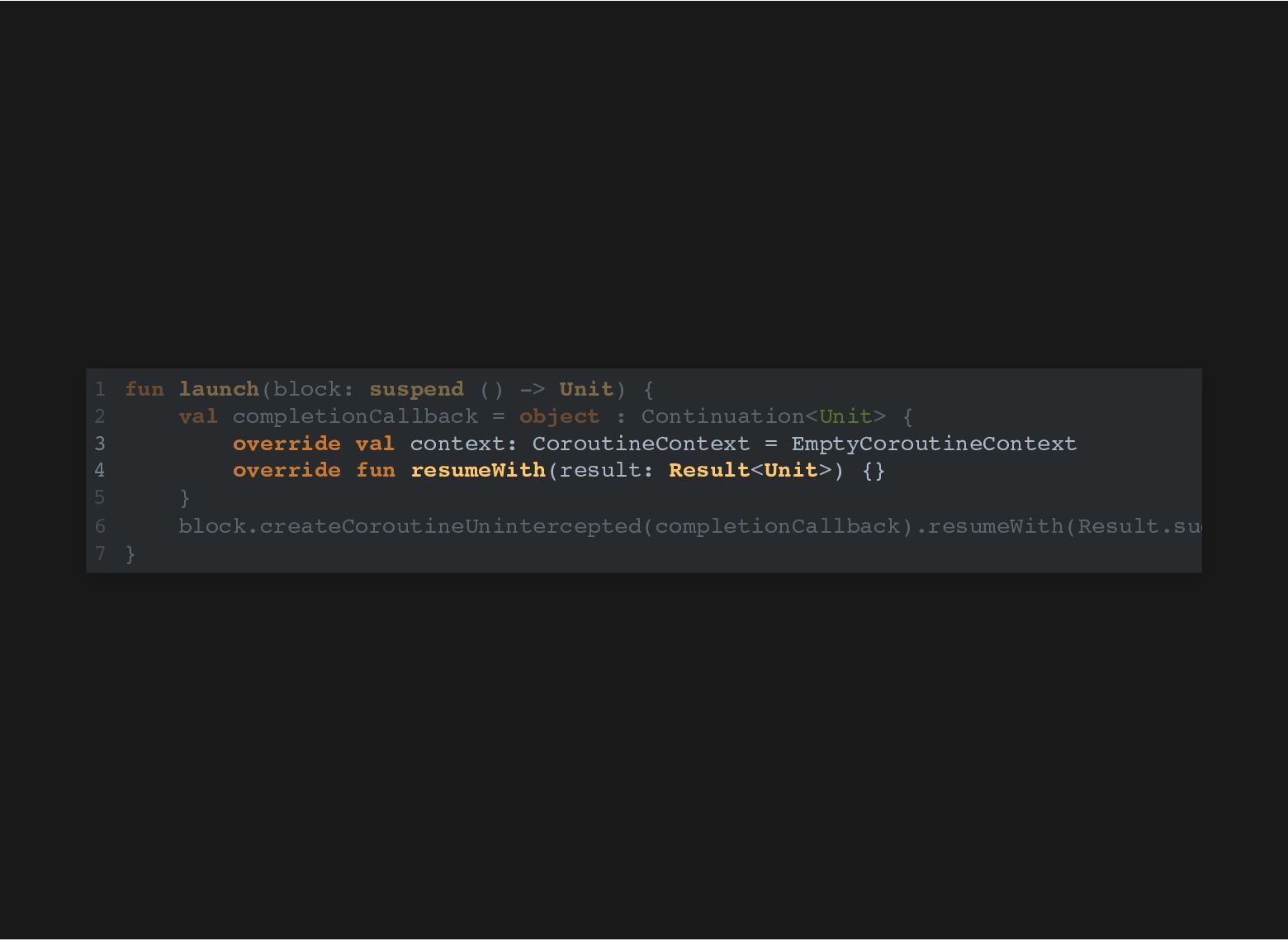 = object : Continuation<Unit>, CoroutineScope, Job { 3 init{ 4 context[Job]?.addChildren(this) 5 } 6 override val context = scopeContext + extraContext + this 7 override fun resumeWith(result: Result<Unit>) { 8 context[Job]?.waitForChildren() 9 } 10 } 11 12 val continuation = block.createCoroutineUnintercepted(completionCallback,complet 13 14 DispatchedContinuation(dispatcher,continuation).resumeWith(Result.success(Unit)) 15 } 16 val completionCallback = object : Continuation<Unit>, CoroutineScope, Job { fun CoroutineScope.launch(extraContext: CoroutineContext, block: suspend CoroutineSc 1 2 3 init{ 4 context[Job]?.addChildren(this) 5 } 6 override val context = scopeContext + extraContext + this 7 override fun resumeWith(result: Result<Unit>) { 8 context[Job]?.waitForChildren() 9 } 10 } 11 12 val continuation = block.createCoroutineUnintercepted(completionCallback,complet 13 14 DispatchedContinuation(dispatcher,continuation).resumeWith(Result.success(Unit)) 15 } 16 init{ context[Job]?.addChildren(this) } fun CoroutineScope.launch(extraContext: CoroutineContext, block: suspend CoroutineSc 1 2 val completionCallback = object : Continuation<Unit>, CoroutineScope, Job { 3 4 5 6 override val context = scopeContext + extraContext + this 7 override fun resumeWith(result: Result<Unit>) { 8 context[Job]?.waitForChildren() 9 } 10 } 11 12 val continuation = block.createCoroutineUnintercepted(completionCallback,complet 13 14 DispatchedContinuation(dispatcher,continuation).resumeWith(Result.success(Unit)) 15 } 16 context[Job]?.waitForChildren() fun CoroutineScope.launch(extraContext: CoroutineContext, block: suspend CoroutineSc 1 2 val completionCallback = object : Continuation<Unit>, CoroutineScope, Job { 3 init{ 4 context[Job]?.addChildren(this) 5 } 6 override val context = scopeContext + extraContext + this 7 override fun resumeWith(result: Result<Unit>) { 8 9 } 10 } 11 12 val continuation = block.createCoroutineUnintercepted(completionCallback,complet 13 14 DispatchedContinuation(dispatcher,continuation).resumeWith(Result.success(Unit)) 15 } 16 fun CoroutineScope.launch(extraContext: CoroutineContext, block: suspend CoroutineSc val completionCallback = object : Continuation<Unit>, CoroutineScope, Job { init{ context[Job]?.addChildren(this) } override val context = scopeContext + extraContext + this override fun resumeWith(result: Result<Unit>) { context[Job]?.waitForChildren() } } val continuation = block.createCoroutineUnintercepted(completionCallback,complet DispatchedContinuation(dispatcher,continuation).resumeWith(Result.success(Unit)) } 1 2 3 4 5 6 7 8 9 10 11 12 13 14 15 16