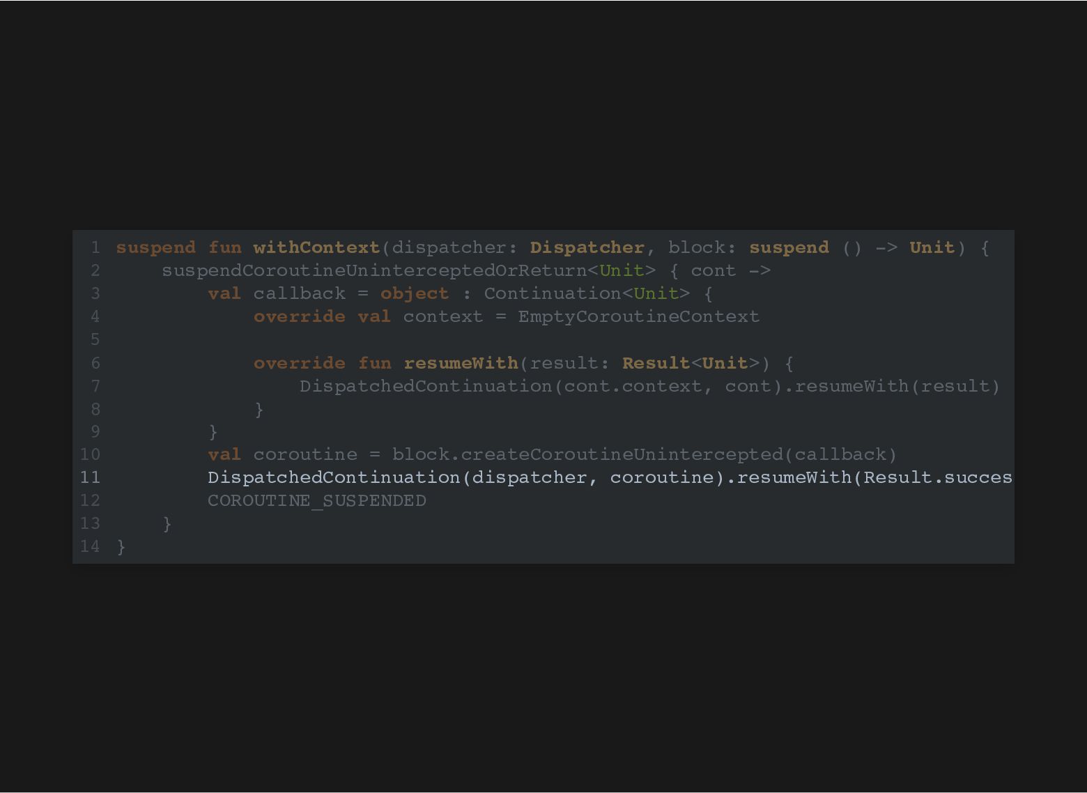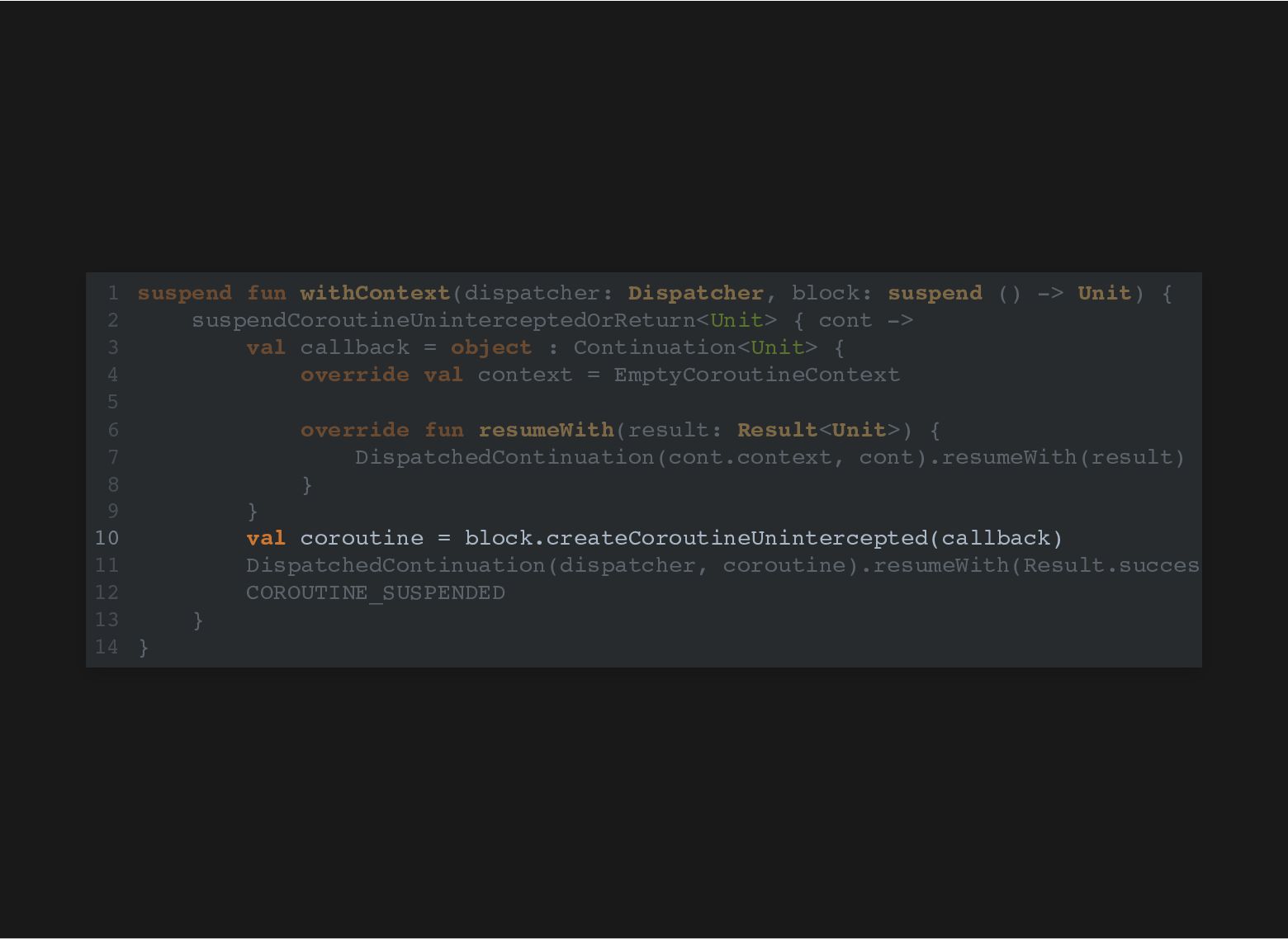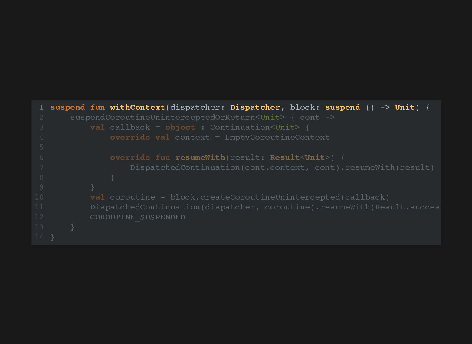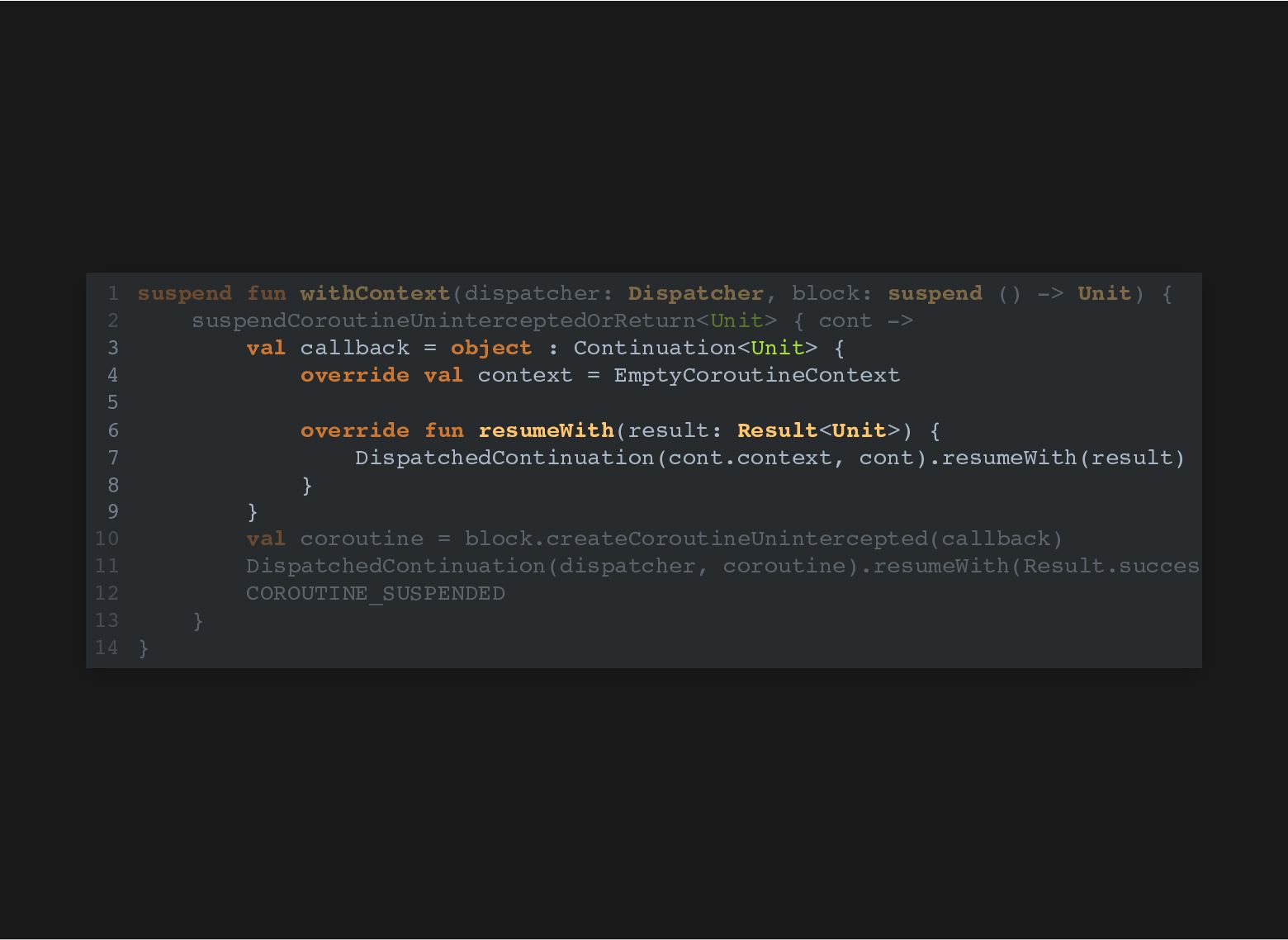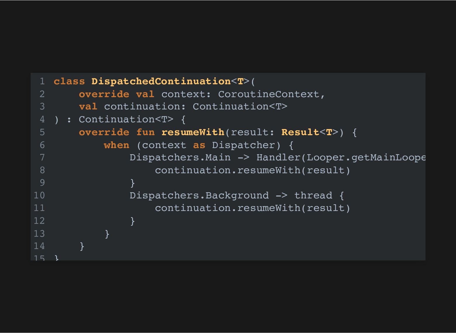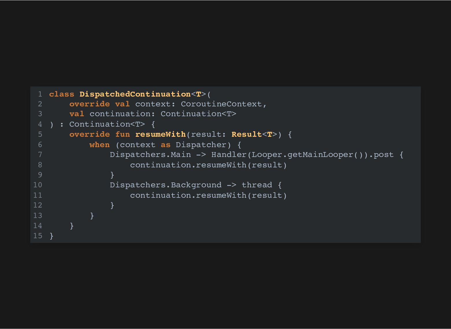 = object : Continuation<Unit>, CoroutineScope, Job { 3 init{ 4 context[Job]?.addChildren(this) 5 } 6 override val context = scopeContext + extraContext + this 7 override fun resumeWith(result: Result<Unit>) { 8 context[Job]?.waitForChildren() 9 } 10 } 11 12 val continuation = block.createCoroutineUnintercepted(completionCallback,complet 13 14 DispatchedContinuation(dispatcher,continuation).resumeWith(Result.success(Unit)) 15 } 16 val completionCallback = object : Continuation<Unit>, CoroutineScope, Job { fun CoroutineScope.launch(extraContext: CoroutineContext, block: suspend CoroutineSc 1 2 3 init{ 4 context[Job]?.addChildren(this) 5 } 6 override val context = scopeContext + extraContext + this 7 override fun resumeWith(result: Result<Unit>) { 8 context[Job]?.waitForChildren() 9 } 10 } 11 12 val continuation = block.createCoroutineUnintercepted(completionCallback,complet 13 14 DispatchedContinuation(dispatcher,continuation).resumeWith(Result.success(Unit)) 15 } 16 init{ context[Job]?.addChildren(this) } fun CoroutineScope.launch(extraContext: CoroutineContext, block: suspend CoroutineSc 1 2 val completionCallback = object : Continuation<Unit>, CoroutineScope, Job { 3 4 5 6 override val context = scopeContext + extraContext + this 7 override fun resumeWith(result: Result<Unit>) { 8 context[Job]?.waitForChildren() 9 } 10 } 11 12 val continuation = block.createCoroutineUnintercepted(completionCallback,complet 13 14 DispatchedContinuation(dispatcher,continuation).resumeWith(Result.success(Unit)) 15 } 16 context[Job]?.waitForChildren() fun CoroutineScope.launch(extraContext: CoroutineContext, block: suspend CoroutineSc 1 2 val completionCallback = object : Continuation<Unit>, CoroutineScope, Job { 3 init{ 4 context[Job]?.addChildren(this) 5 } 6 override val context = scopeContext + extraContext + this 7 override fun resumeWith(result: Result<Unit>) { 8 9 } 10 } 11 12 val continuation = block.createCoroutineUnintercepted(completionCallback,complet 13 14 DispatchedContinuation(dispatcher,continuation).resumeWith(Result.success(Unit)) 15 } 16 fun CoroutineScope.launch(extraContext: CoroutineContext, block: suspend CoroutineSc val completionCallback = object : Continuation<Unit>, CoroutineScope, Job { init{ context[Job]?.addChildren(this) } override val context = scopeContext + extraContext + this override fun resumeWith(result: Result<Unit>) { context[Job]?.waitForChildren() } } val continuation = block.createCoroutineUnintercepted(completionCallback,complet DispatchedContinuation(dispatcher,continuation).resumeWith(Result.success(Unit)) } 1 2 3 4 5 6 7 8 9 10 11 12 13 14 15 16
