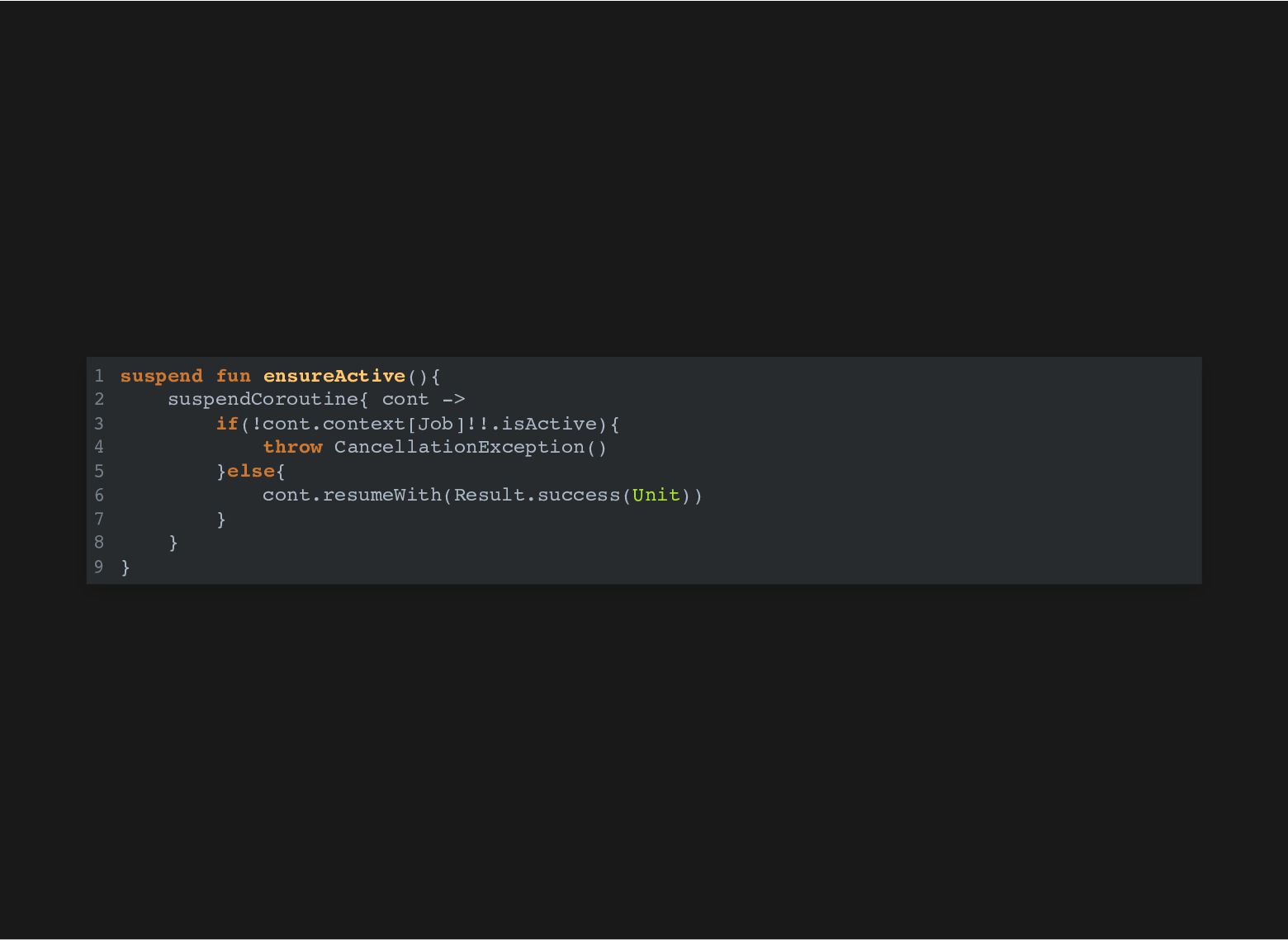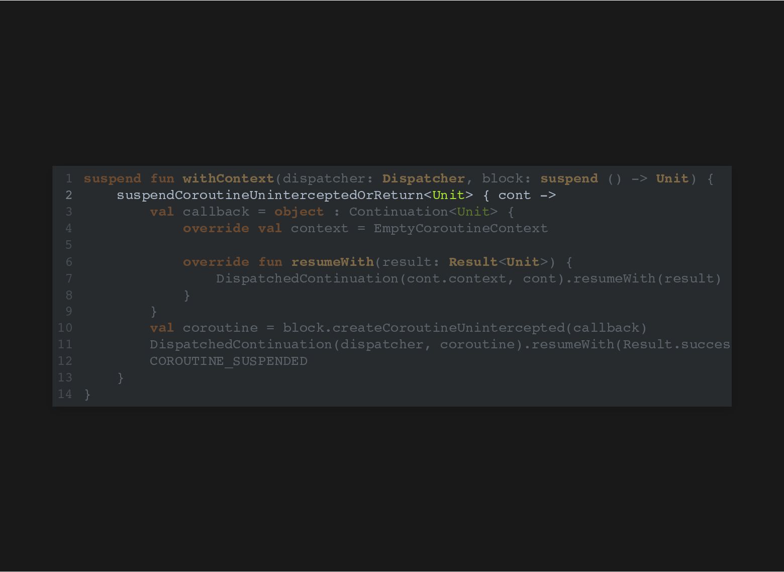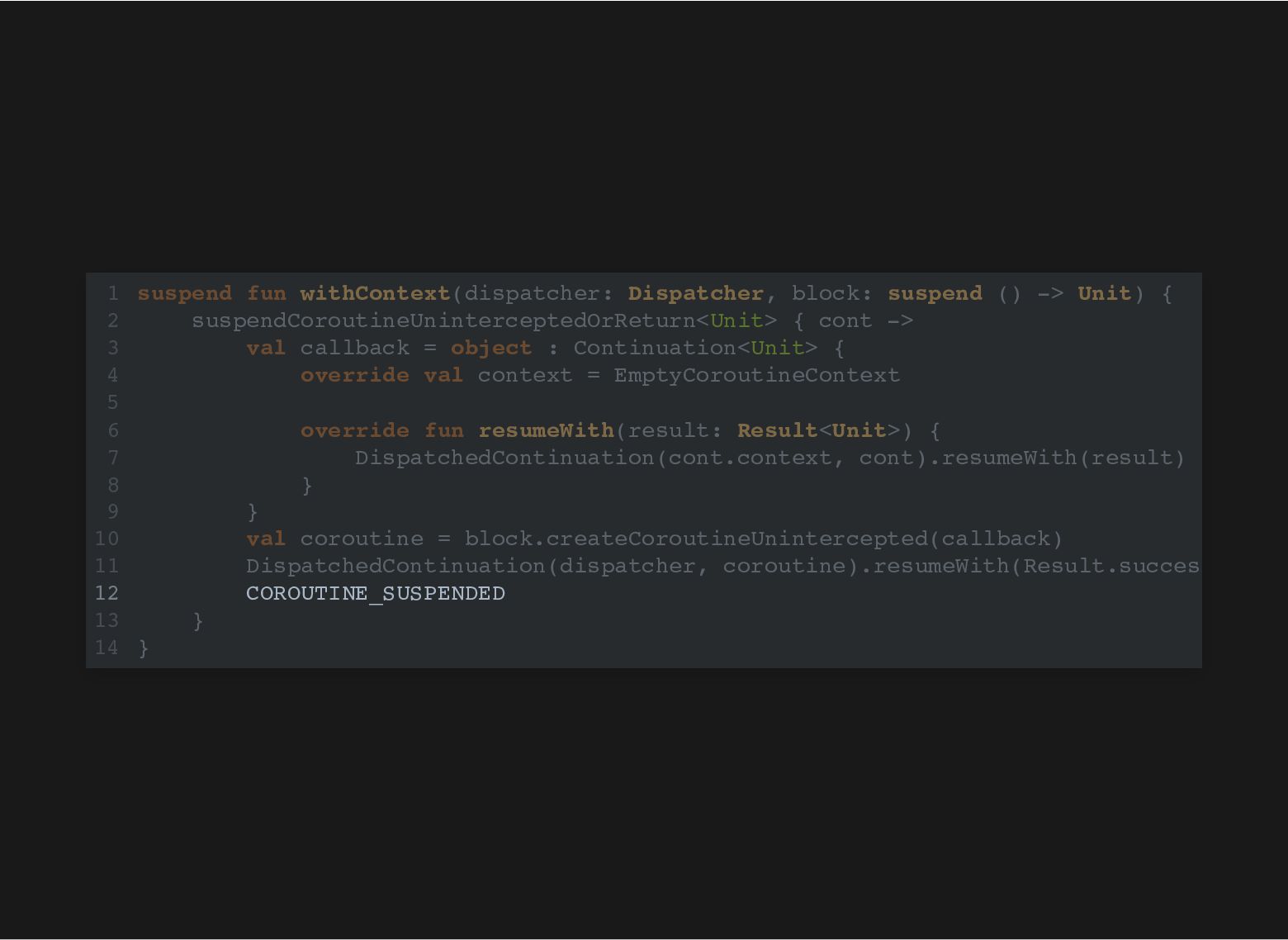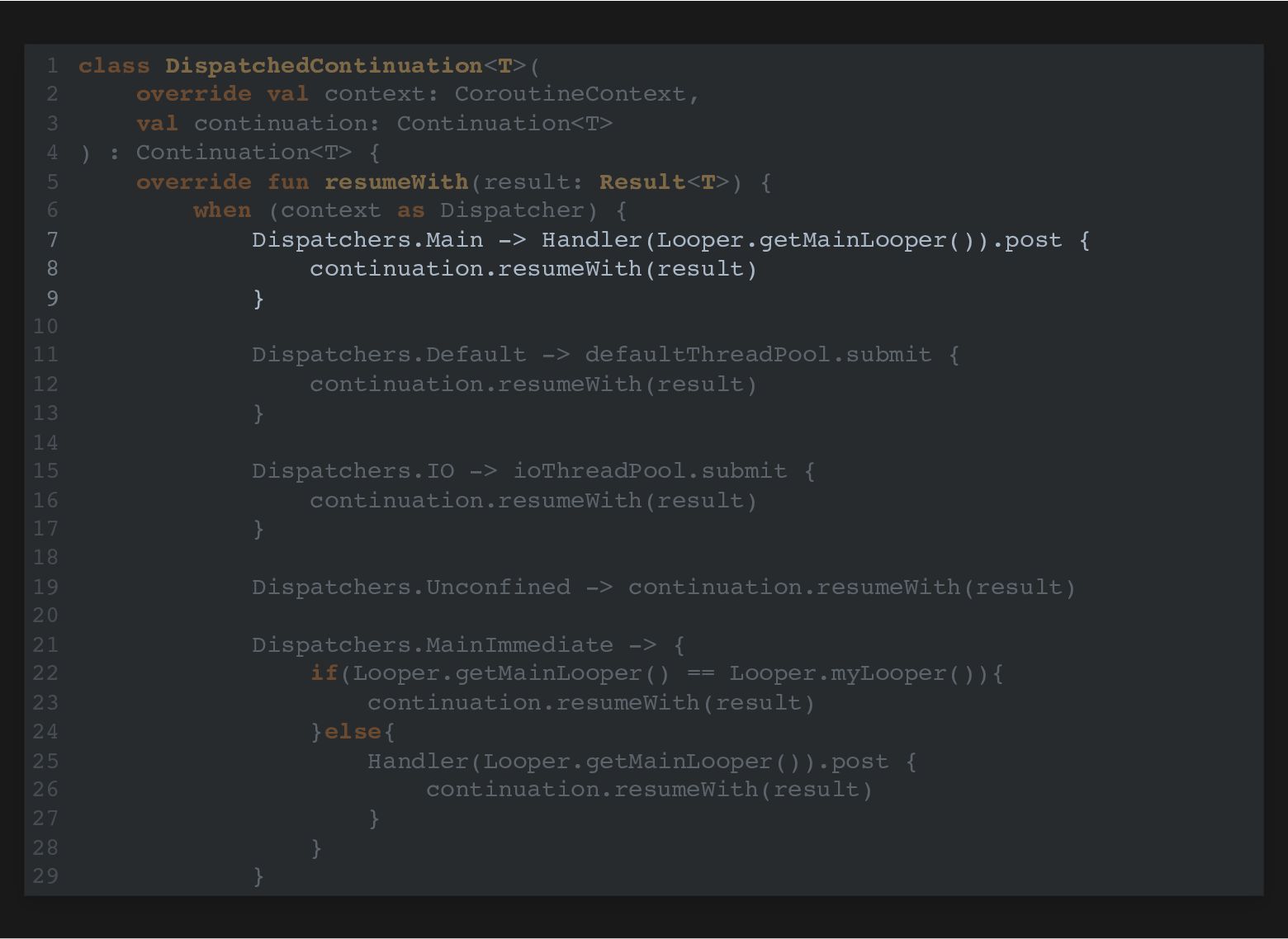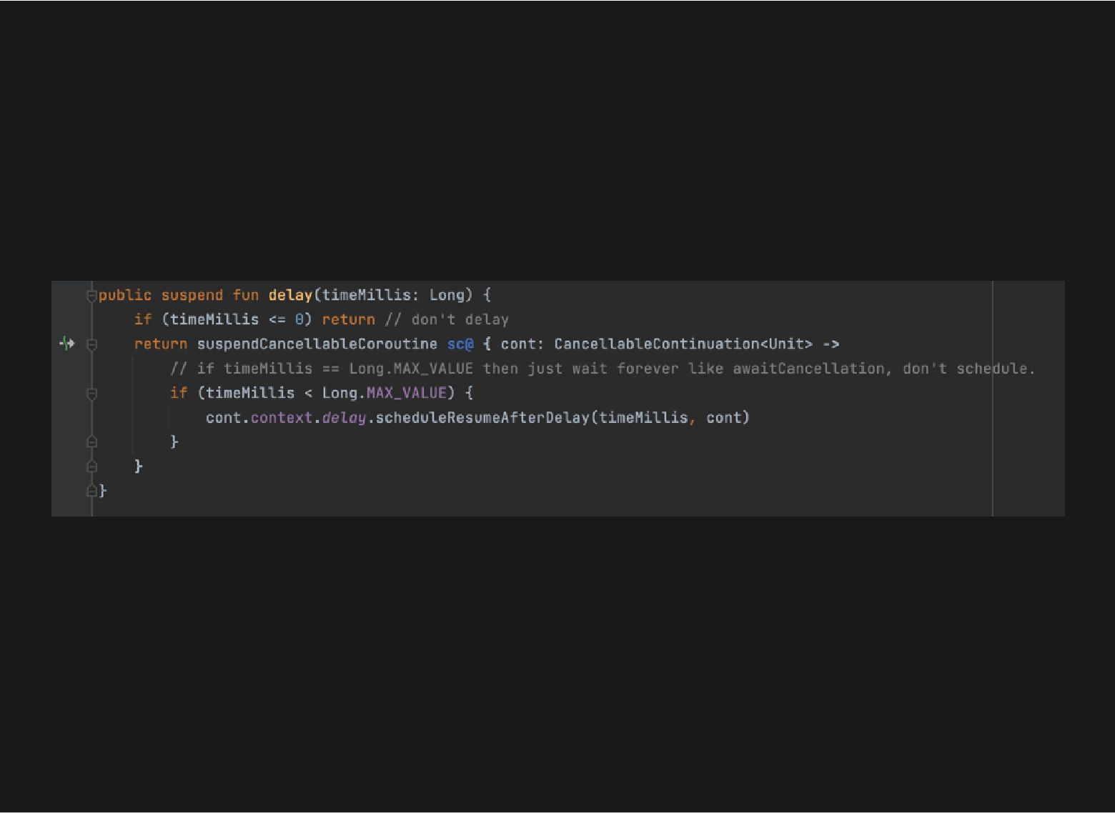 = object : Continuation<Unit>, CoroutineScope, Job { 3 init{ 4 context[Job]?.addChildren(this) 5 } 6 override val context = scopeContext + extraContext + this 7 override fun resumeWith(result: Result<Unit>) { 8 context[Job]?.waitForChildren() 9 } 10 } 11 12 val continuation = block.createCoroutineUnintercepted(completionCallback,complet 13 14 DispatchedContinuation(dispatcher,continuation).resumeWith(Result.success(Unit)) 15 } 16 val completionCallback = object : Continuation<Unit>, CoroutineScope, Job { fun CoroutineScope.launch(extraContext: CoroutineContext, block: suspend CoroutineSc 1 2 3 init{ 4 context[Job]?.addChildren(this) 5 } 6 override val context = scopeContext + extraContext + this 7 override fun resumeWith(result: Result<Unit>) { 8 context[Job]?.waitForChildren() 9 } 10 } 11 12 val continuation = block.createCoroutineUnintercepted(completionCallback,complet 13 14 DispatchedContinuation(dispatcher,continuation).resumeWith(Result.success(Unit)) 15 } 16 init{ context[Job]?.addChildren(this) } fun CoroutineScope.launch(extraContext: CoroutineContext, block: suspend CoroutineSc 1 2 val completionCallback = object : Continuation<Unit>, CoroutineScope, Job { 3 4 5 6 override val context = scopeContext + extraContext + this 7 override fun resumeWith(result: Result<Unit>) { 8 context[Job]?.waitForChildren() 9 } 10 } 11 12 val continuation = block.createCoroutineUnintercepted(completionCallback,complet 13 14 DispatchedContinuation(dispatcher,continuation).resumeWith(Result.success(Unit)) 15 } 16 context[Job]?.waitForChildren() fun CoroutineScope.launch(extraContext: CoroutineContext, block: suspend CoroutineSc 1 2 val completionCallback = object : Continuation<Unit>, CoroutineScope, Job { 3 init{ 4 context[Job]?.addChildren(this) 5 } 6 override val context = scopeContext + extraContext + this 7 override fun resumeWith(result: Result<Unit>) { 8 9 } 10 } 11 12 val continuation = block.createCoroutineUnintercepted(completionCallback,complet 13 14 DispatchedContinuation(dispatcher,continuation).resumeWith(Result.success(Unit)) 15 } 16 fun CoroutineScope.launch(extraContext: CoroutineContext, block: suspend CoroutineSc val completionCallback = object : Continuation<Unit>, CoroutineScope, Job { init{ context[Job]?.addChildren(this) } override val context = scopeContext + extraContext + this override fun resumeWith(result: Result<Unit>) { context[Job]?.waitForChildren() } } val continuation = block.createCoroutineUnintercepted(completionCallback,complet DispatchedContinuation(dispatcher,continuation).resumeWith(Result.success(Unit)) } 1 2 3 4 5 6 7 8 9 10 11 12 13 14 15 16