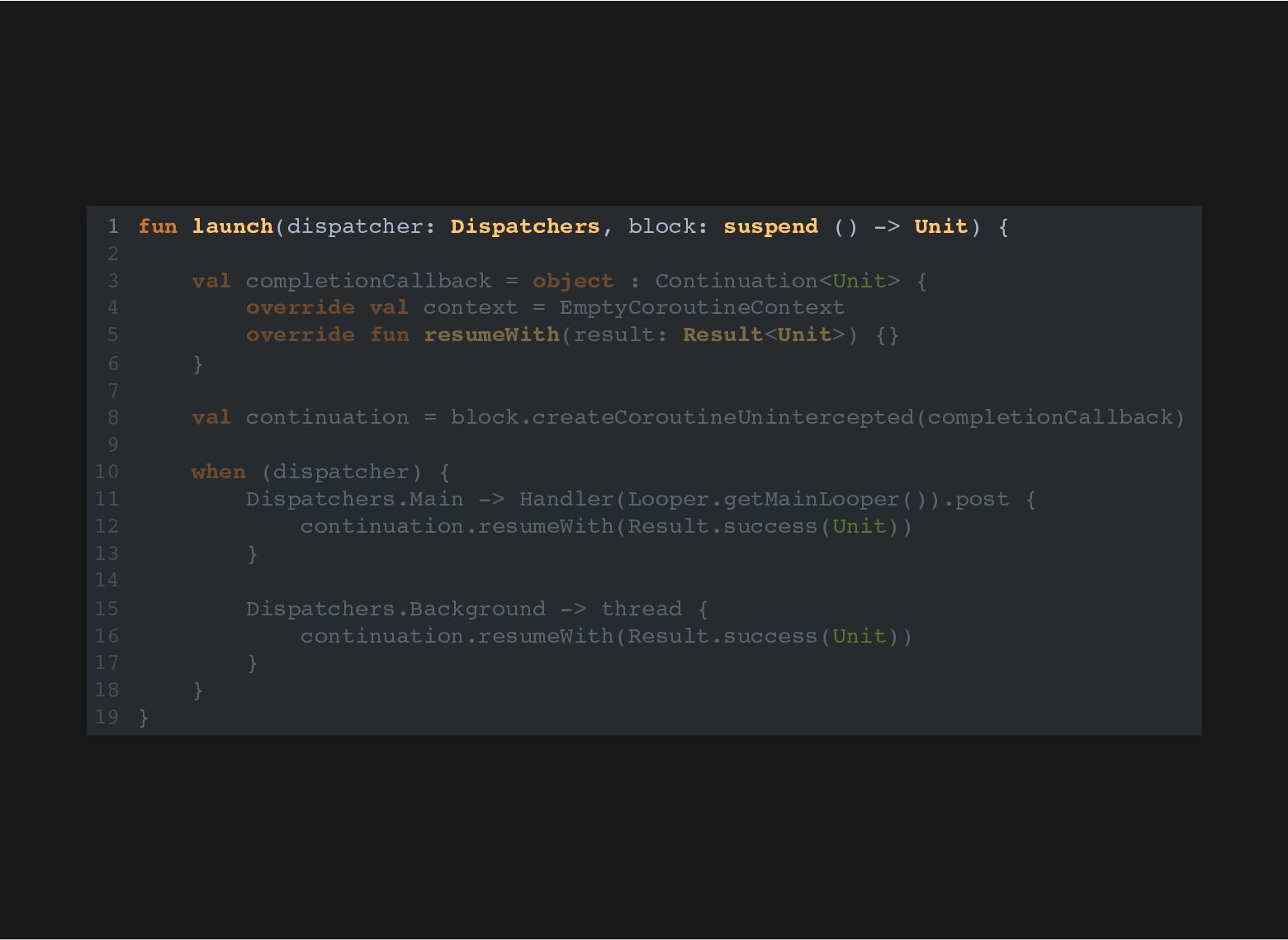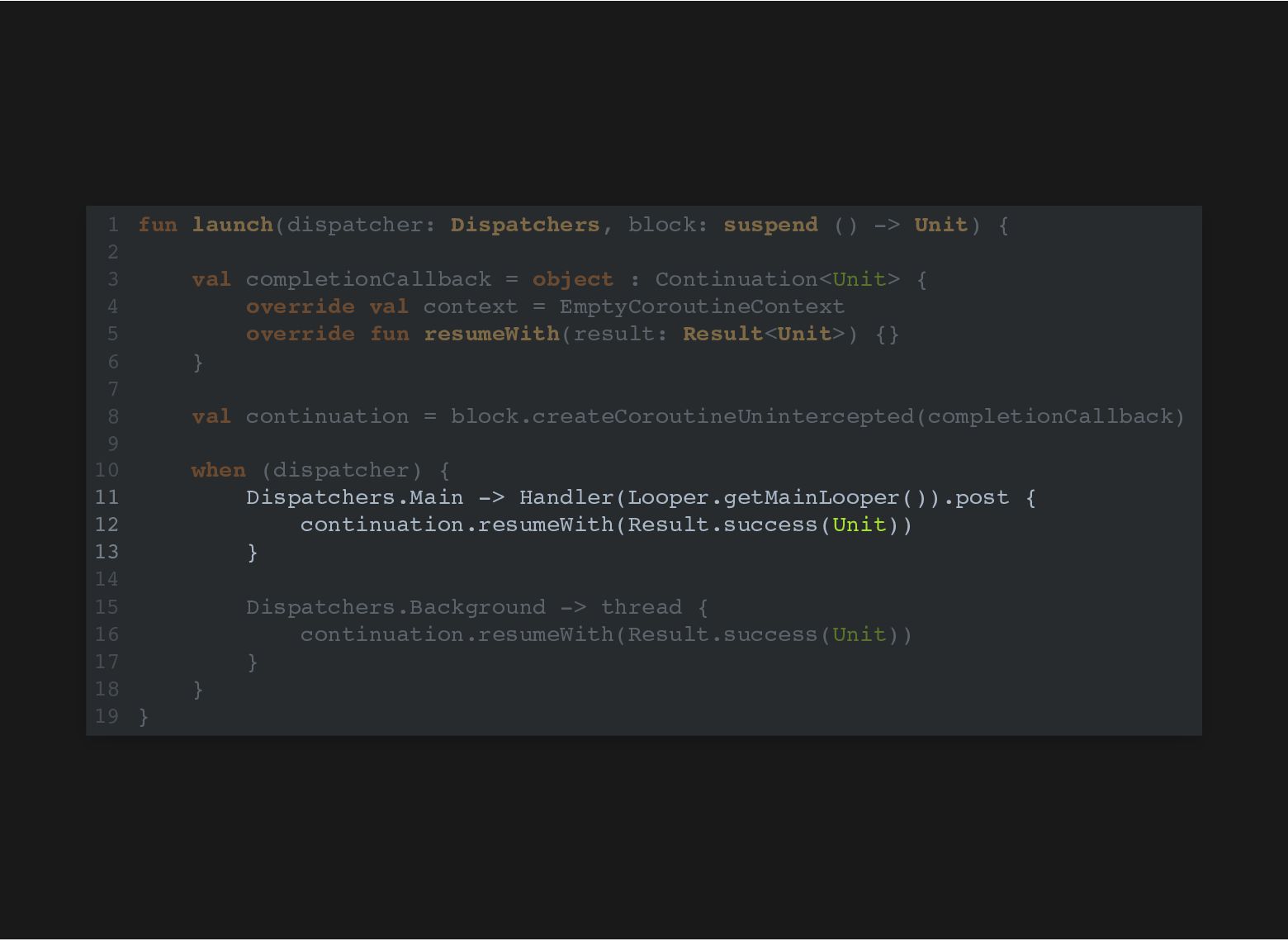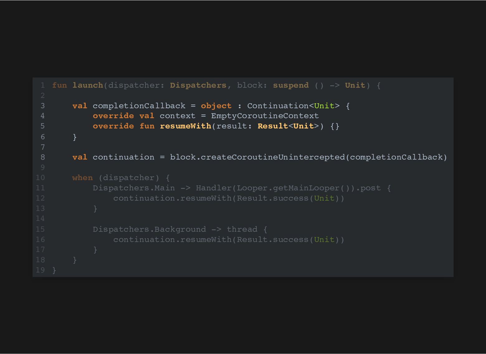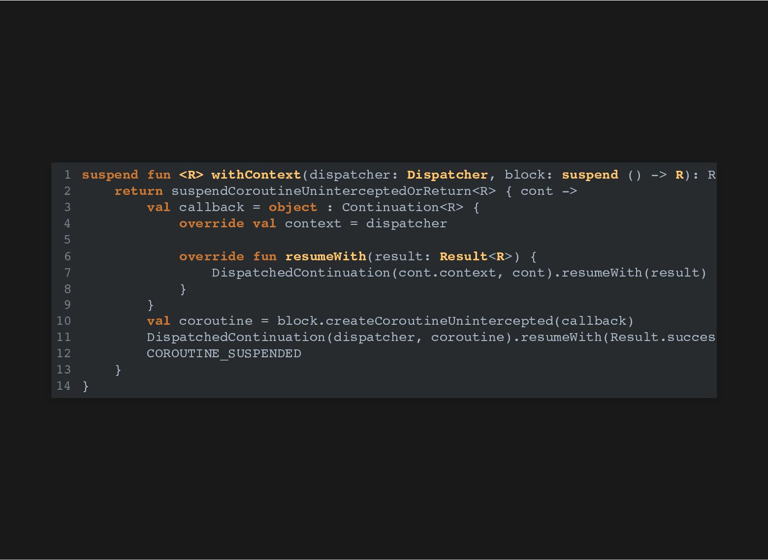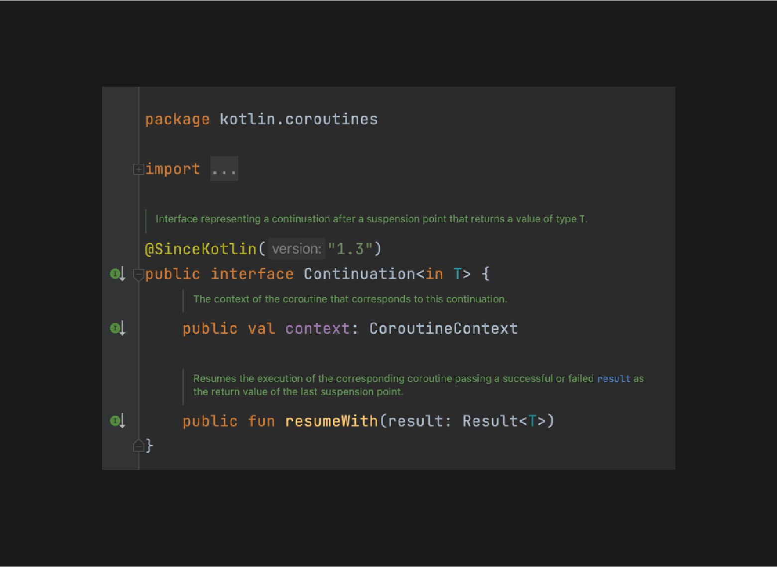 = object : Continuation<Unit>, CoroutineScope, Job { 3 init{ 4 context[Job]?.addChildren(this) 5 } 6 override val context = scopeContext + extraContext + this 7 override fun resumeWith(result: Result<Unit>) { 8 context[Job]?.waitForChildren() 9 } 10 } 11 12 val continuation = block.createCoroutineUnintercepted(completionCallback,complet 13 14 DispatchedContinuation(dispatcher,continuation).resumeWith(Result.success(Unit)) 15 } 16 val completionCallback = object : Continuation<Unit>, CoroutineScope, Job { fun CoroutineScope.launch(extraContext: CoroutineContext, block: suspend CoroutineSc 1 2 3 init{ 4 context[Job]?.addChildren(this) 5 } 6 override val context = scopeContext + extraContext + this 7 override fun resumeWith(result: Result<Unit>) { 8 context[Job]?.waitForChildren() 9 } 10 } 11 12 val continuation = block.createCoroutineUnintercepted(completionCallback,complet 13 14 DispatchedContinuation(dispatcher,continuation).resumeWith(Result.success(Unit)) 15 } 16 init{ context[Job]?.addChildren(this) } fun CoroutineScope.launch(extraContext: CoroutineContext, block: suspend CoroutineSc 1 2 val completionCallback = object : Continuation<Unit>, CoroutineScope, Job { 3 4 5 6 override val context = scopeContext + extraContext + this 7 override fun resumeWith(result: Result<Unit>) { 8 context[Job]?.waitForChildren() 9 } 10 } 11 12 val continuation = block.createCoroutineUnintercepted(completionCallback,complet 13 14 DispatchedContinuation(dispatcher,continuation).resumeWith(Result.success(Unit)) 15 } 16 context[Job]?.waitForChildren() fun CoroutineScope.launch(extraContext: CoroutineContext, block: suspend CoroutineSc 1 2 val completionCallback = object : Continuation<Unit>, CoroutineScope, Job { 3 init{ 4 context[Job]?.addChildren(this) 5 } 6 override val context = scopeContext + extraContext + this 7 override fun resumeWith(result: Result<Unit>) { 8 9 } 10 } 11 12 val continuation = block.createCoroutineUnintercepted(completionCallback,complet 13 14 DispatchedContinuation(dispatcher,continuation).resumeWith(Result.success(Unit)) 15 } 16 fun CoroutineScope.launch(extraContext: CoroutineContext, block: suspend CoroutineSc val completionCallback = object : Continuation<Unit>, CoroutineScope, Job { init{ context[Job]?.addChildren(this) } override val context = scopeContext + extraContext + this override fun resumeWith(result: Result<Unit>) { context[Job]?.waitForChildren() } } val continuation = block.createCoroutineUnintercepted(completionCallback,complet DispatchedContinuation(dispatcher,continuation).resumeWith(Result.success(Unit)) } 1 2 3 4 5 6 7 8 9 10 11 12 13 14 15 16