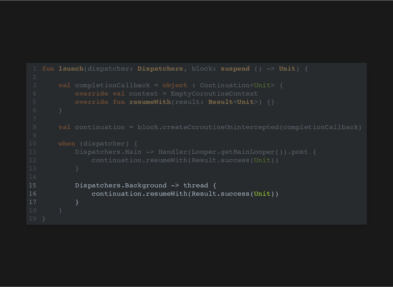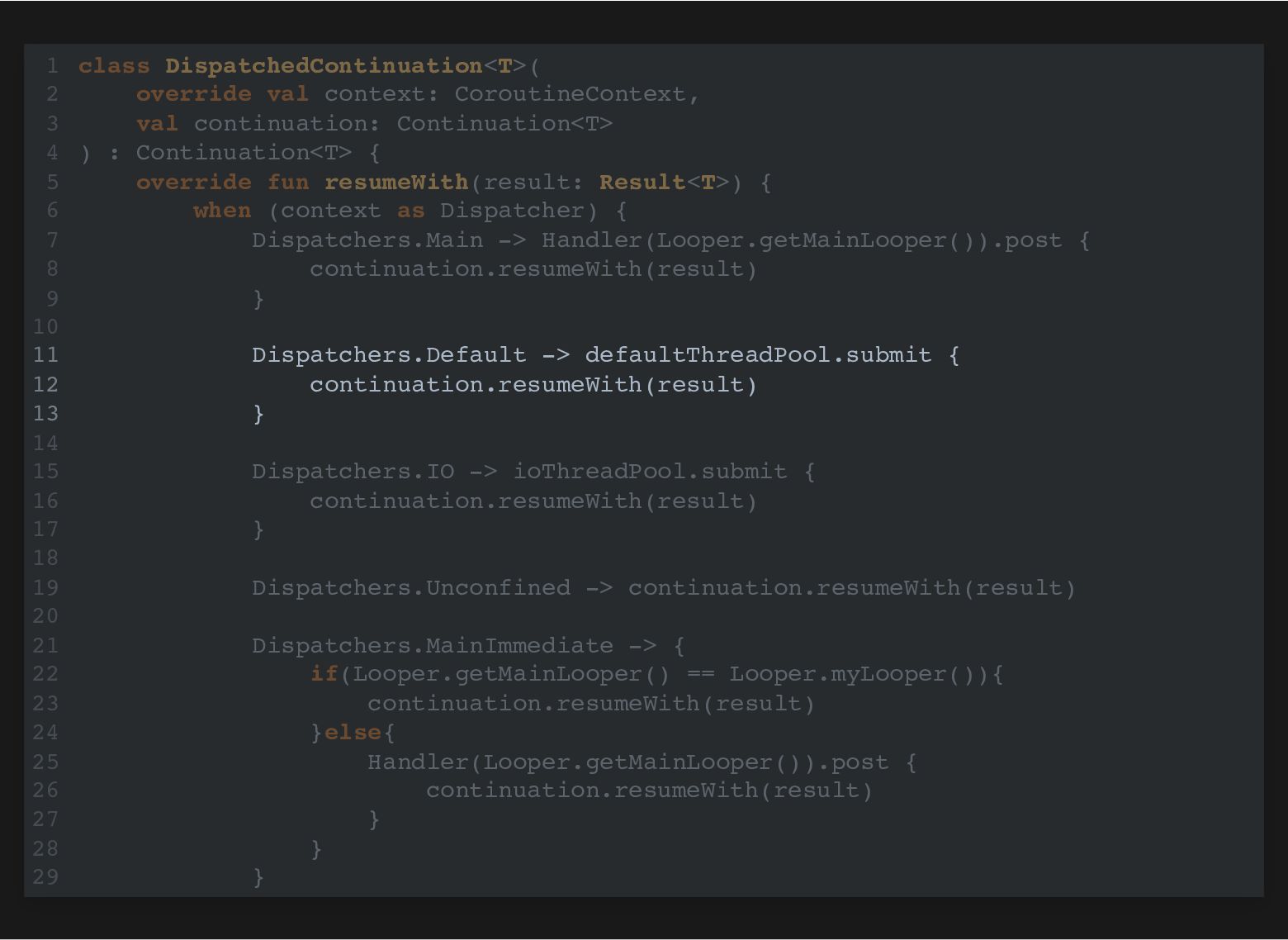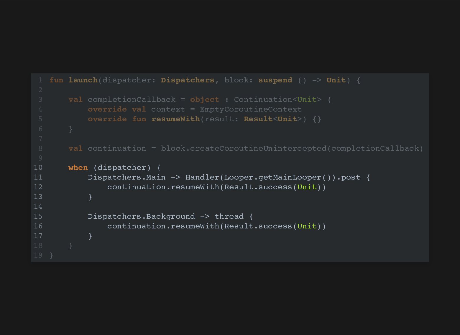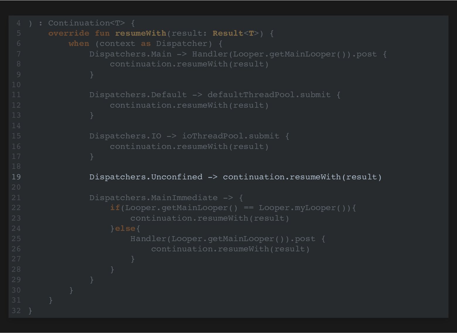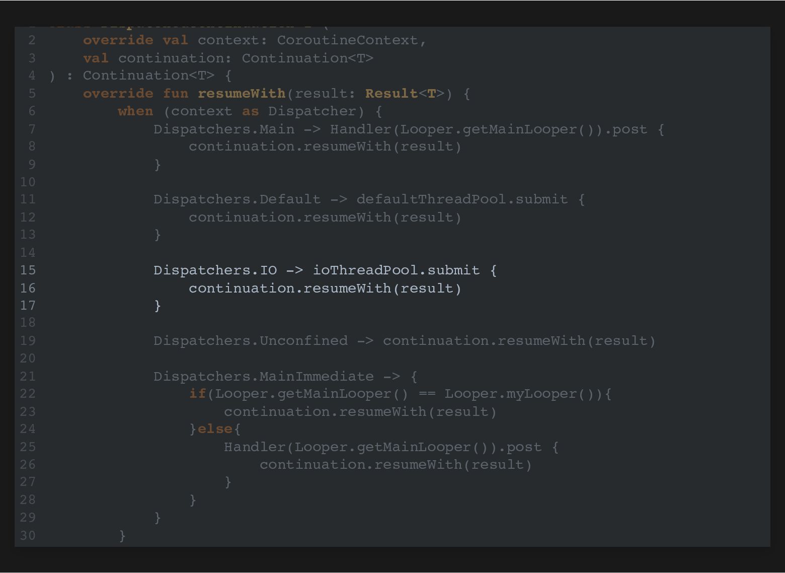 = object : Continuation<Unit>, CoroutineScope, Job { 3 init{ 4 context[Job]?.addChildren(this) 5 } 6 override val context = scopeContext + extraContext + this 7 override fun resumeWith(result: Result<Unit>) { 8 context[Job]?.waitForChildren() 9 } 10 } 11 12 val continuation = block.createCoroutineUnintercepted(completionCallback,complet 13 14 DispatchedContinuation(dispatcher,continuation).resumeWith(Result.success(Unit)) 15 } 16 val completionCallback = object : Continuation<Unit>, CoroutineScope, Job { fun CoroutineScope.launch(extraContext: CoroutineContext, block: suspend CoroutineSc 1 2 3 init{ 4 context[Job]?.addChildren(this) 5 } 6 override val context = scopeContext + extraContext + this 7 override fun resumeWith(result: Result<Unit>) { 8 context[Job]?.waitForChildren() 9 } 10 } 11 12 val continuation = block.createCoroutineUnintercepted(completionCallback,complet 13 14 DispatchedContinuation(dispatcher,continuation).resumeWith(Result.success(Unit)) 15 } 16 init{ context[Job]?.addChildren(this) } fun CoroutineScope.launch(extraContext: CoroutineContext, block: suspend CoroutineSc 1 2 val completionCallback = object : Continuation<Unit>, CoroutineScope, Job { 3 4 5 6 override val context = scopeContext + extraContext + this 7 override fun resumeWith(result: Result<Unit>) { 8 context[Job]?.waitForChildren() 9 } 10 } 11 12 val continuation = block.createCoroutineUnintercepted(completionCallback,complet 13 14 DispatchedContinuation(dispatcher,continuation).resumeWith(Result.success(Unit)) 15 } 16 context[Job]?.waitForChildren() fun CoroutineScope.launch(extraContext: CoroutineContext, block: suspend CoroutineSc 1 2 val completionCallback = object : Continuation<Unit>, CoroutineScope, Job { 3 init{ 4 context[Job]?.addChildren(this) 5 } 6 override val context = scopeContext + extraContext + this 7 override fun resumeWith(result: Result<Unit>) { 8 9 } 10 } 11 12 val continuation = block.createCoroutineUnintercepted(completionCallback,complet 13 14 DispatchedContinuation(dispatcher,continuation).resumeWith(Result.success(Unit)) 15 } 16 fun CoroutineScope.launch(extraContext: CoroutineContext, block: suspend CoroutineSc val completionCallback = object : Continuation<Unit>, CoroutineScope, Job { init{ context[Job]?.addChildren(this) } override val context = scopeContext + extraContext + this override fun resumeWith(result: Result<Unit>) { context[Job]?.waitForChildren() } } val continuation = block.createCoroutineUnintercepted(completionCallback,complet DispatchedContinuation(dispatcher,continuation).resumeWith(Result.success(Unit)) } 1 2 3 4 5 6 7 8 9 10 11 12 13 14 15 16
