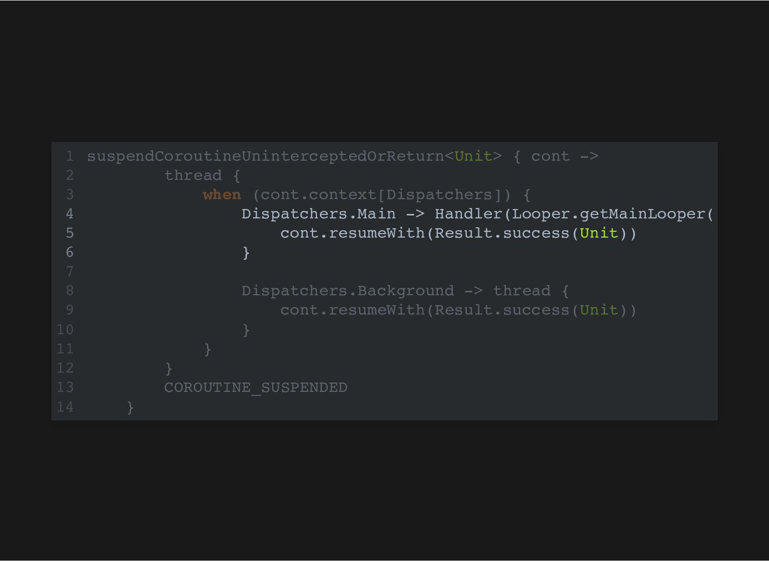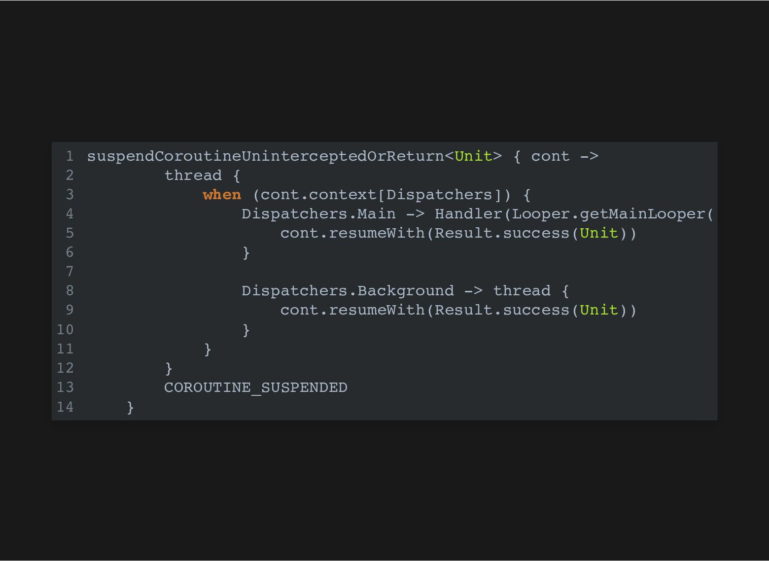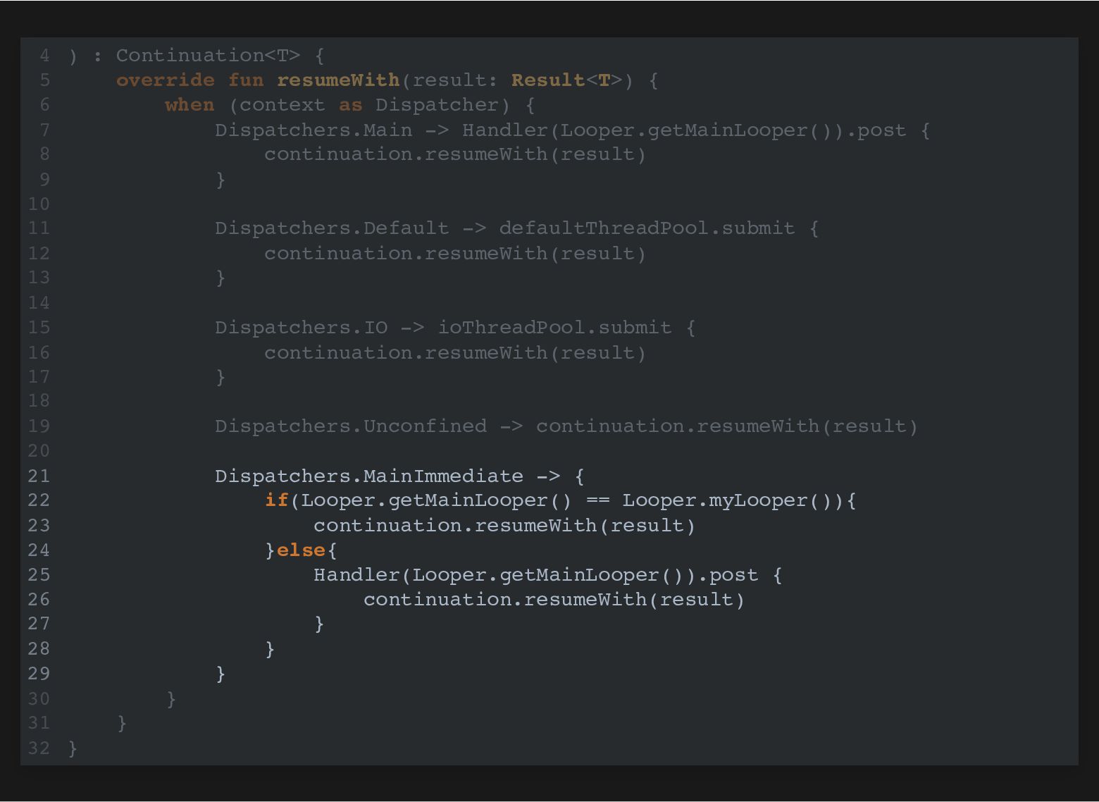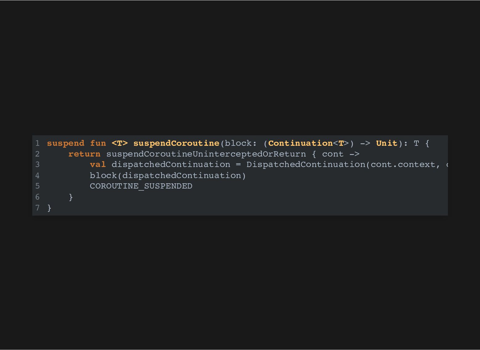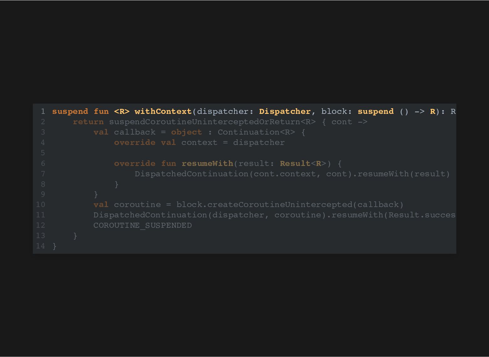 = object : Continuation<Unit>, CoroutineScope, Job { 3 init{ 4 context[Job]?.addChildren(this) 5 } 6 override val context = scopeContext + extraContext + this 7 override fun resumeWith(result: Result<Unit>) { 8 context[Job]?.waitForChildren() 9 } 10 } 11 12 val continuation = block.createCoroutineUnintercepted(completionCallback,complet 13 14 DispatchedContinuation(dispatcher,continuation).resumeWith(Result.success(Unit)) 15 } 16 val completionCallback = object : Continuation<Unit>, CoroutineScope, Job { fun CoroutineScope.launch(extraContext: CoroutineContext, block: suspend CoroutineSc 1 2 3 init{ 4 context[Job]?.addChildren(this) 5 } 6 override val context = scopeContext + extraContext + this 7 override fun resumeWith(result: Result<Unit>) { 8 context[Job]?.waitForChildren() 9 } 10 } 11 12 val continuation = block.createCoroutineUnintercepted(completionCallback,complet 13 14 DispatchedContinuation(dispatcher,continuation).resumeWith(Result.success(Unit)) 15 } 16 init{ context[Job]?.addChildren(this) } fun CoroutineScope.launch(extraContext: CoroutineContext, block: suspend CoroutineSc 1 2 val completionCallback = object : Continuation<Unit>, CoroutineScope, Job { 3 4 5 6 override val context = scopeContext + extraContext + this 7 override fun resumeWith(result: Result<Unit>) { 8 context[Job]?.waitForChildren() 9 } 10 } 11 12 val continuation = block.createCoroutineUnintercepted(completionCallback,complet 13 14 DispatchedContinuation(dispatcher,continuation).resumeWith(Result.success(Unit)) 15 } 16 context[Job]?.waitForChildren() fun CoroutineScope.launch(extraContext: CoroutineContext, block: suspend CoroutineSc 1 2 val completionCallback = object : Continuation<Unit>, CoroutineScope, Job { 3 init{ 4 context[Job]?.addChildren(this) 5 } 6 override val context = scopeContext + extraContext + this 7 override fun resumeWith(result: Result<Unit>) { 8 9 } 10 } 11 12 val continuation = block.createCoroutineUnintercepted(completionCallback,complet 13 14 DispatchedContinuation(dispatcher,continuation).resumeWith(Result.success(Unit)) 15 } 16 fun CoroutineScope.launch(extraContext: CoroutineContext, block: suspend CoroutineSc val completionCallback = object : Continuation<Unit>, CoroutineScope, Job { init{ context[Job]?.addChildren(this) } override val context = scopeContext + extraContext + this override fun resumeWith(result: Result<Unit>) { context[Job]?.waitForChildren() } } val continuation = block.createCoroutineUnintercepted(completionCallback,complet DispatchedContinuation(dispatcher,continuation).resumeWith(Result.success(Unit)) } 1 2 3 4 5 6 7 8 9 10 11 12 13 14 15 16