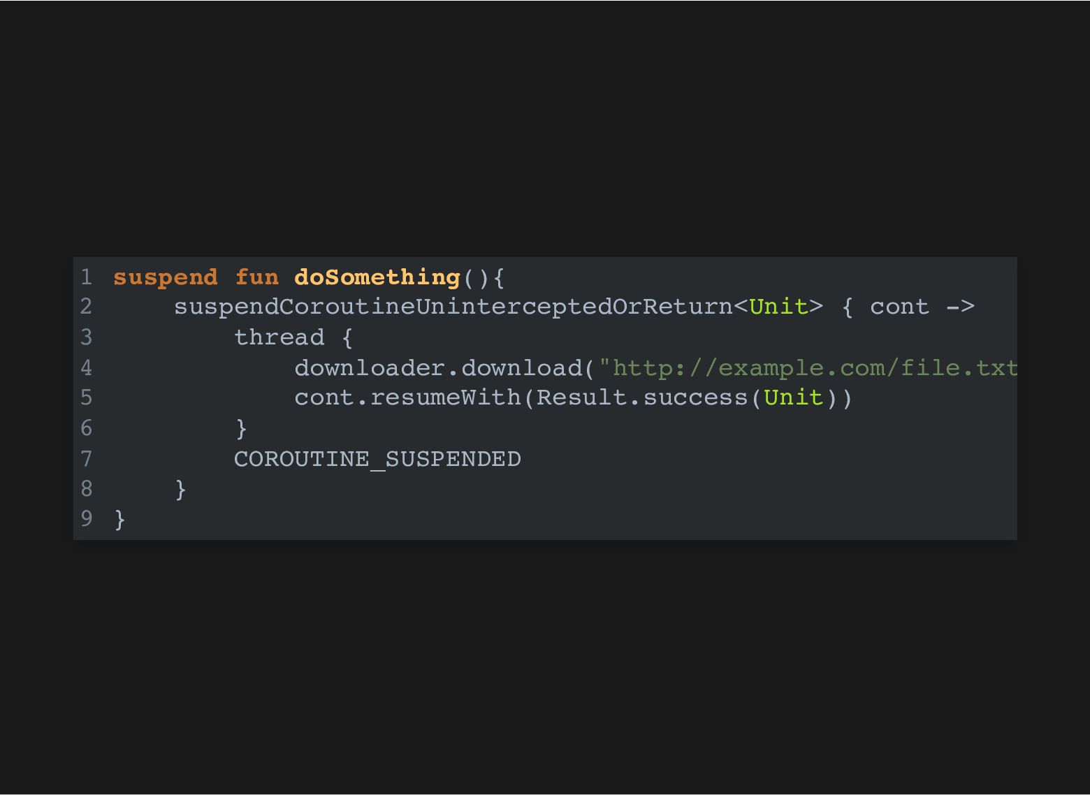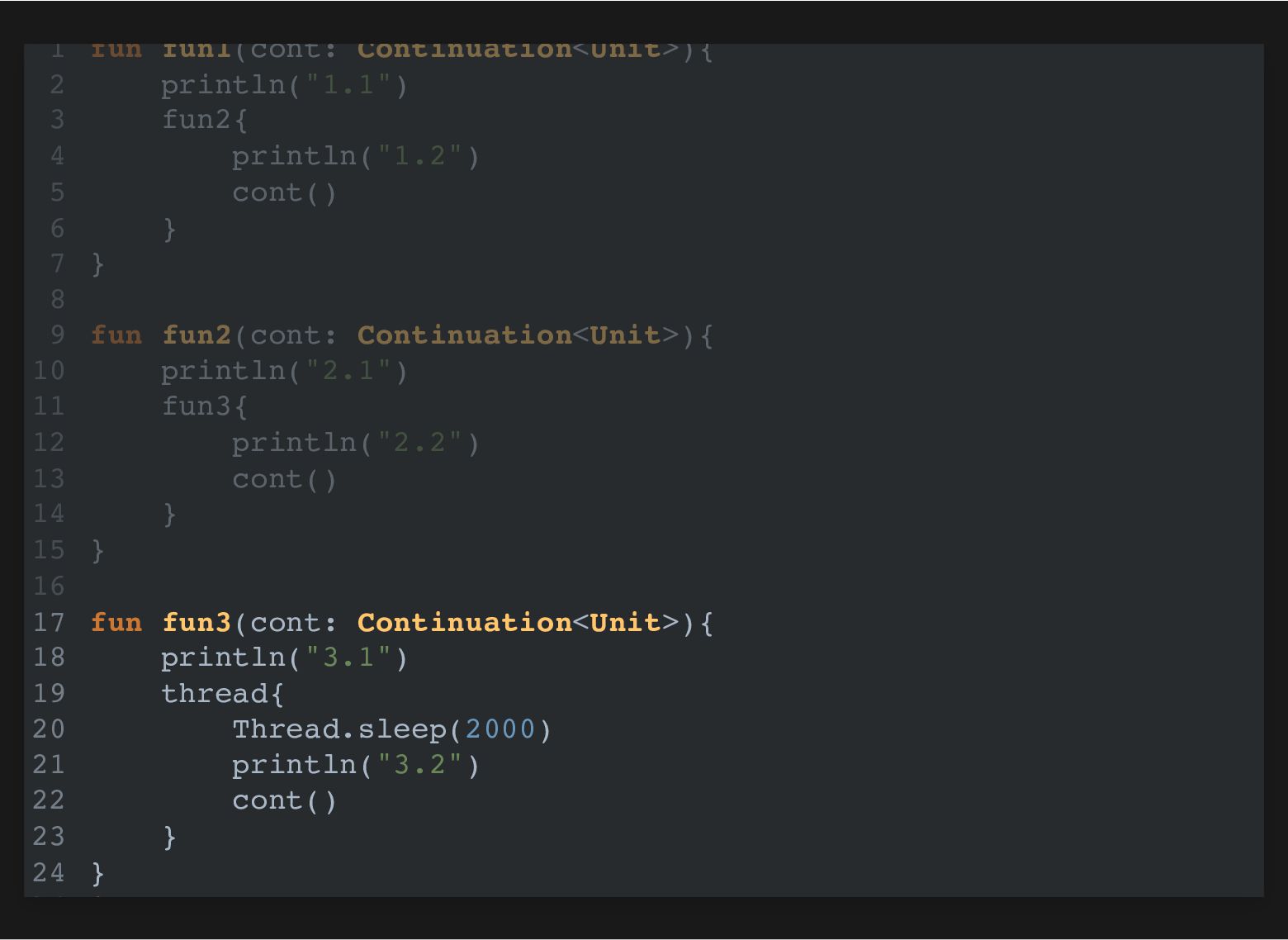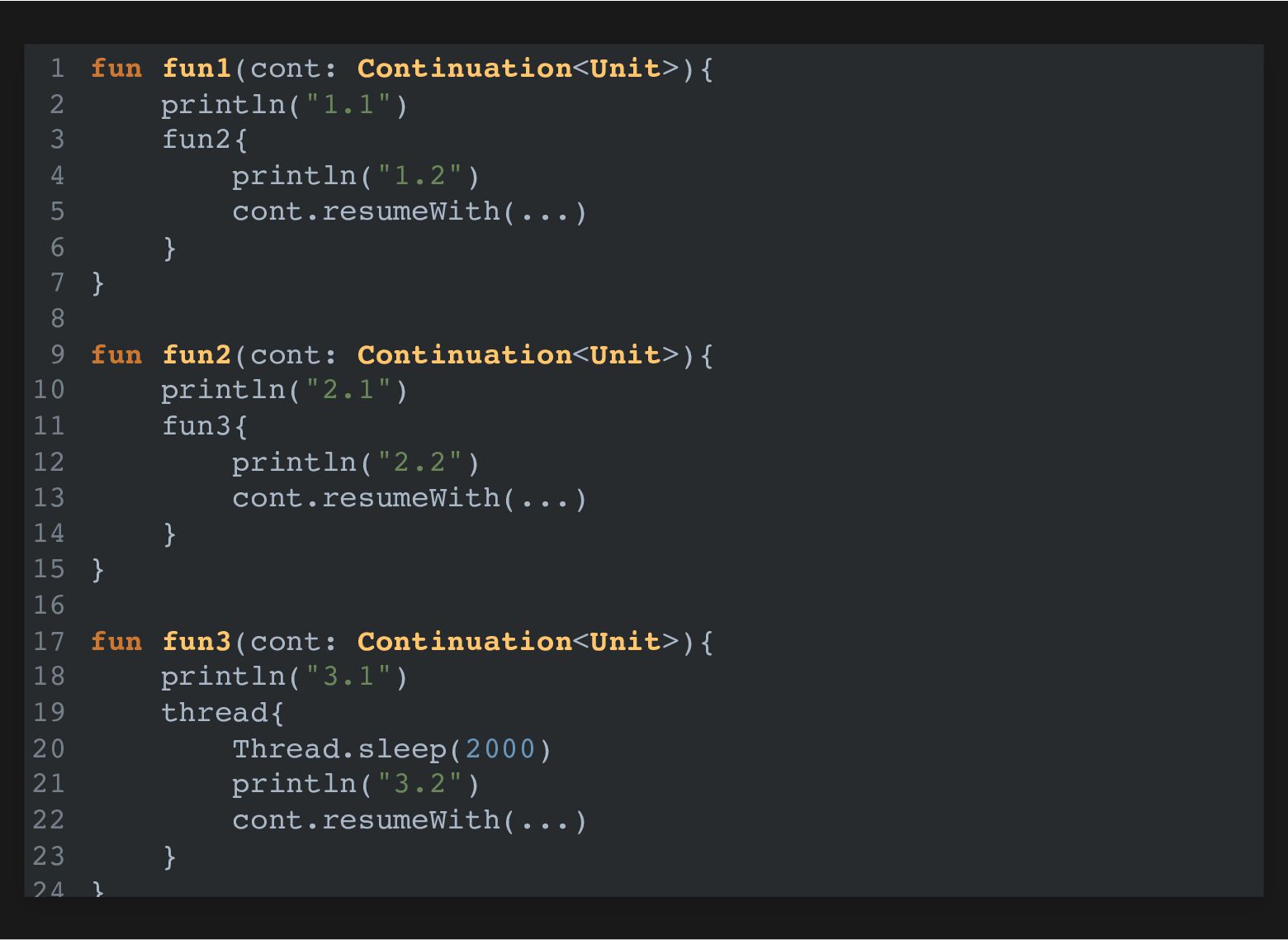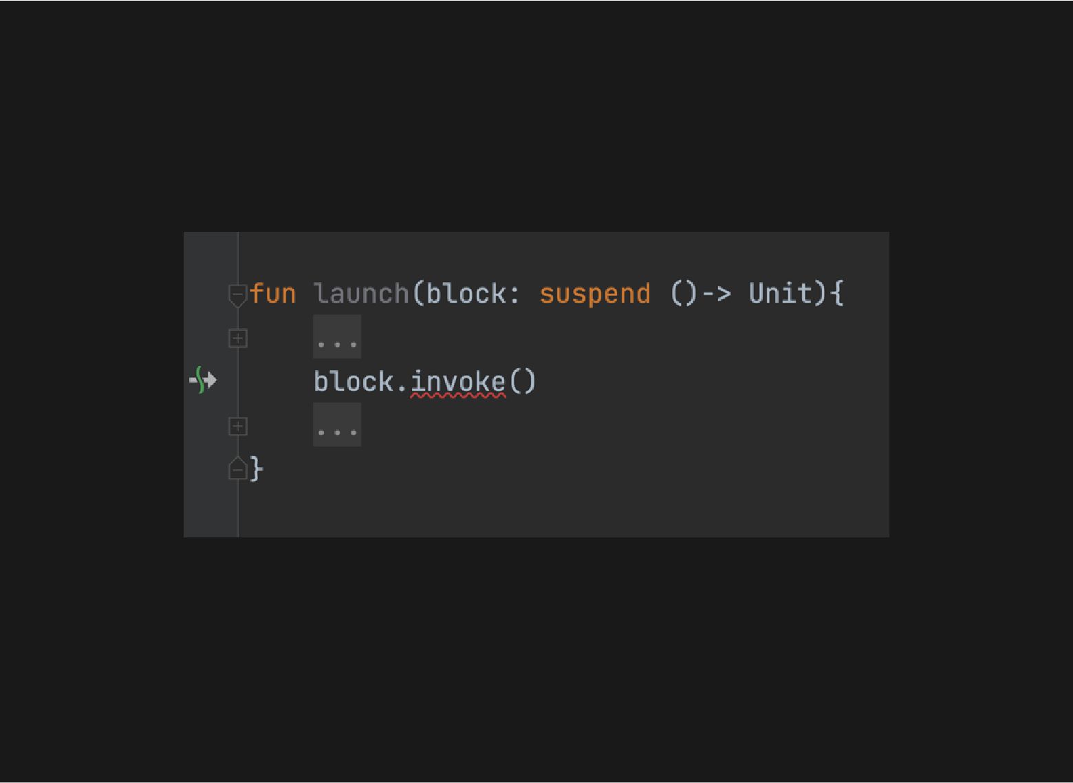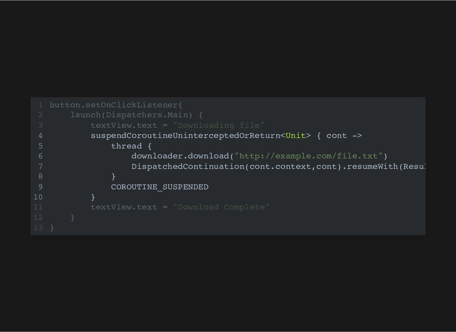 = object : Continuation<Unit>, CoroutineScope, Job { 3 init{ 4 context[Job]?.addChildren(this) 5 } 6 override val context = scopeContext + extraContext + this 7 override fun resumeWith(result: Result<Unit>) { 8 context[Job]?.waitForChildren() 9 } 10 } 11 12 val continuation = block.createCoroutineUnintercepted(completionCallback,complet 13 14 DispatchedContinuation(dispatcher,continuation).resumeWith(Result.success(Unit)) 15 } 16 val completionCallback = object : Continuation<Unit>, CoroutineScope, Job { fun CoroutineScope.launch(extraContext: CoroutineContext, block: suspend CoroutineSc 1 2 3 init{ 4 context[Job]?.addChildren(this) 5 } 6 override val context = scopeContext + extraContext + this 7 override fun resumeWith(result: Result<Unit>) { 8 context[Job]?.waitForChildren() 9 } 10 } 11 12 val continuation = block.createCoroutineUnintercepted(completionCallback,complet 13 14 DispatchedContinuation(dispatcher,continuation).resumeWith(Result.success(Unit)) 15 } 16 init{ context[Job]?.addChildren(this) } fun CoroutineScope.launch(extraContext: CoroutineContext, block: suspend CoroutineSc 1 2 val completionCallback = object : Continuation<Unit>, CoroutineScope, Job { 3 4 5 6 override val context = scopeContext + extraContext + this 7 override fun resumeWith(result: Result<Unit>) { 8 context[Job]?.waitForChildren() 9 } 10 } 11 12 val continuation = block.createCoroutineUnintercepted(completionCallback,complet 13 14 DispatchedContinuation(dispatcher,continuation).resumeWith(Result.success(Unit)) 15 } 16 context[Job]?.waitForChildren() fun CoroutineScope.launch(extraContext: CoroutineContext, block: suspend CoroutineSc 1 2 val completionCallback = object : Continuation<Unit>, CoroutineScope, Job { 3 init{ 4 context[Job]?.addChildren(this) 5 } 6 override val context = scopeContext + extraContext + this 7 override fun resumeWith(result: Result<Unit>) { 8 9 } 10 } 11 12 val continuation = block.createCoroutineUnintercepted(completionCallback,complet 13 14 DispatchedContinuation(dispatcher,continuation).resumeWith(Result.success(Unit)) 15 } 16 fun CoroutineScope.launch(extraContext: CoroutineContext, block: suspend CoroutineSc val completionCallback = object : Continuation<Unit>, CoroutineScope, Job { init{ context[Job]?.addChildren(this) } override val context = scopeContext + extraContext + this override fun resumeWith(result: Result<Unit>) { context[Job]?.waitForChildren() } } val continuation = block.createCoroutineUnintercepted(completionCallback,complet DispatchedContinuation(dispatcher,continuation).resumeWith(Result.success(Unit)) } 1 2 3 4 5 6 7 8 9 10 11 12 13 14 15 16