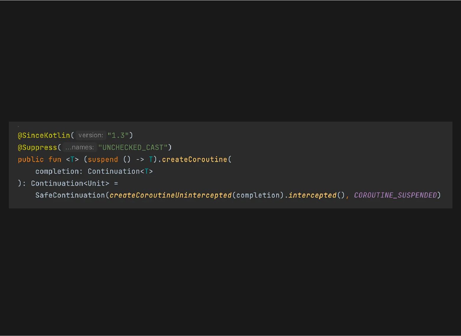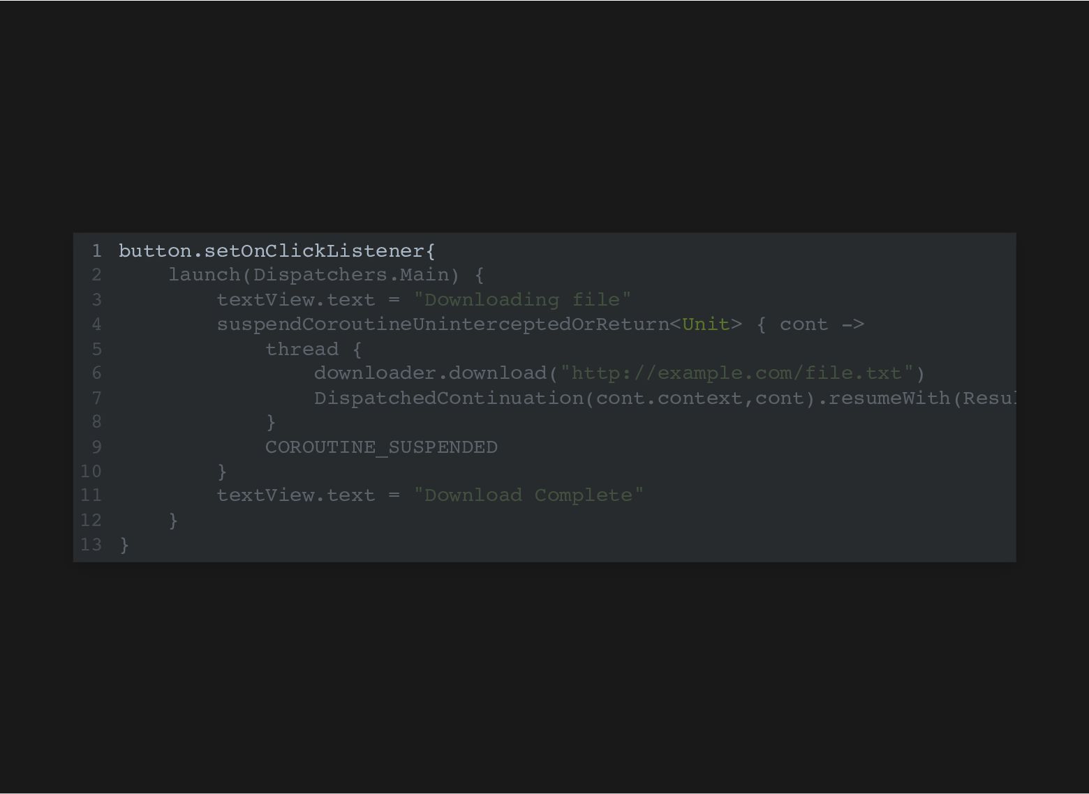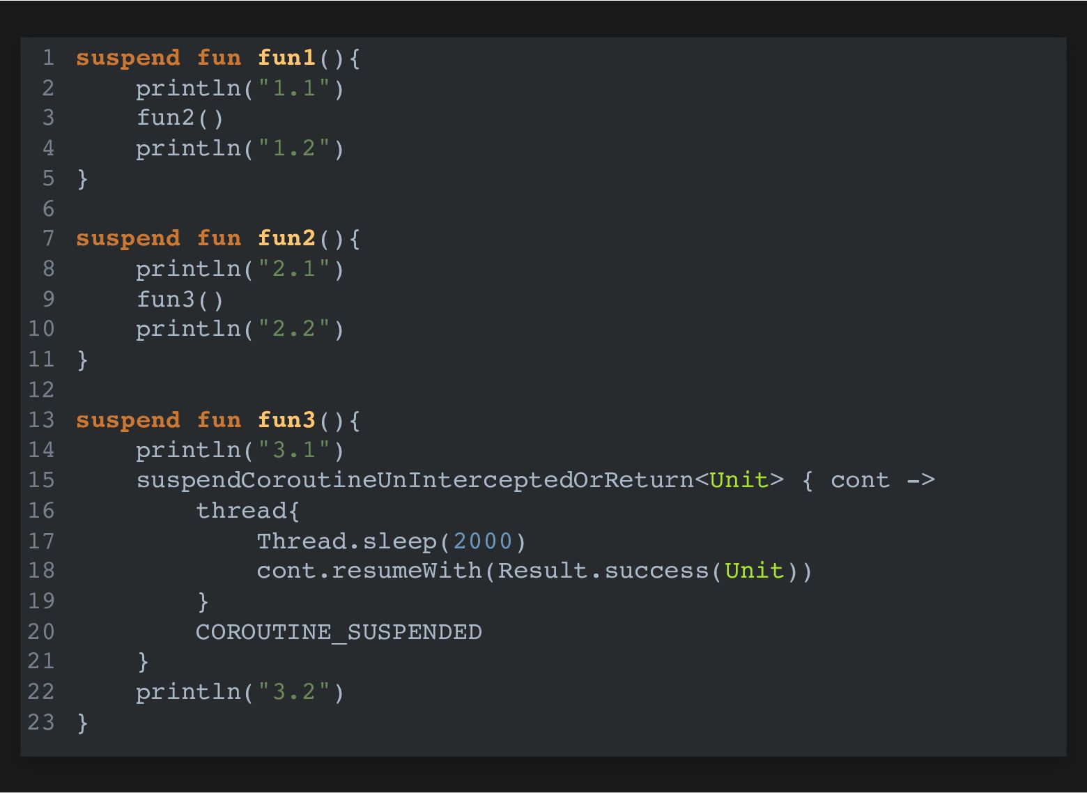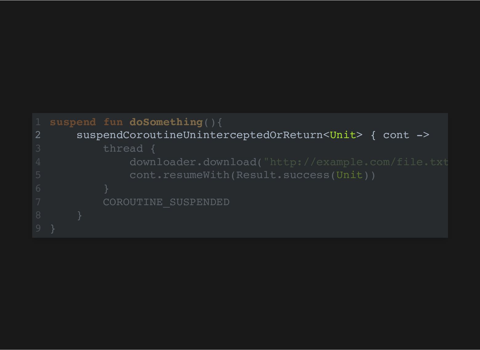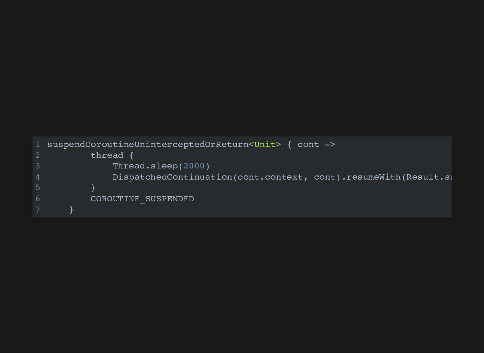 = object : Continuation<Unit>, CoroutineScope, Job { 3 init{ 4 context[Job]?.addChildren(this) 5 } 6 override val context = scopeContext + extraContext + this 7 override fun resumeWith(result: Result<Unit>) { 8 context[Job]?.waitForChildren() 9 } 10 } 11 12 val continuation = block.createCoroutineUnintercepted(completionCallback,complet 13 14 DispatchedContinuation(dispatcher,continuation).resumeWith(Result.success(Unit)) 15 } 16 val completionCallback = object : Continuation<Unit>, CoroutineScope, Job { fun CoroutineScope.launch(extraContext: CoroutineContext, block: suspend CoroutineSc 1 2 3 init{ 4 context[Job]?.addChildren(this) 5 } 6 override val context = scopeContext + extraContext + this 7 override fun resumeWith(result: Result<Unit>) { 8 context[Job]?.waitForChildren() 9 } 10 } 11 12 val continuation = block.createCoroutineUnintercepted(completionCallback,complet 13 14 DispatchedContinuation(dispatcher,continuation).resumeWith(Result.success(Unit)) 15 } 16 init{ context[Job]?.addChildren(this) } fun CoroutineScope.launch(extraContext: CoroutineContext, block: suspend CoroutineSc 1 2 val completionCallback = object : Continuation<Unit>, CoroutineScope, Job { 3 4 5 6 override val context = scopeContext + extraContext + this 7 override fun resumeWith(result: Result<Unit>) { 8 context[Job]?.waitForChildren() 9 } 10 } 11 12 val continuation = block.createCoroutineUnintercepted(completionCallback,complet 13 14 DispatchedContinuation(dispatcher,continuation).resumeWith(Result.success(Unit)) 15 } 16 context[Job]?.waitForChildren() fun CoroutineScope.launch(extraContext: CoroutineContext, block: suspend CoroutineSc 1 2 val completionCallback = object : Continuation<Unit>, CoroutineScope, Job { 3 init{ 4 context[Job]?.addChildren(this) 5 } 6 override val context = scopeContext + extraContext + this 7 override fun resumeWith(result: Result<Unit>) { 8 9 } 10 } 11 12 val continuation = block.createCoroutineUnintercepted(completionCallback,complet 13 14 DispatchedContinuation(dispatcher,continuation).resumeWith(Result.success(Unit)) 15 } 16 fun CoroutineScope.launch(extraContext: CoroutineContext, block: suspend CoroutineSc val completionCallback = object : Continuation<Unit>, CoroutineScope, Job { init{ context[Job]?.addChildren(this) } override val context = scopeContext + extraContext + this override fun resumeWith(result: Result<Unit>) { context[Job]?.waitForChildren() } } val continuation = block.createCoroutineUnintercepted(completionCallback,complet DispatchedContinuation(dispatcher,continuation).resumeWith(Result.success(Unit)) } 1 2 3 4 5 6 7 8 9 10 11 12 13 14 15 16
