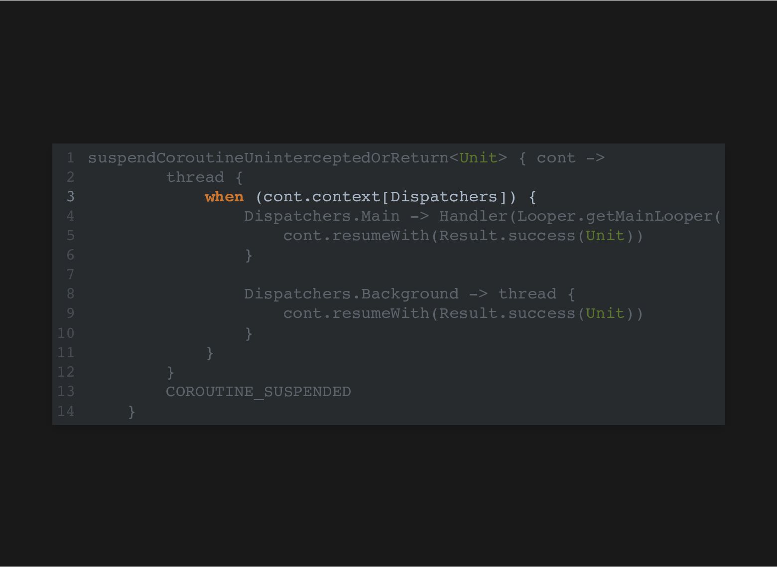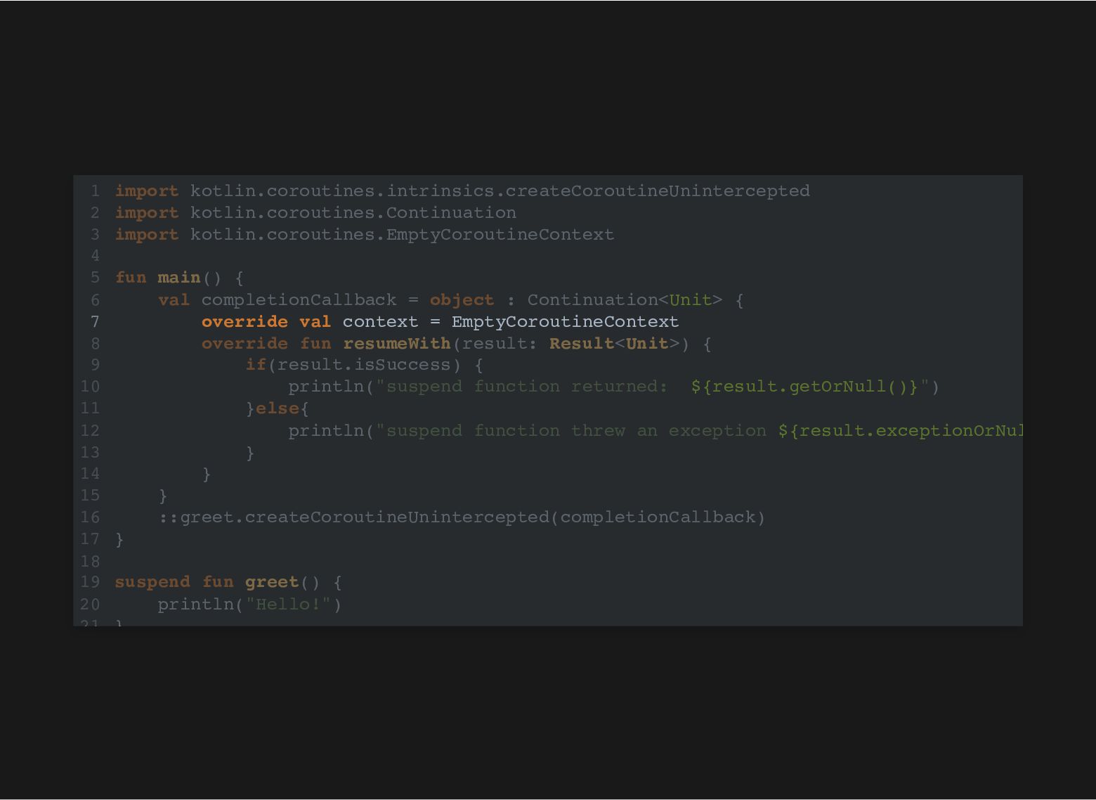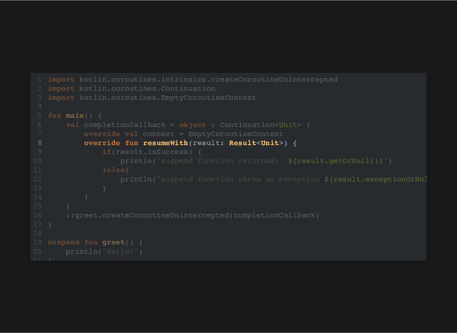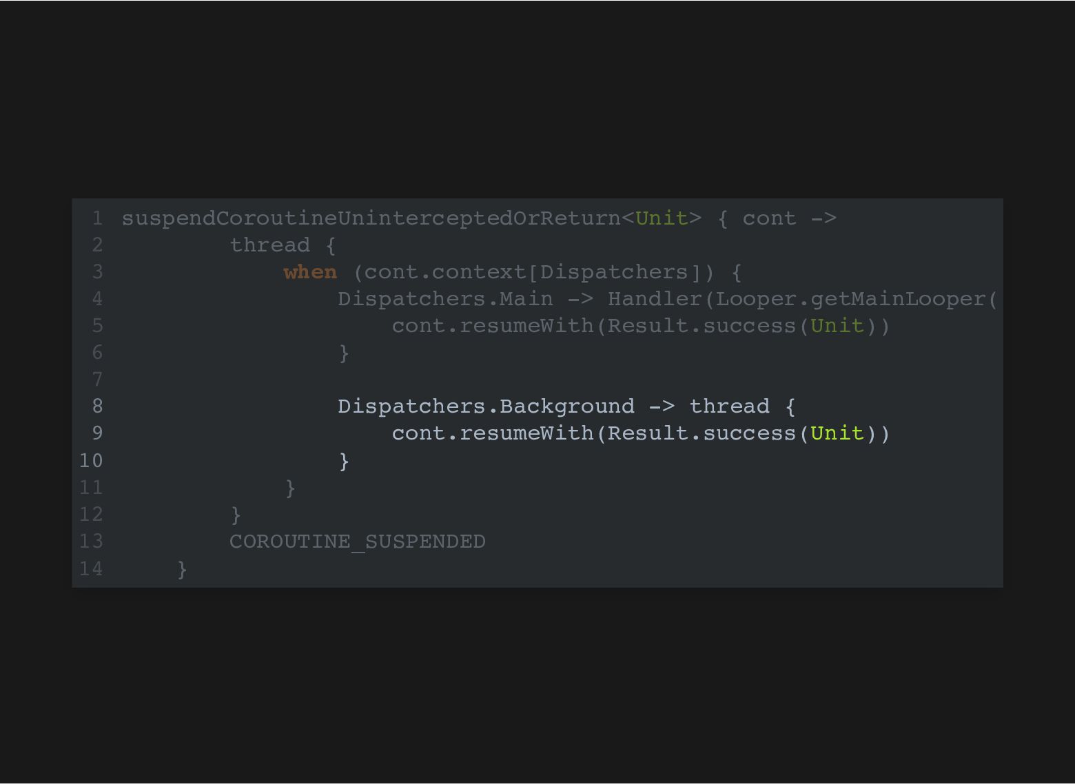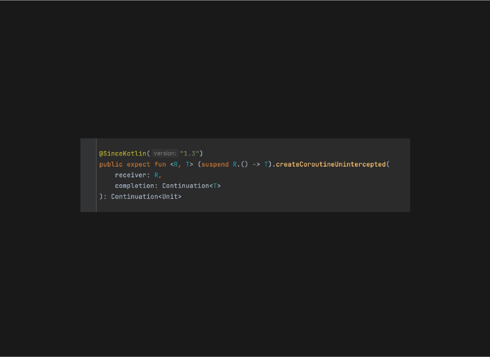 = object : Continuation<Unit>, CoroutineScope, Job { 3 init{ 4 context[Job]?.addChildren(this) 5 } 6 override val context = scopeContext + extraContext + this 7 override fun resumeWith(result: Result<Unit>) { 8 context[Job]?.waitForChildren() 9 } 10 } 11 12 val continuation = block.createCoroutineUnintercepted(completionCallback,complet 13 14 DispatchedContinuation(dispatcher,continuation).resumeWith(Result.success(Unit)) 15 } 16 val completionCallback = object : Continuation<Unit>, CoroutineScope, Job { fun CoroutineScope.launch(extraContext: CoroutineContext, block: suspend CoroutineSc 1 2 3 init{ 4 context[Job]?.addChildren(this) 5 } 6 override val context = scopeContext + extraContext + this 7 override fun resumeWith(result: Result<Unit>) { 8 context[Job]?.waitForChildren() 9 } 10 } 11 12 val continuation = block.createCoroutineUnintercepted(completionCallback,complet 13 14 DispatchedContinuation(dispatcher,continuation).resumeWith(Result.success(Unit)) 15 } 16 init{ context[Job]?.addChildren(this) } fun CoroutineScope.launch(extraContext: CoroutineContext, block: suspend CoroutineSc 1 2 val completionCallback = object : Continuation<Unit>, CoroutineScope, Job { 3 4 5 6 override val context = scopeContext + extraContext + this 7 override fun resumeWith(result: Result<Unit>) { 8 context[Job]?.waitForChildren() 9 } 10 } 11 12 val continuation = block.createCoroutineUnintercepted(completionCallback,complet 13 14 DispatchedContinuation(dispatcher,continuation).resumeWith(Result.success(Unit)) 15 } 16 context[Job]?.waitForChildren() fun CoroutineScope.launch(extraContext: CoroutineContext, block: suspend CoroutineSc 1 2 val completionCallback = object : Continuation<Unit>, CoroutineScope, Job { 3 init{ 4 context[Job]?.addChildren(this) 5 } 6 override val context = scopeContext + extraContext + this 7 override fun resumeWith(result: Result<Unit>) { 8 9 } 10 } 11 12 val continuation = block.createCoroutineUnintercepted(completionCallback,complet 13 14 DispatchedContinuation(dispatcher,continuation).resumeWith(Result.success(Unit)) 15 } 16 fun CoroutineScope.launch(extraContext: CoroutineContext, block: suspend CoroutineSc val completionCallback = object : Continuation<Unit>, CoroutineScope, Job { init{ context[Job]?.addChildren(this) } override val context = scopeContext + extraContext + this override fun resumeWith(result: Result<Unit>) { context[Job]?.waitForChildren() } } val continuation = block.createCoroutineUnintercepted(completionCallback,complet DispatchedContinuation(dispatcher,continuation).resumeWith(Result.success(Unit)) } 1 2 3 4 5 6 7 8 9 10 11 12 13 14 15 16
