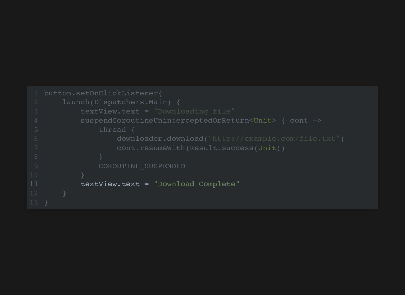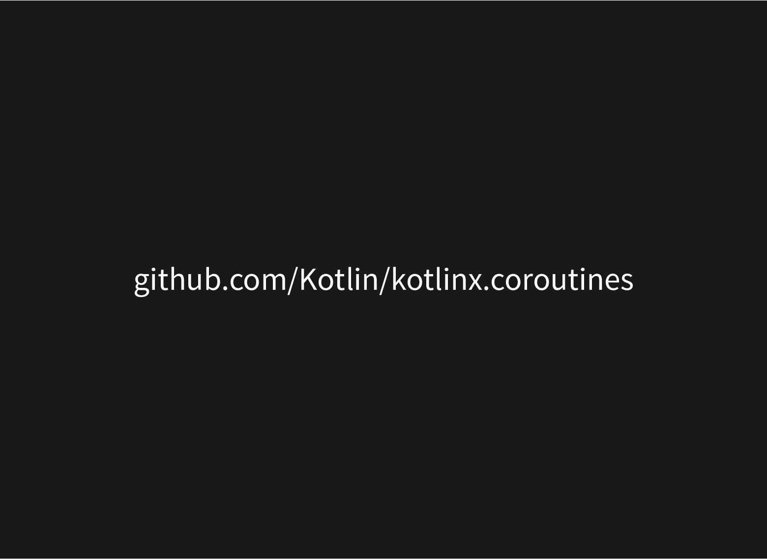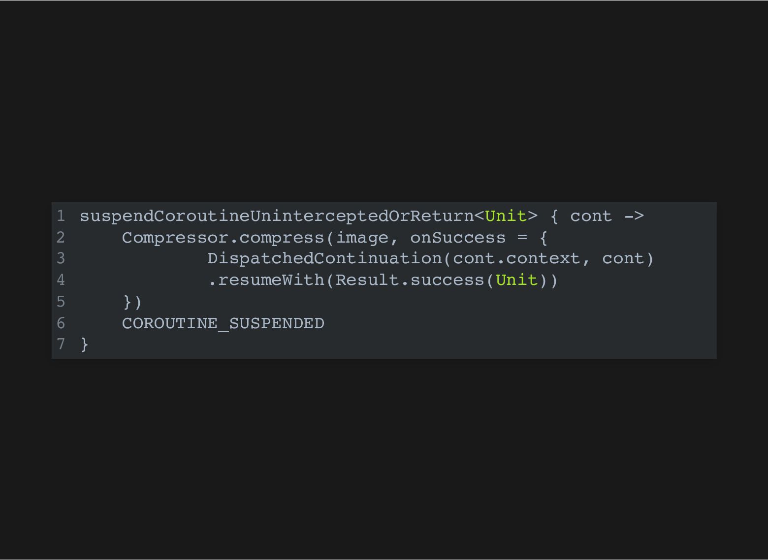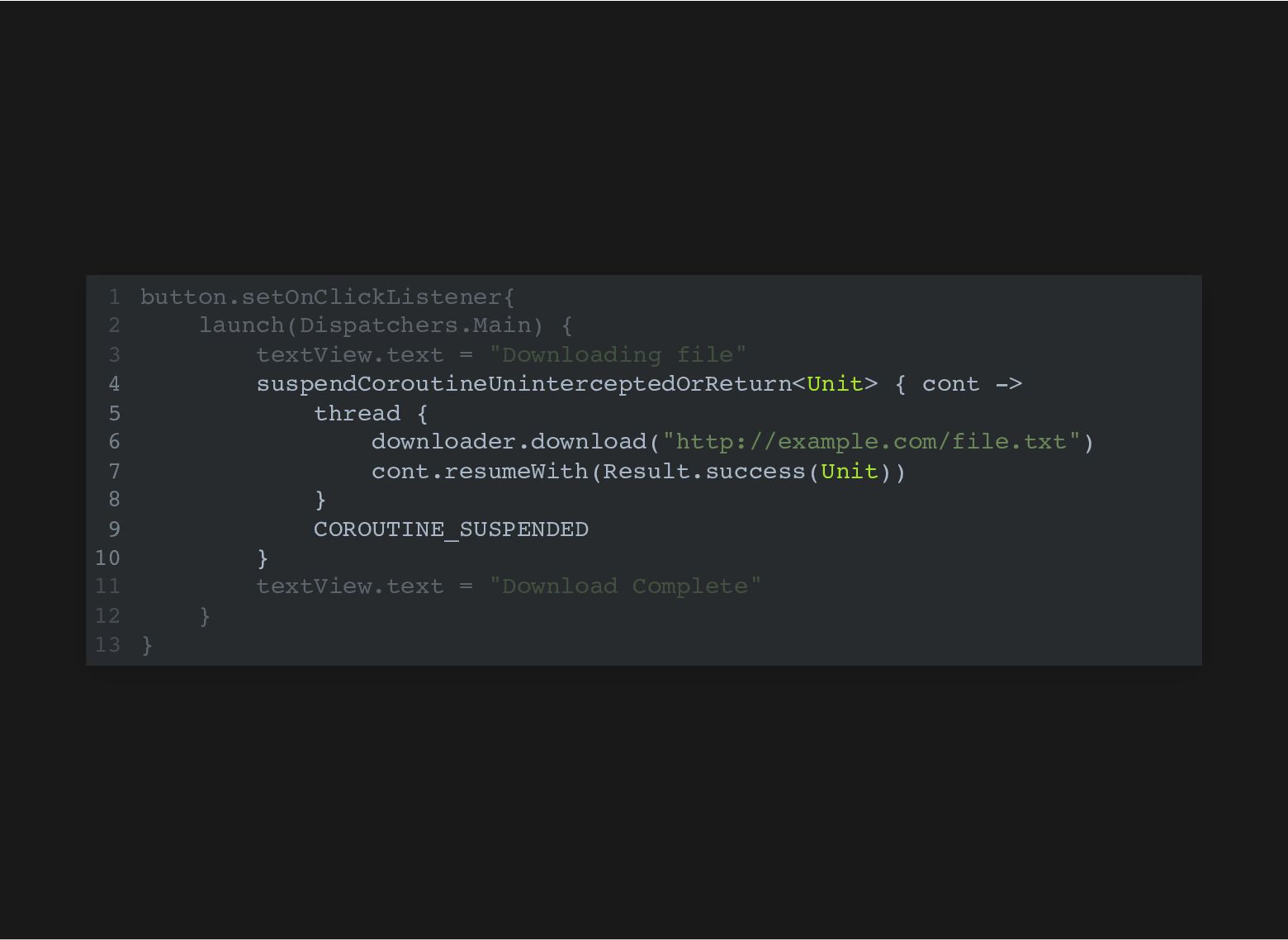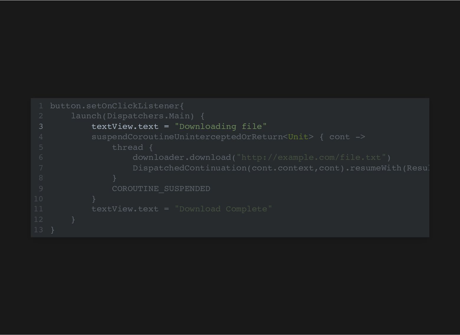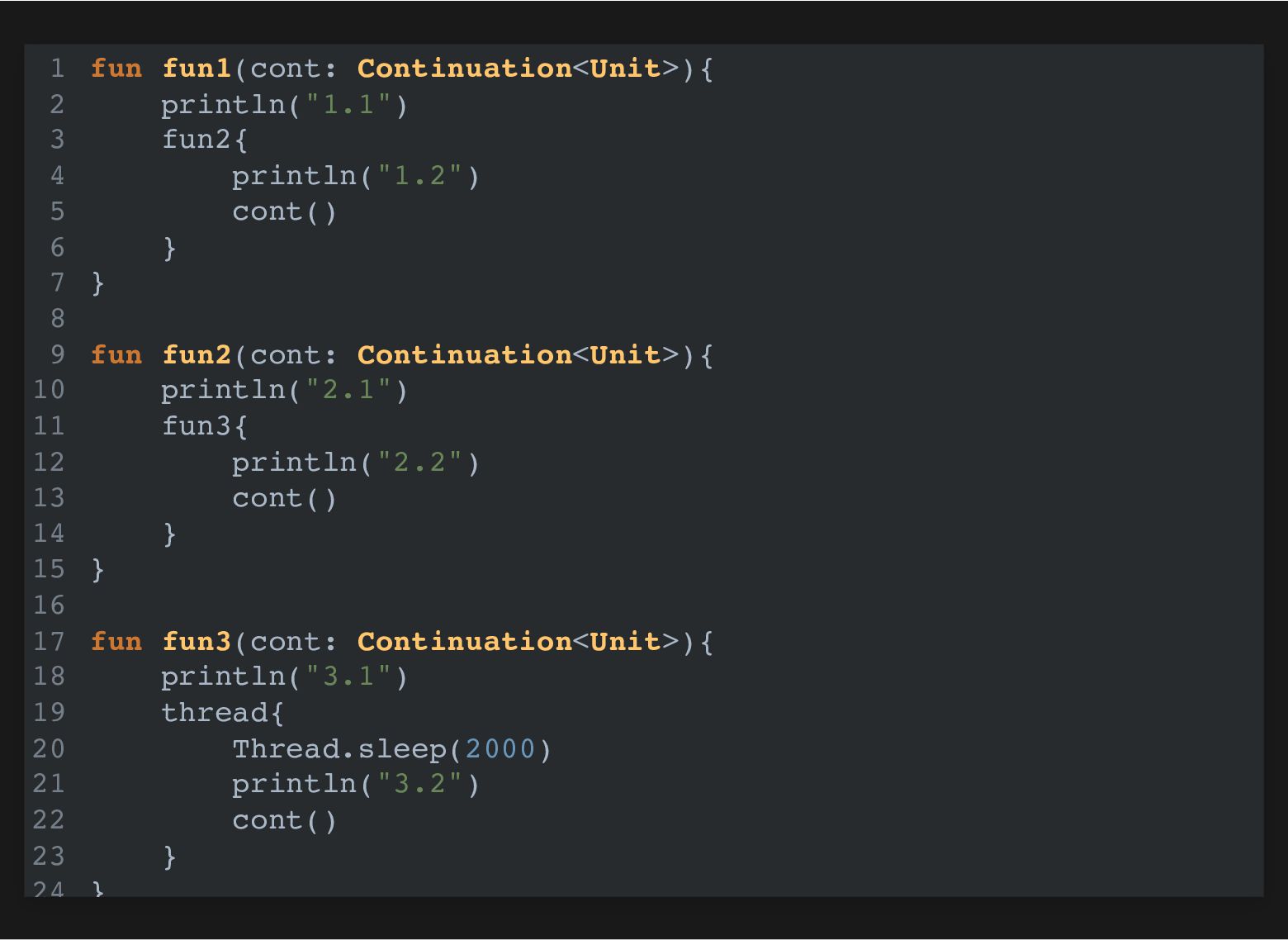 = object : Continuation<Unit>, CoroutineScope, Job { 3 init{ 4 context[Job]?.addChildren(this) 5 } 6 override val context = scopeContext + extraContext + this 7 override fun resumeWith(result: Result<Unit>) { 8 context[Job]?.waitForChildren() 9 } 10 } 11 12 val continuation = block.createCoroutineUnintercepted(completionCallback,complet 13 14 DispatchedContinuation(dispatcher,continuation).resumeWith(Result.success(Unit)) 15 } 16 val completionCallback = object : Continuation<Unit>, CoroutineScope, Job { fun CoroutineScope.launch(extraContext: CoroutineContext, block: suspend CoroutineSc 1 2 3 init{ 4 context[Job]?.addChildren(this) 5 } 6 override val context = scopeContext + extraContext + this 7 override fun resumeWith(result: Result<Unit>) { 8 context[Job]?.waitForChildren() 9 } 10 } 11 12 val continuation = block.createCoroutineUnintercepted(completionCallback,complet 13 14 DispatchedContinuation(dispatcher,continuation).resumeWith(Result.success(Unit)) 15 } 16 init{ context[Job]?.addChildren(this) } fun CoroutineScope.launch(extraContext: CoroutineContext, block: suspend CoroutineSc 1 2 val completionCallback = object : Continuation<Unit>, CoroutineScope, Job { 3 4 5 6 override val context = scopeContext + extraContext + this 7 override fun resumeWith(result: Result<Unit>) { 8 context[Job]?.waitForChildren() 9 } 10 } 11 12 val continuation = block.createCoroutineUnintercepted(completionCallback,complet 13 14 DispatchedContinuation(dispatcher,continuation).resumeWith(Result.success(Unit)) 15 } 16 context[Job]?.waitForChildren() fun CoroutineScope.launch(extraContext: CoroutineContext, block: suspend CoroutineSc 1 2 val completionCallback = object : Continuation<Unit>, CoroutineScope, Job { 3 init{ 4 context[Job]?.addChildren(this) 5 } 6 override val context = scopeContext + extraContext + this 7 override fun resumeWith(result: Result<Unit>) { 8 9 } 10 } 11 12 val continuation = block.createCoroutineUnintercepted(completionCallback,complet 13 14 DispatchedContinuation(dispatcher,continuation).resumeWith(Result.success(Unit)) 15 } 16 fun CoroutineScope.launch(extraContext: CoroutineContext, block: suspend CoroutineSc val completionCallback = object : Continuation<Unit>, CoroutineScope, Job { init{ context[Job]?.addChildren(this) } override val context = scopeContext + extraContext + this override fun resumeWith(result: Result<Unit>) { context[Job]?.waitForChildren() } } val continuation = block.createCoroutineUnintercepted(completionCallback,complet DispatchedContinuation(dispatcher,continuation).resumeWith(Result.success(Unit)) } 1 2 3 4 5 6 7 8 9 10 11 12 13 14 15 16