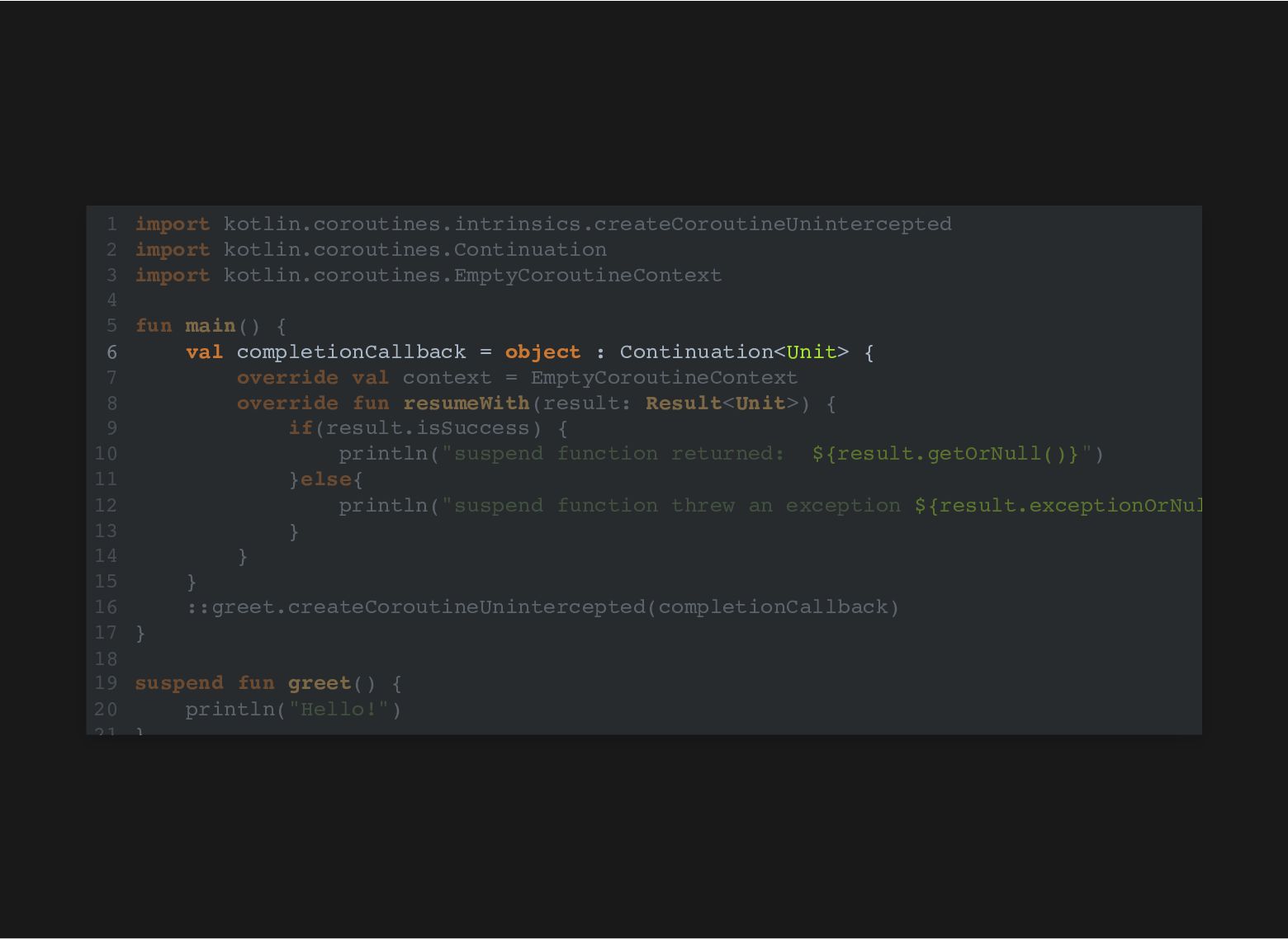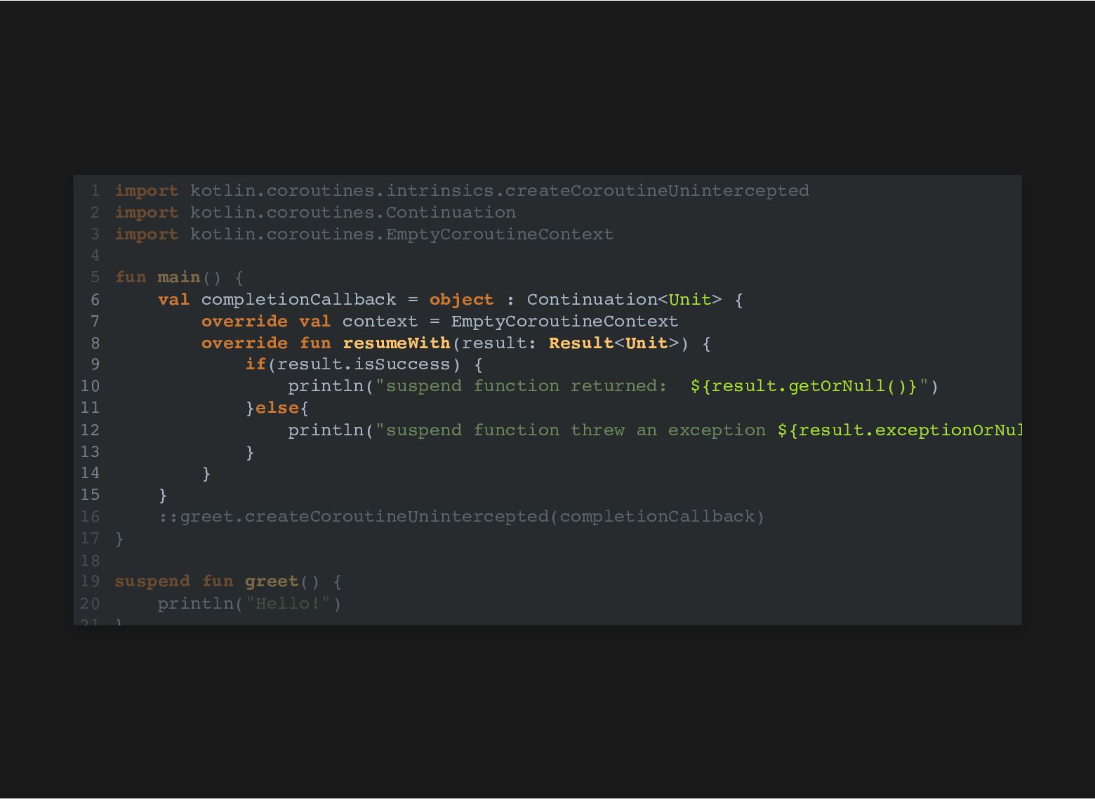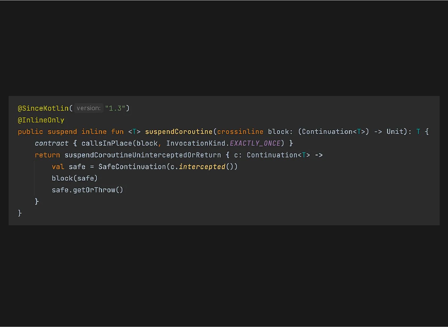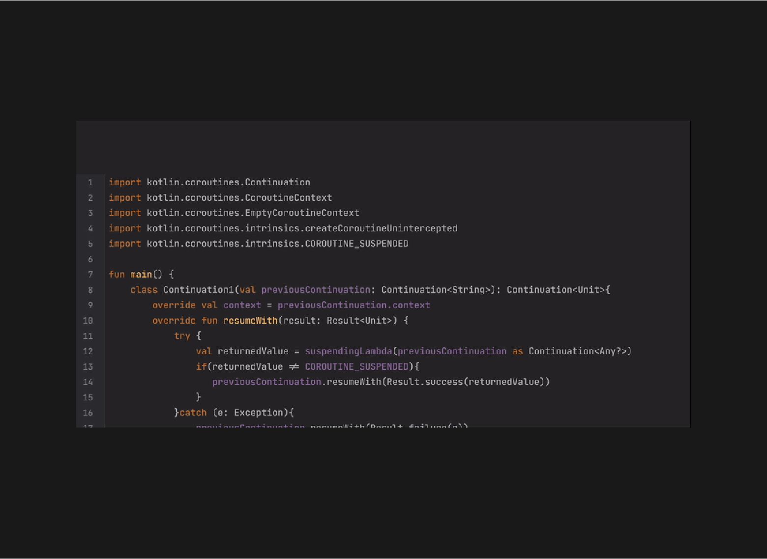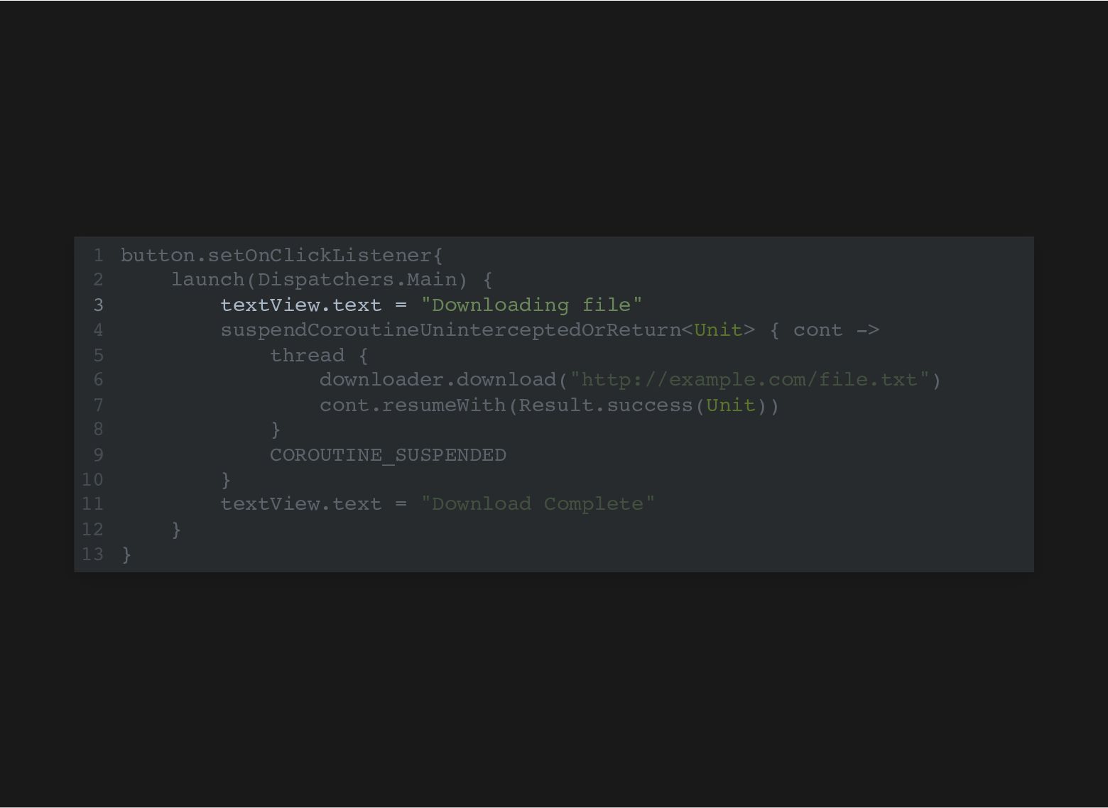 = object : Continuation<Unit>, CoroutineScope, Job { 3 init{ 4 context[Job]?.addChildren(this) 5 } 6 override val context = scopeContext + extraContext + this 7 override fun resumeWith(result: Result<Unit>) { 8 context[Job]?.waitForChildren() 9 } 10 } 11 12 val continuation = block.createCoroutineUnintercepted(completionCallback,complet 13 14 DispatchedContinuation(dispatcher,continuation).resumeWith(Result.success(Unit)) 15 } 16 val completionCallback = object : Continuation<Unit>, CoroutineScope, Job { fun CoroutineScope.launch(extraContext: CoroutineContext, block: suspend CoroutineSc 1 2 3 init{ 4 context[Job]?.addChildren(this) 5 } 6 override val context = scopeContext + extraContext + this 7 override fun resumeWith(result: Result<Unit>) { 8 context[Job]?.waitForChildren() 9 } 10 } 11 12 val continuation = block.createCoroutineUnintercepted(completionCallback,complet 13 14 DispatchedContinuation(dispatcher,continuation).resumeWith(Result.success(Unit)) 15 } 16 init{ context[Job]?.addChildren(this) } fun CoroutineScope.launch(extraContext: CoroutineContext, block: suspend CoroutineSc 1 2 val completionCallback = object : Continuation<Unit>, CoroutineScope, Job { 3 4 5 6 override val context = scopeContext + extraContext + this 7 override fun resumeWith(result: Result<Unit>) { 8 context[Job]?.waitForChildren() 9 } 10 } 11 12 val continuation = block.createCoroutineUnintercepted(completionCallback,complet 13 14 DispatchedContinuation(dispatcher,continuation).resumeWith(Result.success(Unit)) 15 } 16 context[Job]?.waitForChildren() fun CoroutineScope.launch(extraContext: CoroutineContext, block: suspend CoroutineSc 1 2 val completionCallback = object : Continuation<Unit>, CoroutineScope, Job { 3 init{ 4 context[Job]?.addChildren(this) 5 } 6 override val context = scopeContext + extraContext + this 7 override fun resumeWith(result: Result<Unit>) { 8 9 } 10 } 11 12 val continuation = block.createCoroutineUnintercepted(completionCallback,complet 13 14 DispatchedContinuation(dispatcher,continuation).resumeWith(Result.success(Unit)) 15 } 16 fun CoroutineScope.launch(extraContext: CoroutineContext, block: suspend CoroutineSc val completionCallback = object : Continuation<Unit>, CoroutineScope, Job { init{ context[Job]?.addChildren(this) } override val context = scopeContext + extraContext + this override fun resumeWith(result: Result<Unit>) { context[Job]?.waitForChildren() } } val continuation = block.createCoroutineUnintercepted(completionCallback,complet DispatchedContinuation(dispatcher,continuation).resumeWith(Result.success(Unit)) } 1 2 3 4 5 6 7 8 9 10 11 12 13 14 15 16