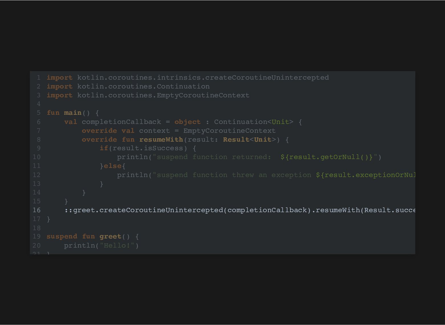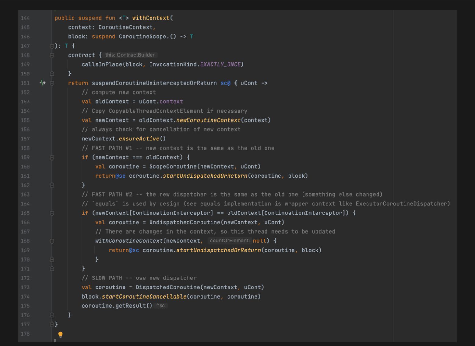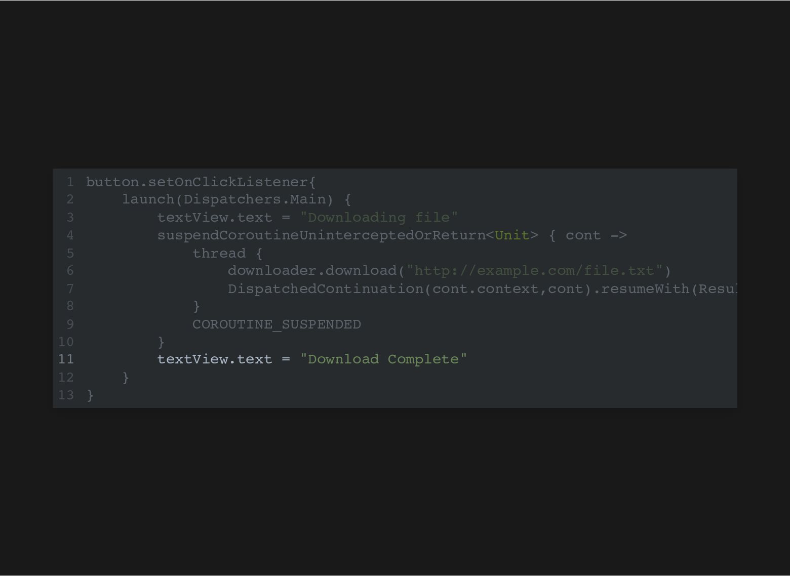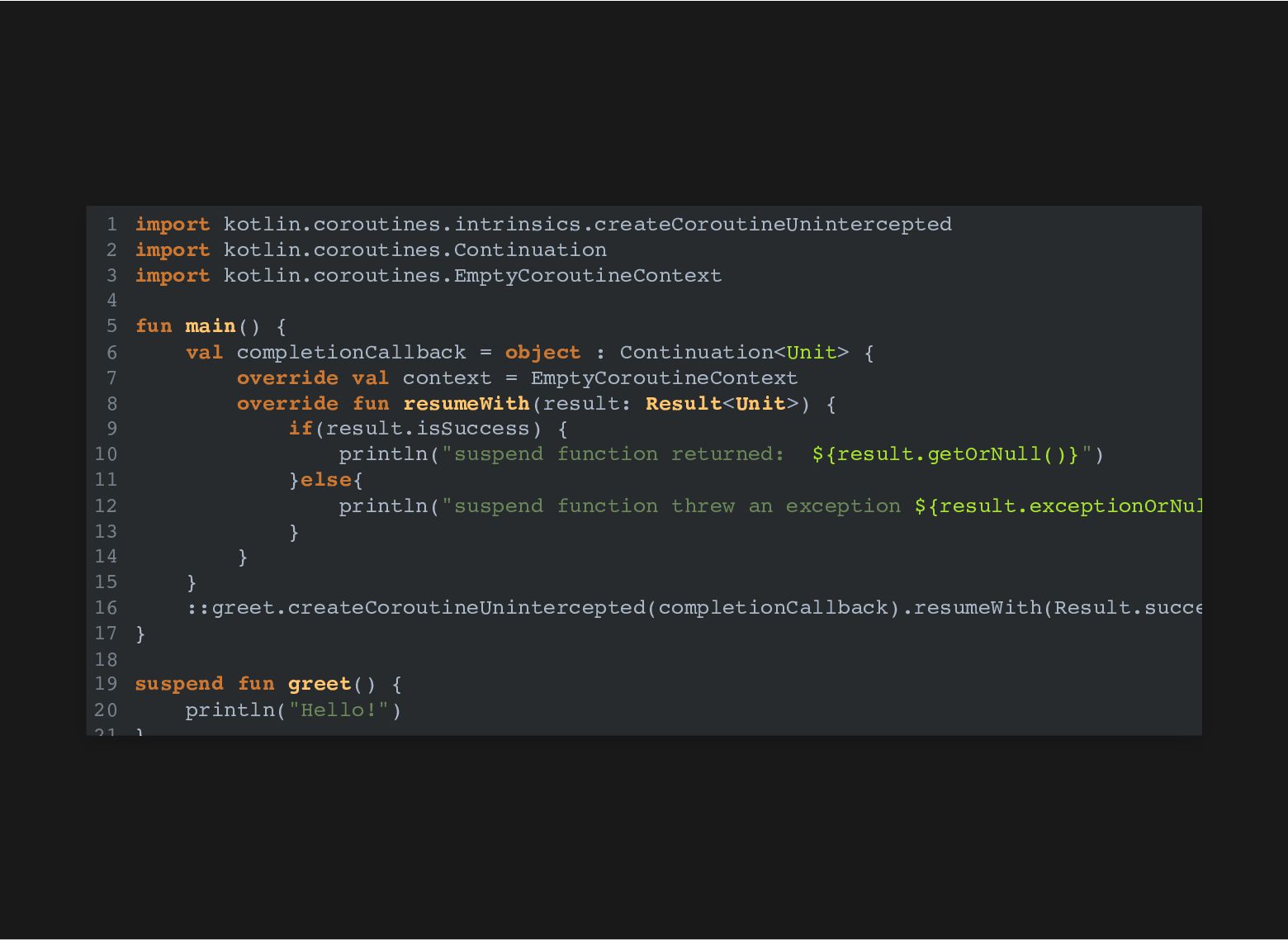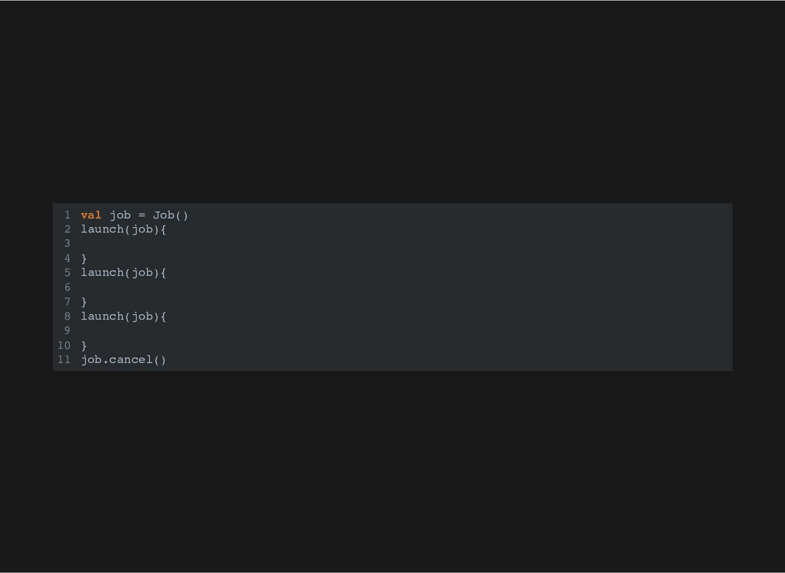 = object : Continuation<Unit>, CoroutineScope, Job { 3 init{ 4 context[Job]?.addChildren(this) 5 } 6 override val context = scopeContext + extraContext + this 7 override fun resumeWith(result: Result<Unit>) { 8 context[Job]?.waitForChildren() 9 } 10 } 11 12 val continuation = block.createCoroutineUnintercepted(completionCallback,complet 13 14 DispatchedContinuation(dispatcher,continuation).resumeWith(Result.success(Unit)) 15 } 16 val completionCallback = object : Continuation<Unit>, CoroutineScope, Job { fun CoroutineScope.launch(extraContext: CoroutineContext, block: suspend CoroutineSc 1 2 3 init{ 4 context[Job]?.addChildren(this) 5 } 6 override val context = scopeContext + extraContext + this 7 override fun resumeWith(result: Result<Unit>) { 8 context[Job]?.waitForChildren() 9 } 10 } 11 12 val continuation = block.createCoroutineUnintercepted(completionCallback,complet 13 14 DispatchedContinuation(dispatcher,continuation).resumeWith(Result.success(Unit)) 15 } 16 init{ context[Job]?.addChildren(this) } fun CoroutineScope.launch(extraContext: CoroutineContext, block: suspend CoroutineSc 1 2 val completionCallback = object : Continuation<Unit>, CoroutineScope, Job { 3 4 5 6 override val context = scopeContext + extraContext + this 7 override fun resumeWith(result: Result<Unit>) { 8 context[Job]?.waitForChildren() 9 } 10 } 11 12 val continuation = block.createCoroutineUnintercepted(completionCallback,complet 13 14 DispatchedContinuation(dispatcher,continuation).resumeWith(Result.success(Unit)) 15 } 16 context[Job]?.waitForChildren() fun CoroutineScope.launch(extraContext: CoroutineContext, block: suspend CoroutineSc 1 2 val completionCallback = object : Continuation<Unit>, CoroutineScope, Job { 3 init{ 4 context[Job]?.addChildren(this) 5 } 6 override val context = scopeContext + extraContext + this 7 override fun resumeWith(result: Result<Unit>) { 8 9 } 10 } 11 12 val continuation = block.createCoroutineUnintercepted(completionCallback,complet 13 14 DispatchedContinuation(dispatcher,continuation).resumeWith(Result.success(Unit)) 15 } 16 fun CoroutineScope.launch(extraContext: CoroutineContext, block: suspend CoroutineSc val completionCallback = object : Continuation<Unit>, CoroutineScope, Job { init{ context[Job]?.addChildren(this) } override val context = scopeContext + extraContext + this override fun resumeWith(result: Result<Unit>) { context[Job]?.waitForChildren() } } val continuation = block.createCoroutineUnintercepted(completionCallback,complet DispatchedContinuation(dispatcher,continuation).resumeWith(Result.success(Unit)) } 1 2 3 4 5 6 7 8 9 10 11 12 13 14 15 16