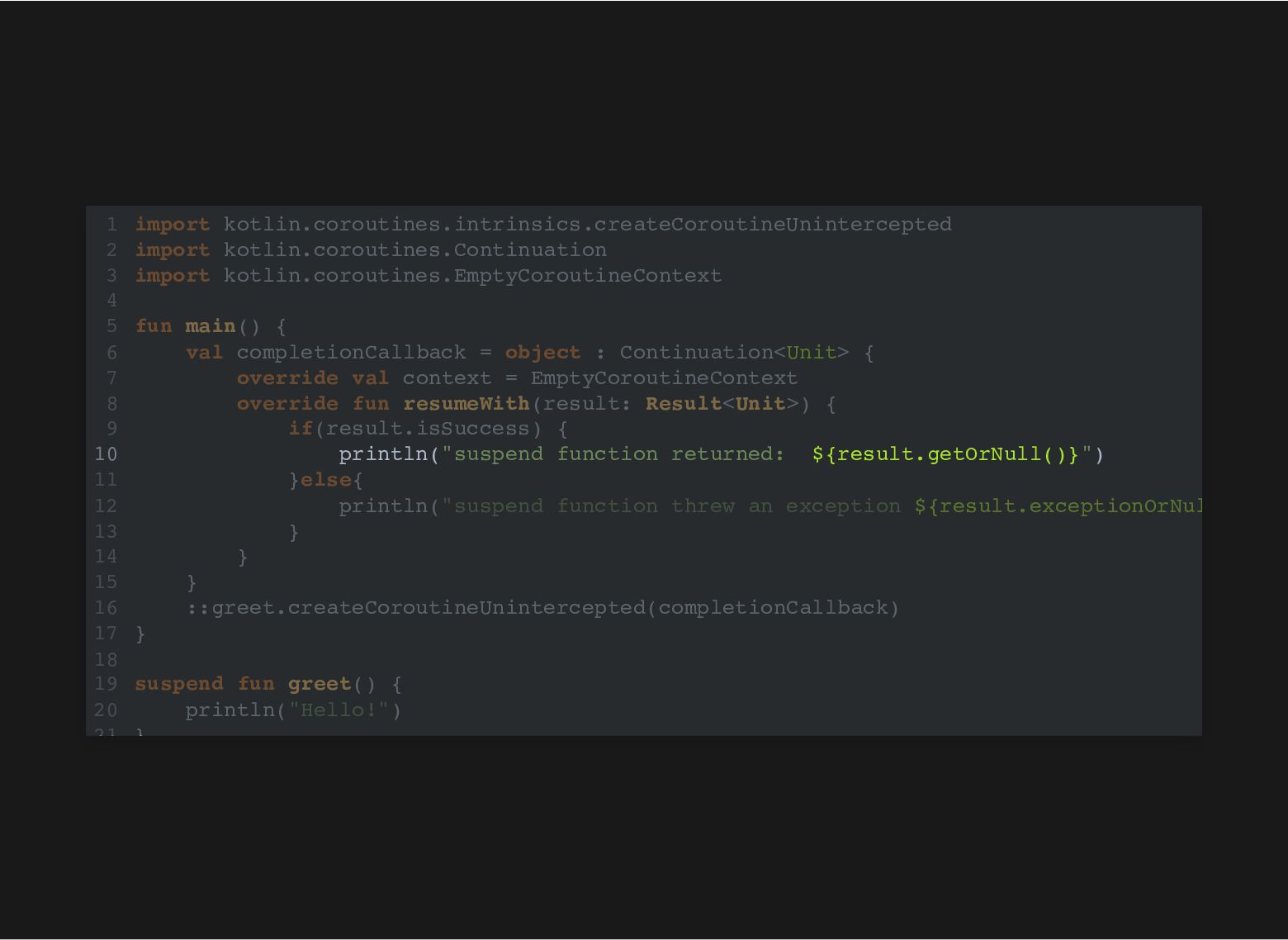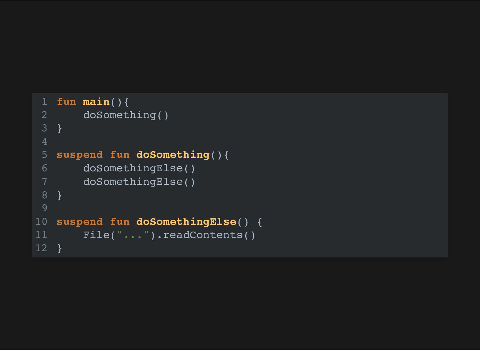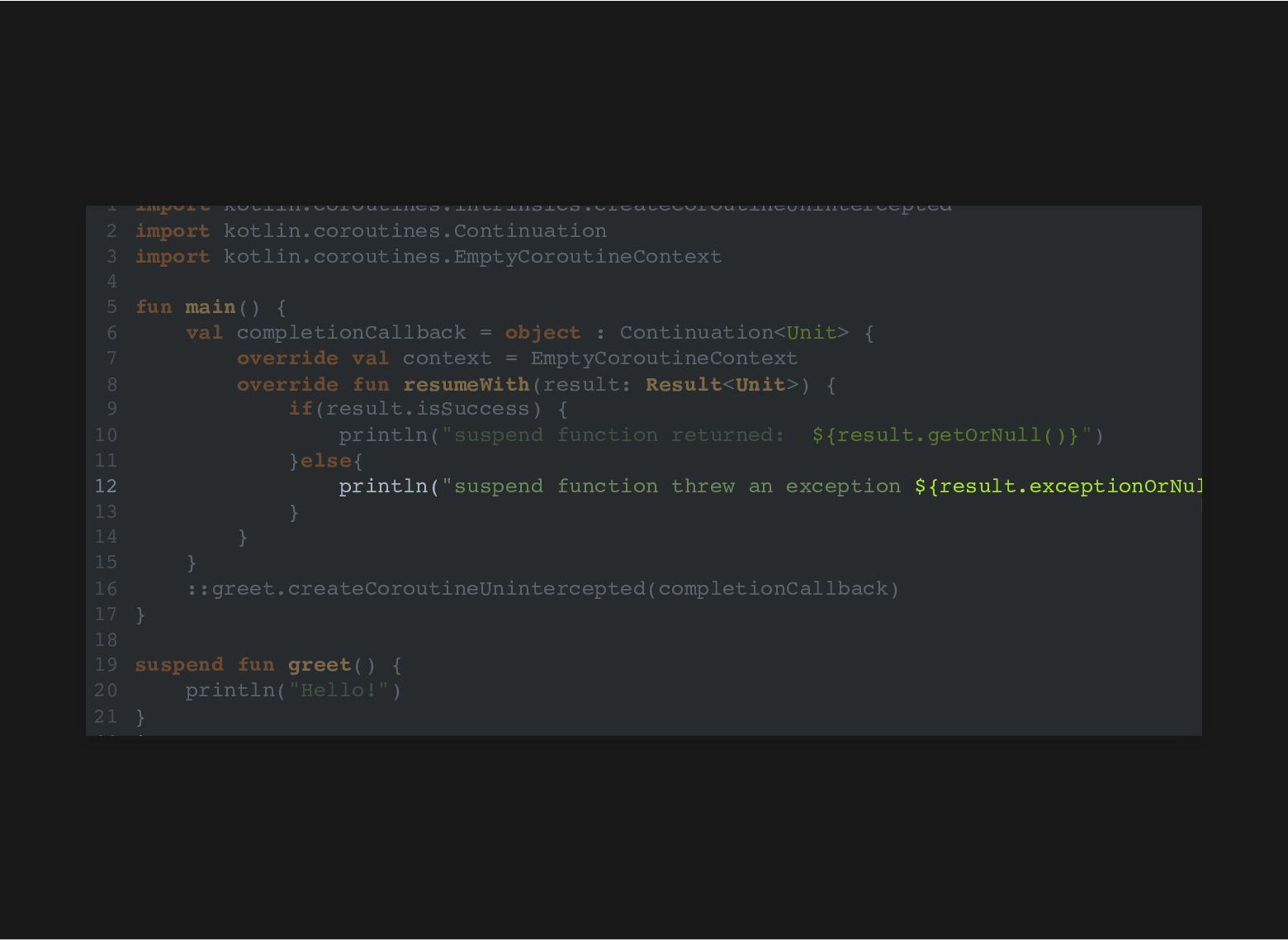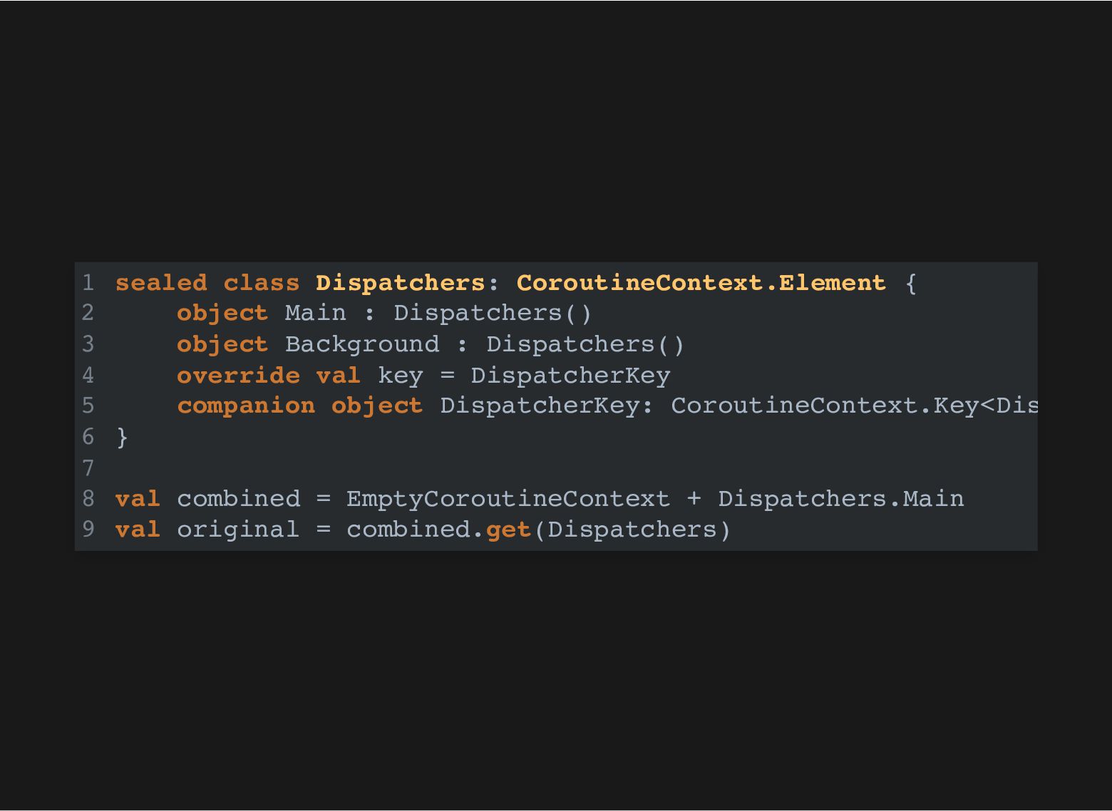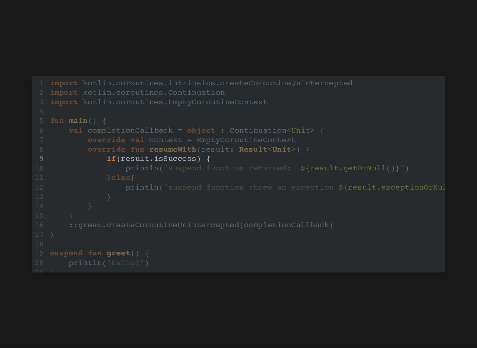 = object : Continuation<Unit>, CoroutineScope, Job { 3 init{ 4 context[Job]?.addChildren(this) 5 } 6 override val context = scopeContext + extraContext + this 7 override fun resumeWith(result: Result<Unit>) { 8 context[Job]?.waitForChildren() 9 } 10 } 11 12 val continuation = block.createCoroutineUnintercepted(completionCallback,complet 13 14 DispatchedContinuation(dispatcher,continuation).resumeWith(Result.success(Unit)) 15 } 16 val completionCallback = object : Continuation<Unit>, CoroutineScope, Job { fun CoroutineScope.launch(extraContext: CoroutineContext, block: suspend CoroutineSc 1 2 3 init{ 4 context[Job]?.addChildren(this) 5 } 6 override val context = scopeContext + extraContext + this 7 override fun resumeWith(result: Result<Unit>) { 8 context[Job]?.waitForChildren() 9 } 10 } 11 12 val continuation = block.createCoroutineUnintercepted(completionCallback,complet 13 14 DispatchedContinuation(dispatcher,continuation).resumeWith(Result.success(Unit)) 15 } 16 init{ context[Job]?.addChildren(this) } fun CoroutineScope.launch(extraContext: CoroutineContext, block: suspend CoroutineSc 1 2 val completionCallback = object : Continuation<Unit>, CoroutineScope, Job { 3 4 5 6 override val context = scopeContext + extraContext + this 7 override fun resumeWith(result: Result<Unit>) { 8 context[Job]?.waitForChildren() 9 } 10 } 11 12 val continuation = block.createCoroutineUnintercepted(completionCallback,complet 13 14 DispatchedContinuation(dispatcher,continuation).resumeWith(Result.success(Unit)) 15 } 16 context[Job]?.waitForChildren() fun CoroutineScope.launch(extraContext: CoroutineContext, block: suspend CoroutineSc 1 2 val completionCallback = object : Continuation<Unit>, CoroutineScope, Job { 3 init{ 4 context[Job]?.addChildren(this) 5 } 6 override val context = scopeContext + extraContext + this 7 override fun resumeWith(result: Result<Unit>) { 8 9 } 10 } 11 12 val continuation = block.createCoroutineUnintercepted(completionCallback,complet 13 14 DispatchedContinuation(dispatcher,continuation).resumeWith(Result.success(Unit)) 15 } 16 fun CoroutineScope.launch(extraContext: CoroutineContext, block: suspend CoroutineSc val completionCallback = object : Continuation<Unit>, CoroutineScope, Job { init{ context[Job]?.addChildren(this) } override val context = scopeContext + extraContext + this override fun resumeWith(result: Result<Unit>) { context[Job]?.waitForChildren() } } val continuation = block.createCoroutineUnintercepted(completionCallback,complet DispatchedContinuation(dispatcher,continuation).resumeWith(Result.success(Unit)) } 1 2 3 4 5 6 7 8 9 10 11 12 13 14 15 16
