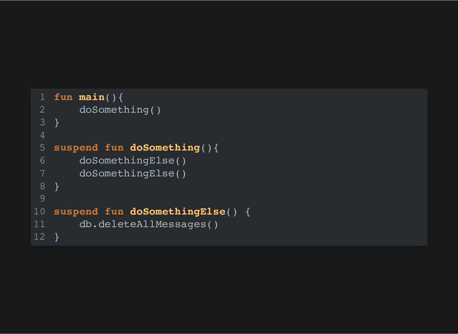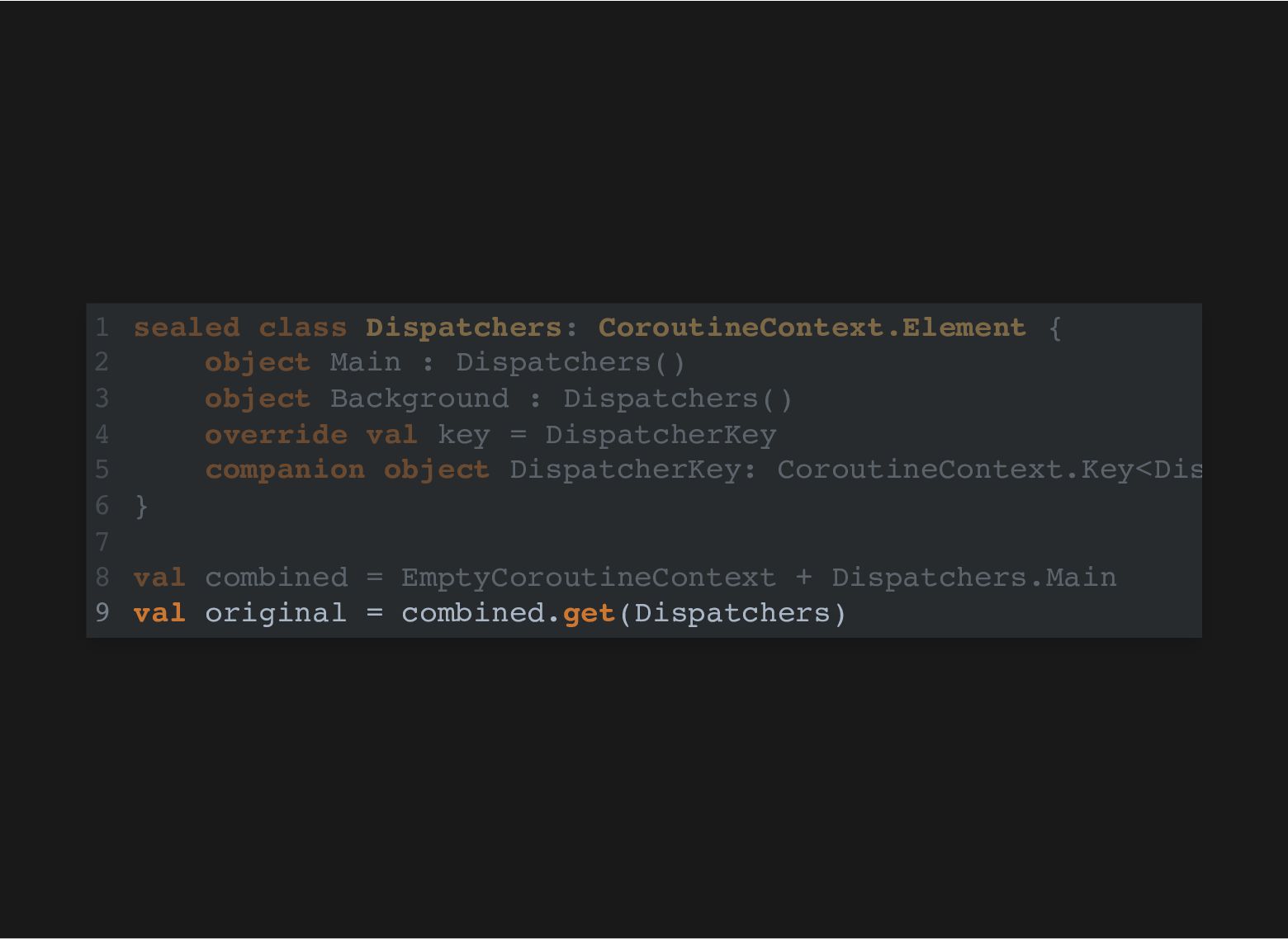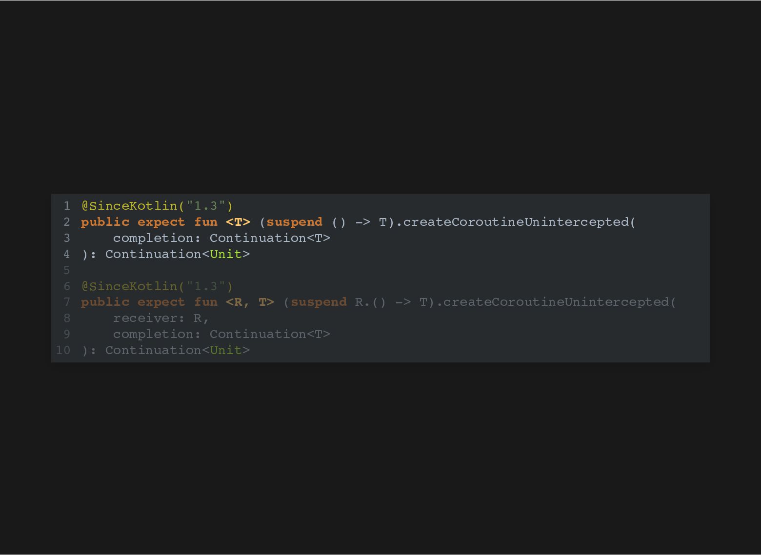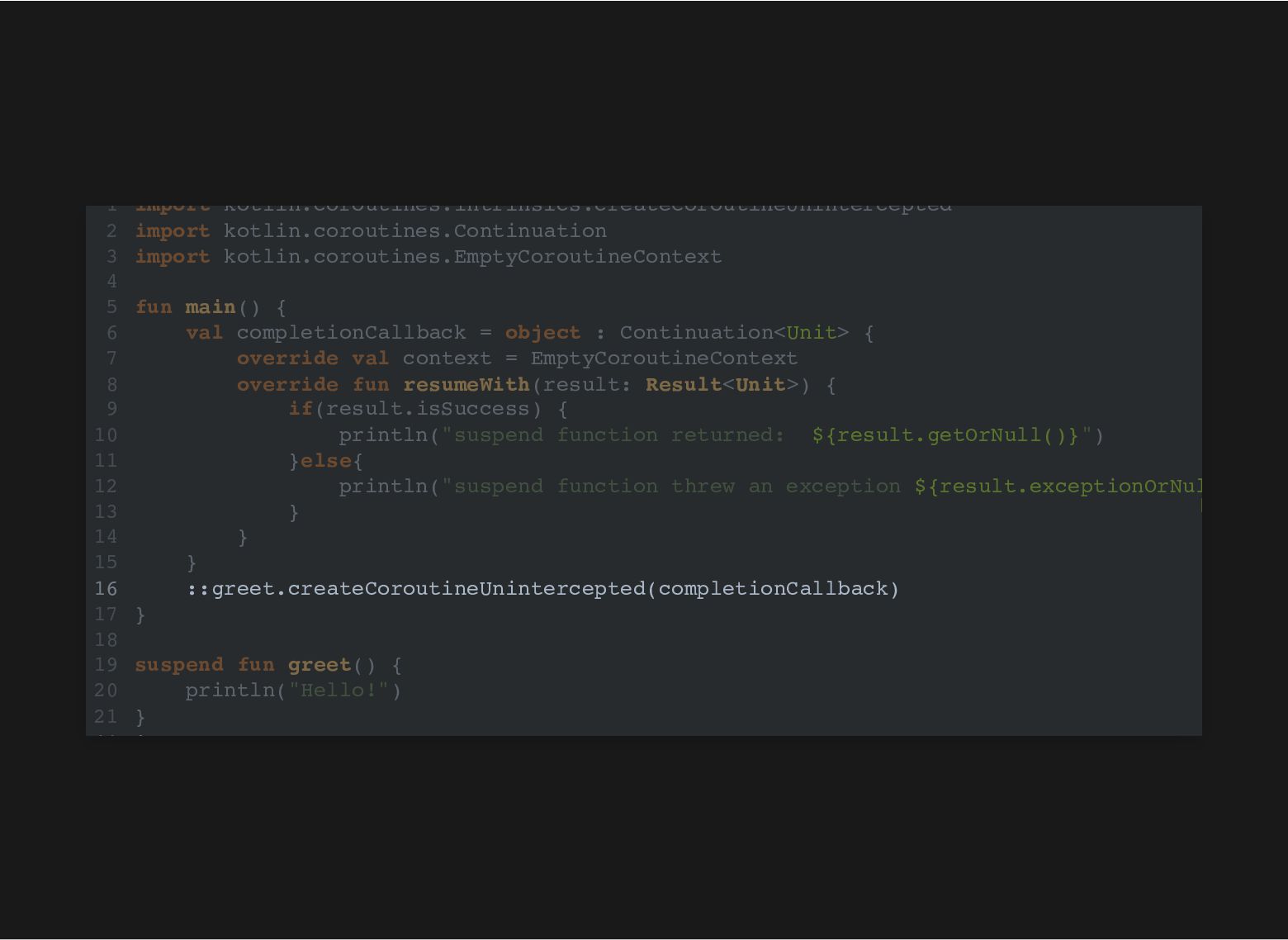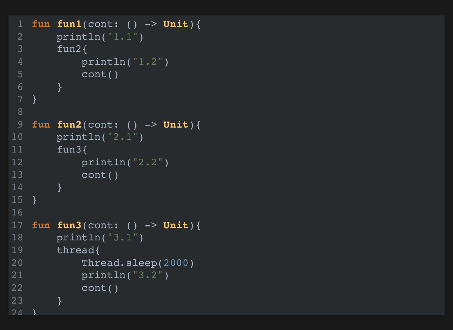 = object : Continuation<Unit>, CoroutineScope, Job { 3 init{ 4 context[Job]?.addChildren(this) 5 } 6 override val context = scopeContext + extraContext + this 7 override fun resumeWith(result: Result<Unit>) { 8 context[Job]?.waitForChildren() 9 } 10 } 11 12 val continuation = block.createCoroutineUnintercepted(completionCallback,complet 13 14 DispatchedContinuation(dispatcher,continuation).resumeWith(Result.success(Unit)) 15 } 16 val completionCallback = object : Continuation<Unit>, CoroutineScope, Job { fun CoroutineScope.launch(extraContext: CoroutineContext, block: suspend CoroutineSc 1 2 3 init{ 4 context[Job]?.addChildren(this) 5 } 6 override val context = scopeContext + extraContext + this 7 override fun resumeWith(result: Result<Unit>) { 8 context[Job]?.waitForChildren() 9 } 10 } 11 12 val continuation = block.createCoroutineUnintercepted(completionCallback,complet 13 14 DispatchedContinuation(dispatcher,continuation).resumeWith(Result.success(Unit)) 15 } 16 init{ context[Job]?.addChildren(this) } fun CoroutineScope.launch(extraContext: CoroutineContext, block: suspend CoroutineSc 1 2 val completionCallback = object : Continuation<Unit>, CoroutineScope, Job { 3 4 5 6 override val context = scopeContext + extraContext + this 7 override fun resumeWith(result: Result<Unit>) { 8 context[Job]?.waitForChildren() 9 } 10 } 11 12 val continuation = block.createCoroutineUnintercepted(completionCallback,complet 13 14 DispatchedContinuation(dispatcher,continuation).resumeWith(Result.success(Unit)) 15 } 16 context[Job]?.waitForChildren() fun CoroutineScope.launch(extraContext: CoroutineContext, block: suspend CoroutineSc 1 2 val completionCallback = object : Continuation<Unit>, CoroutineScope, Job { 3 init{ 4 context[Job]?.addChildren(this) 5 } 6 override val context = scopeContext + extraContext + this 7 override fun resumeWith(result: Result<Unit>) { 8 9 } 10 } 11 12 val continuation = block.createCoroutineUnintercepted(completionCallback,complet 13 14 DispatchedContinuation(dispatcher,continuation).resumeWith(Result.success(Unit)) 15 } 16 fun CoroutineScope.launch(extraContext: CoroutineContext, block: suspend CoroutineSc val completionCallback = object : Continuation<Unit>, CoroutineScope, Job { init{ context[Job]?.addChildren(this) } override val context = scopeContext + extraContext + this override fun resumeWith(result: Result<Unit>) { context[Job]?.waitForChildren() } } val continuation = block.createCoroutineUnintercepted(completionCallback,complet DispatchedContinuation(dispatcher,continuation).resumeWith(Result.success(Unit)) } 1 2 3 4 5 6 7 8 9 10 11 12 13 14 15 16