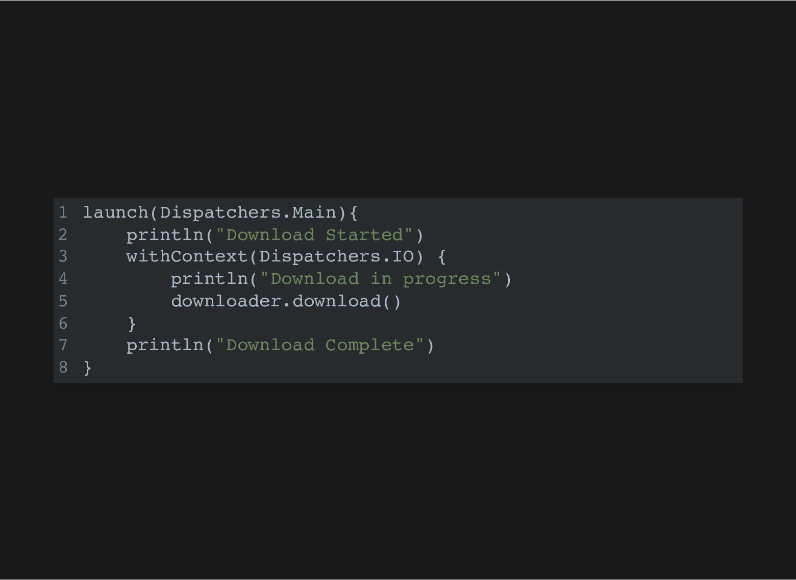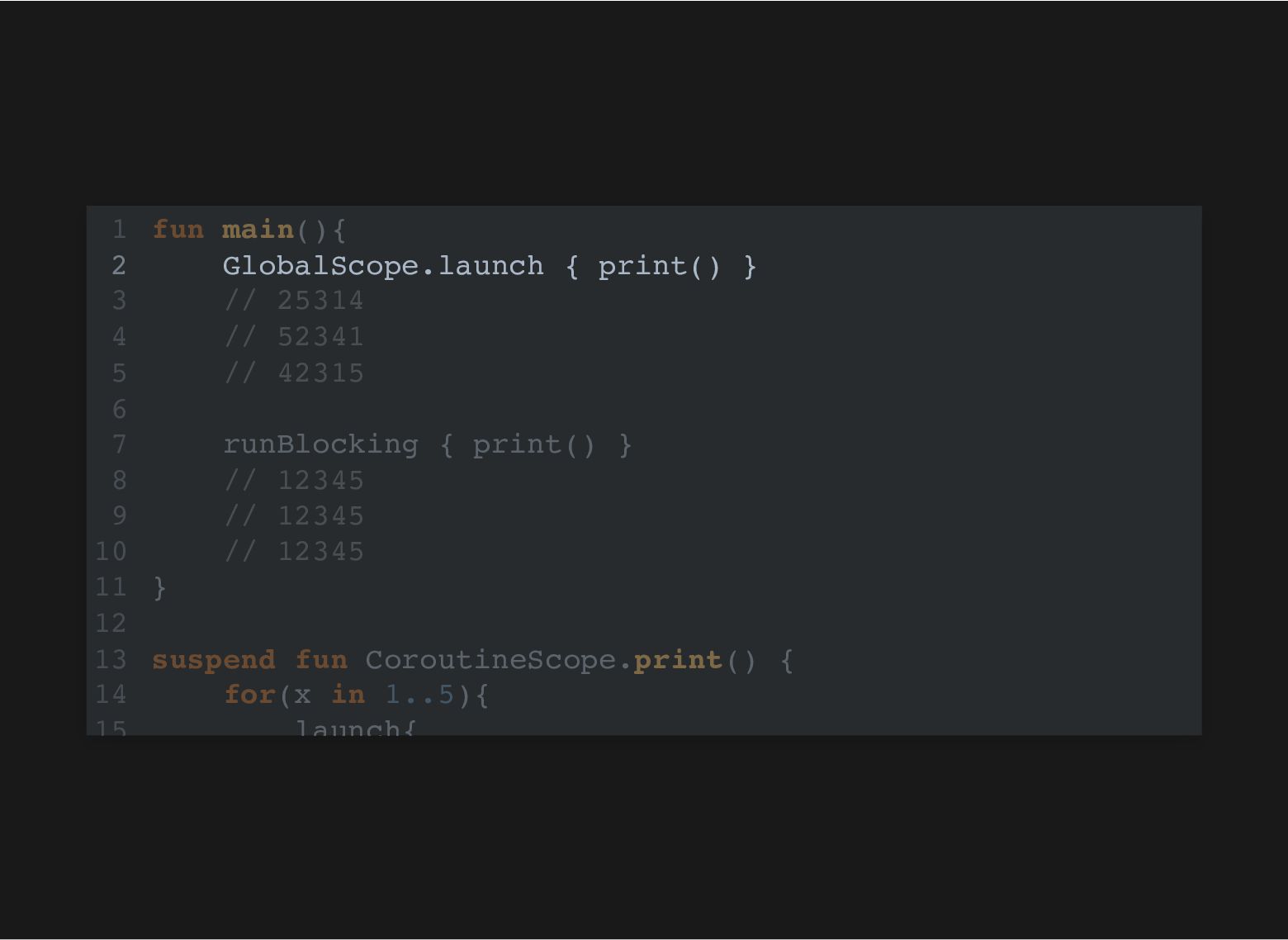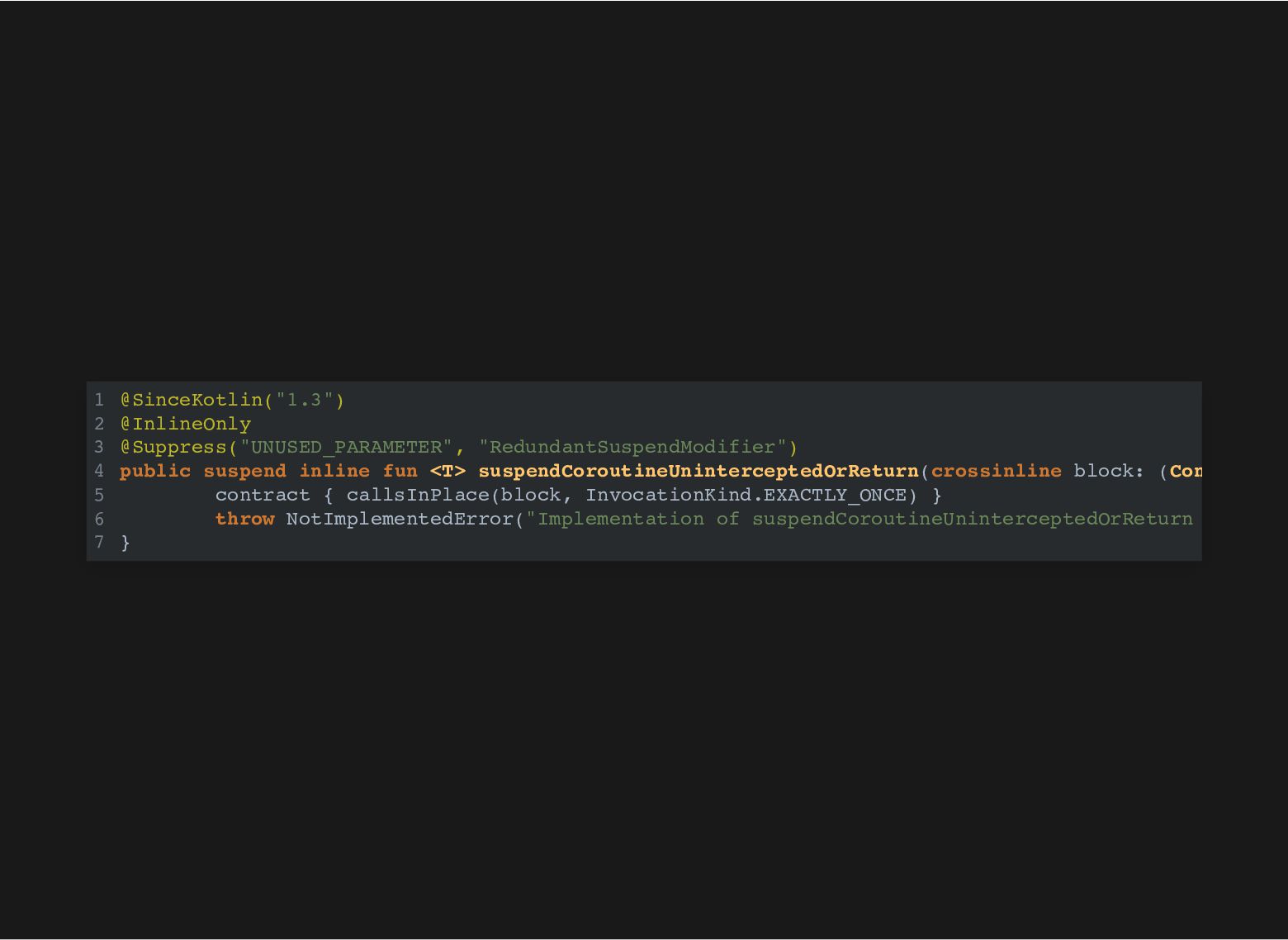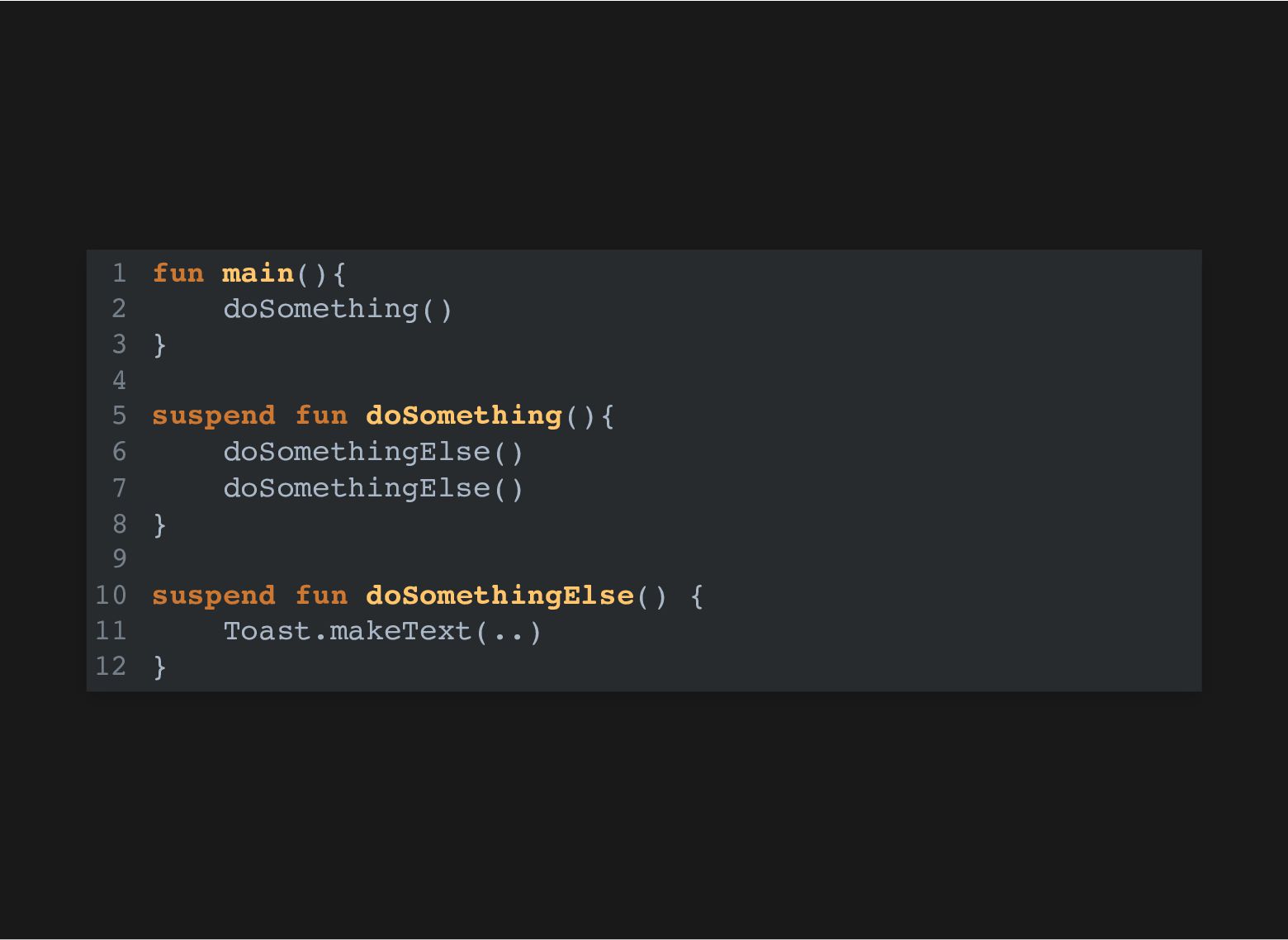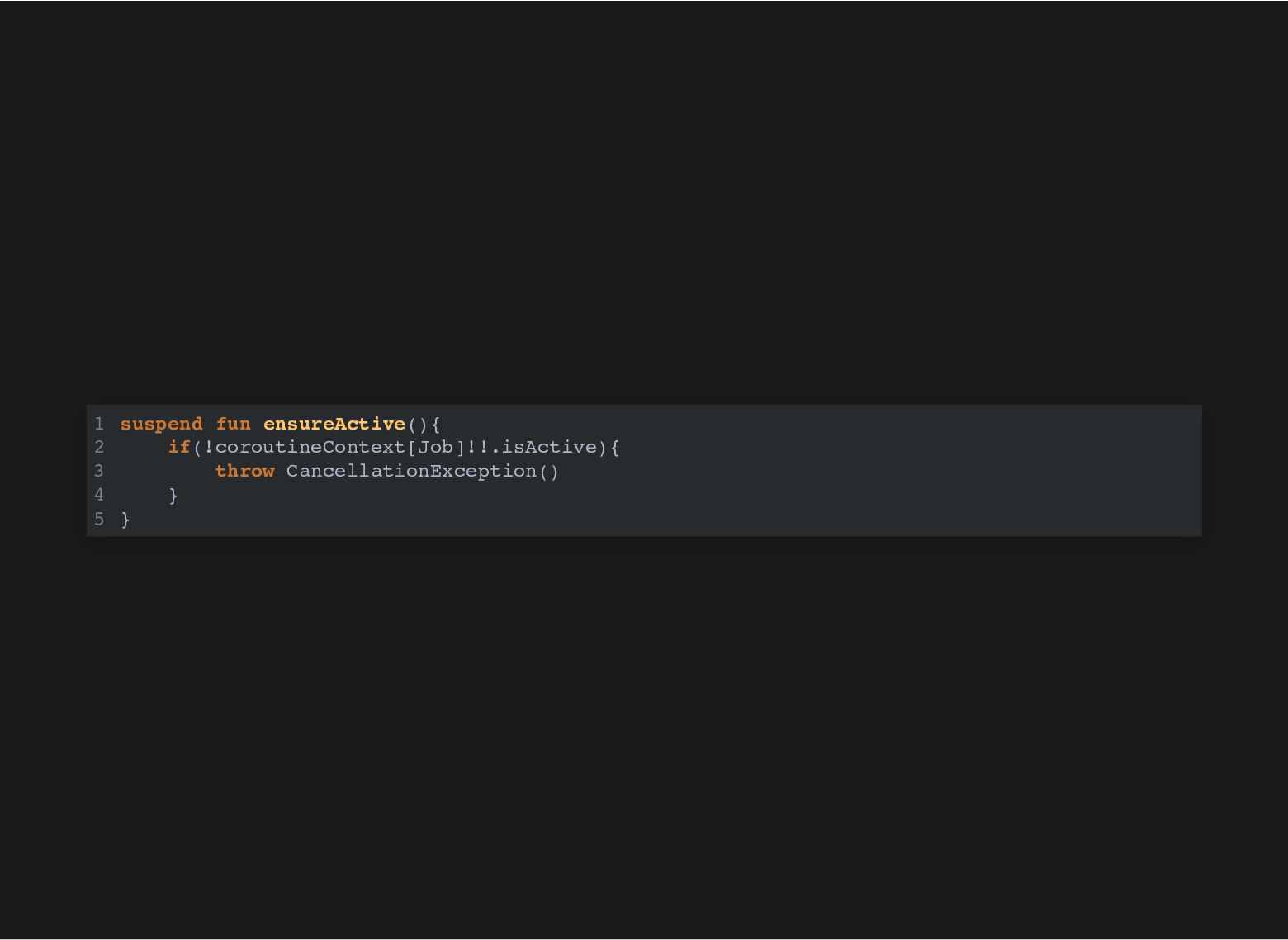 = object : Continuation<Unit>, CoroutineScope, Job { 3 init{ 4 context[Job]?.addChildren(this) 5 } 6 override val context = scopeContext + extraContext + this 7 override fun resumeWith(result: Result<Unit>) { 8 context[Job]?.waitForChildren() 9 } 10 } 11 12 val continuation = block.createCoroutineUnintercepted(completionCallback,complet 13 14 DispatchedContinuation(dispatcher,continuation).resumeWith(Result.success(Unit)) 15 } 16 val completionCallback = object : Continuation<Unit>, CoroutineScope, Job { fun CoroutineScope.launch(extraContext: CoroutineContext, block: suspend CoroutineSc 1 2 3 init{ 4 context[Job]?.addChildren(this) 5 } 6 override val context = scopeContext + extraContext + this 7 override fun resumeWith(result: Result<Unit>) { 8 context[Job]?.waitForChildren() 9 } 10 } 11 12 val continuation = block.createCoroutineUnintercepted(completionCallback,complet 13 14 DispatchedContinuation(dispatcher,continuation).resumeWith(Result.success(Unit)) 15 } 16 init{ context[Job]?.addChildren(this) } fun CoroutineScope.launch(extraContext: CoroutineContext, block: suspend CoroutineSc 1 2 val completionCallback = object : Continuation<Unit>, CoroutineScope, Job { 3 4 5 6 override val context = scopeContext + extraContext + this 7 override fun resumeWith(result: Result<Unit>) { 8 context[Job]?.waitForChildren() 9 } 10 } 11 12 val continuation = block.createCoroutineUnintercepted(completionCallback,complet 13 14 DispatchedContinuation(dispatcher,continuation).resumeWith(Result.success(Unit)) 15 } 16 context[Job]?.waitForChildren() fun CoroutineScope.launch(extraContext: CoroutineContext, block: suspend CoroutineSc 1 2 val completionCallback = object : Continuation<Unit>, CoroutineScope, Job { 3 init{ 4 context[Job]?.addChildren(this) 5 } 6 override val context = scopeContext + extraContext + this 7 override fun resumeWith(result: Result<Unit>) { 8 9 } 10 } 11 12 val continuation = block.createCoroutineUnintercepted(completionCallback,complet 13 14 DispatchedContinuation(dispatcher,continuation).resumeWith(Result.success(Unit)) 15 } 16 fun CoroutineScope.launch(extraContext: CoroutineContext, block: suspend CoroutineSc val completionCallback = object : Continuation<Unit>, CoroutineScope, Job { init{ context[Job]?.addChildren(this) } override val context = scopeContext + extraContext + this override fun resumeWith(result: Result<Unit>) { context[Job]?.waitForChildren() } } val continuation = block.createCoroutineUnintercepted(completionCallback,complet DispatchedContinuation(dispatcher,continuation).resumeWith(Result.success(Unit)) } 1 2 3 4 5 6 7 8 9 10 11 12 13 14 15 16