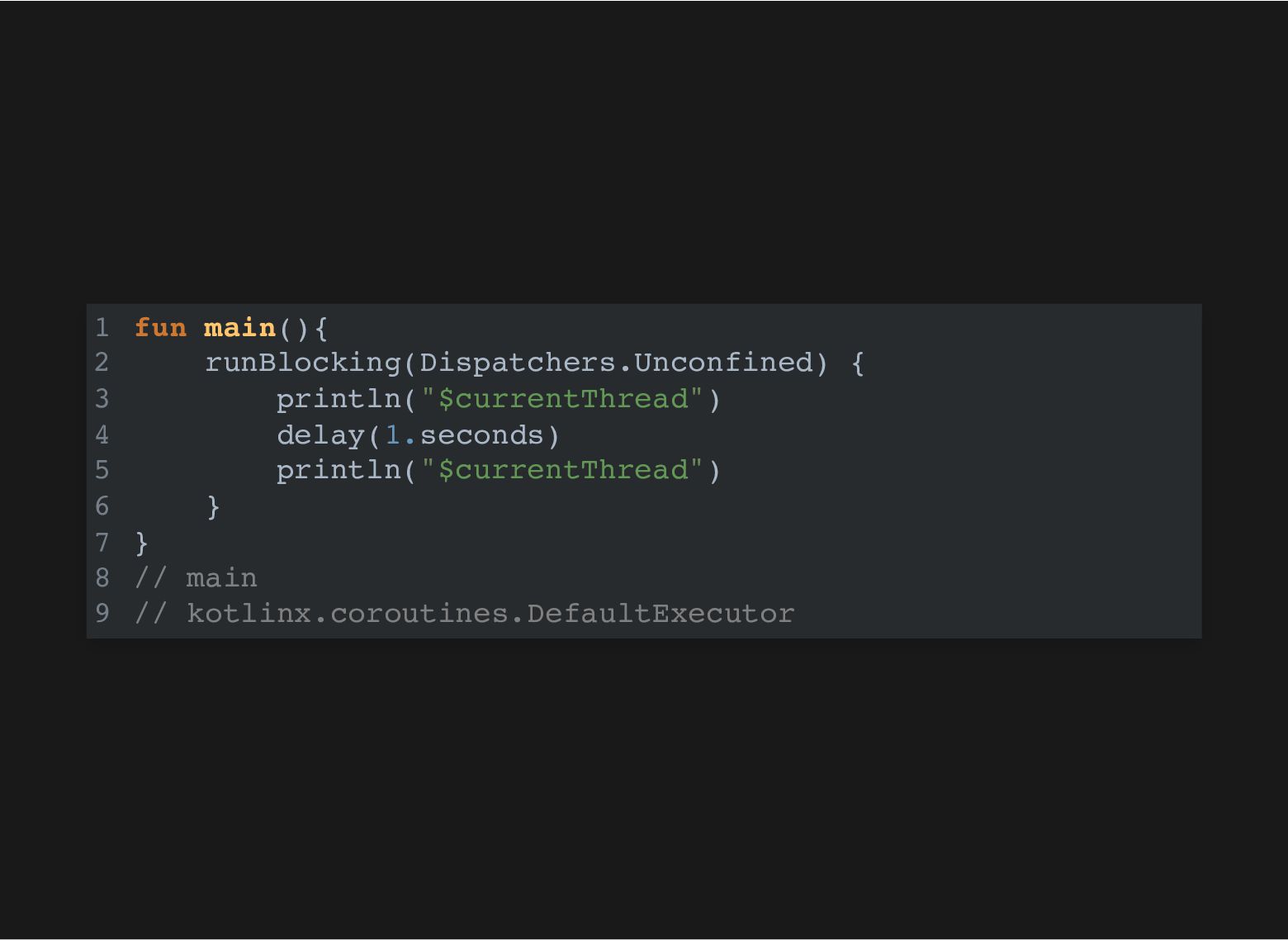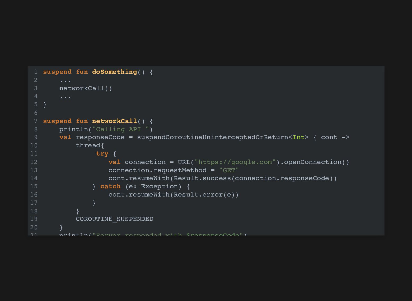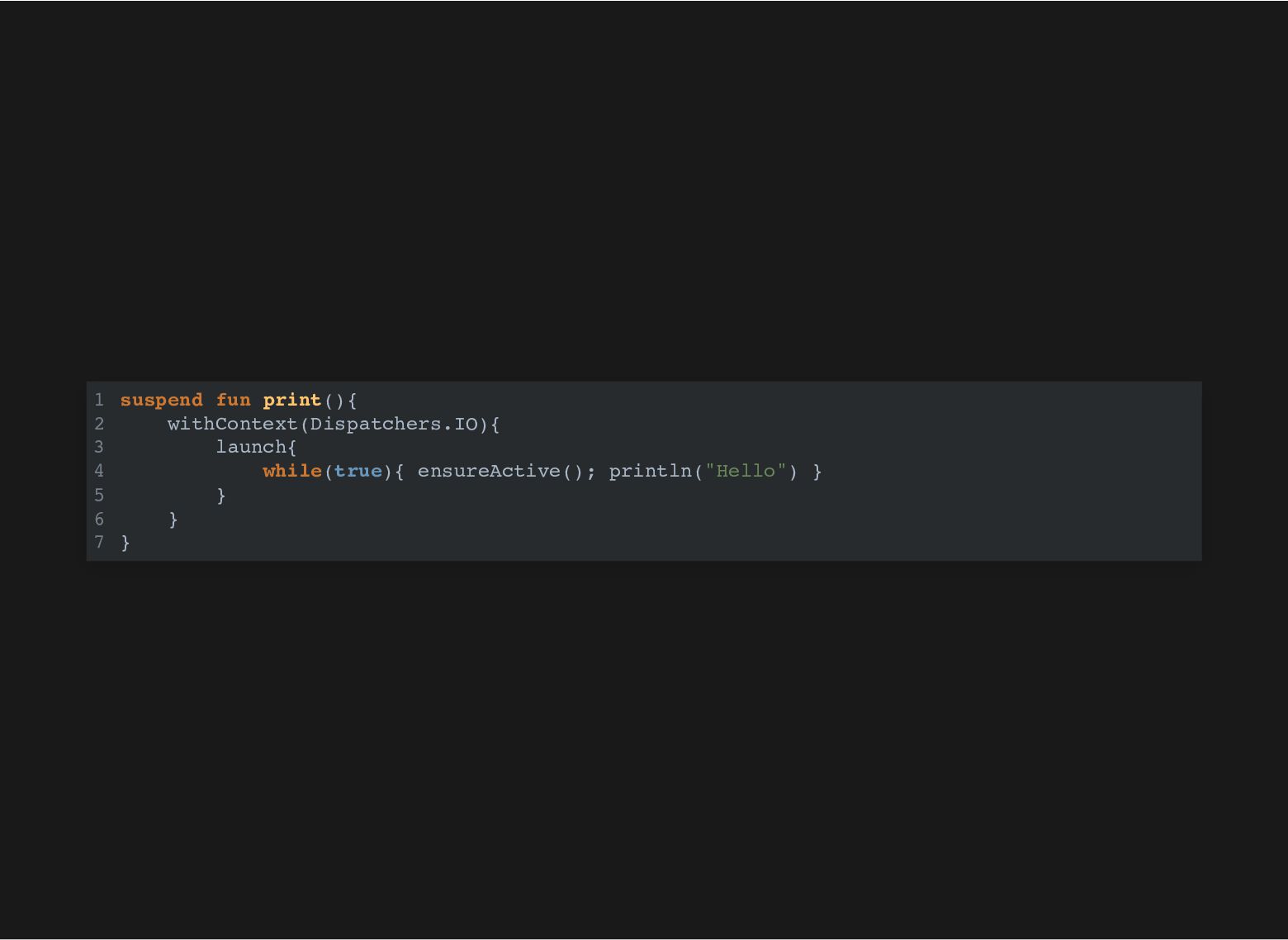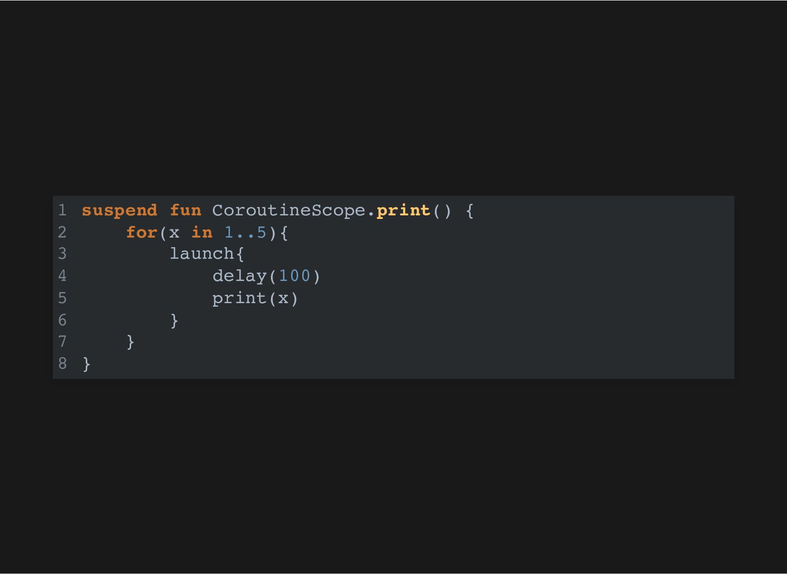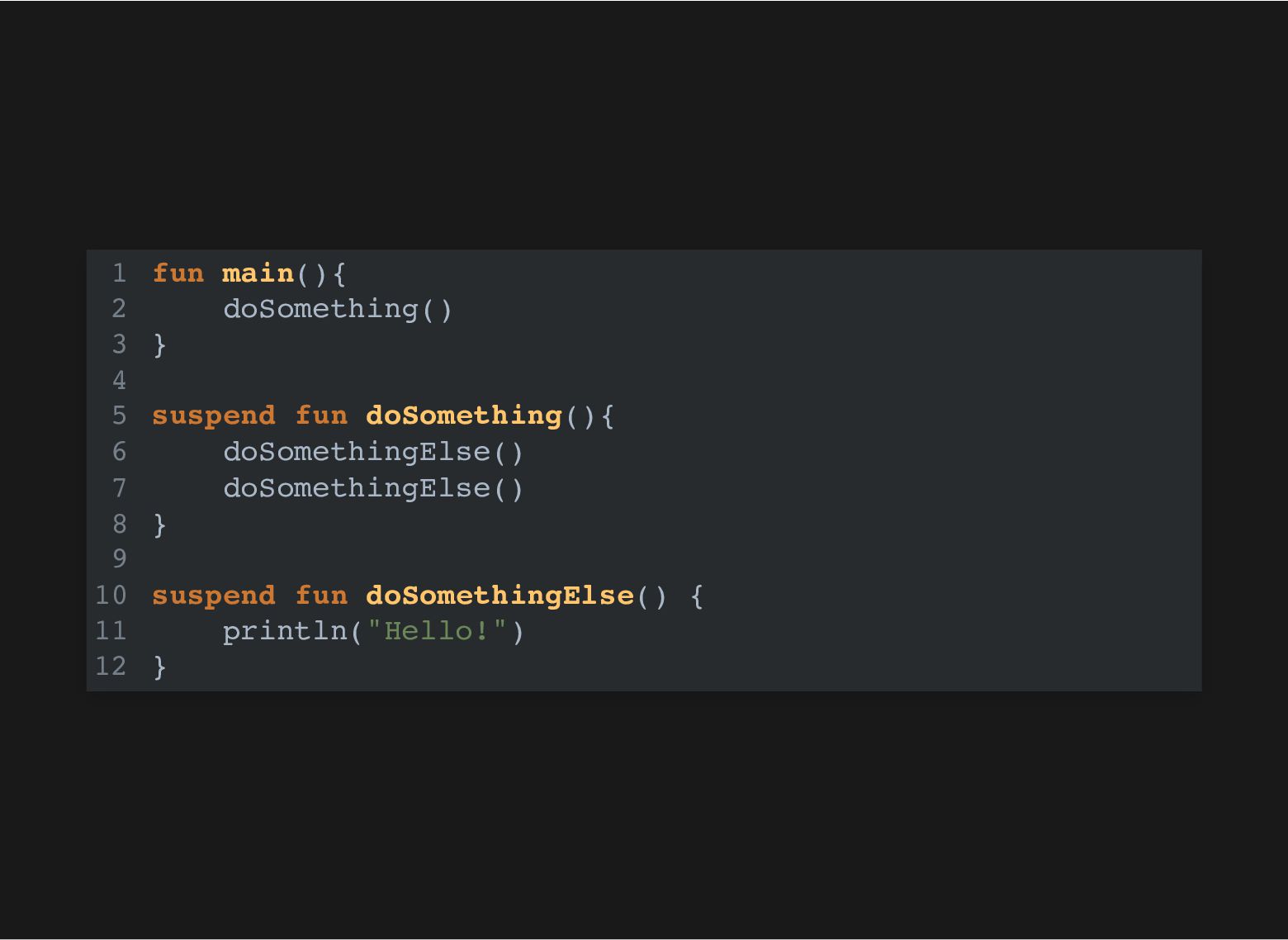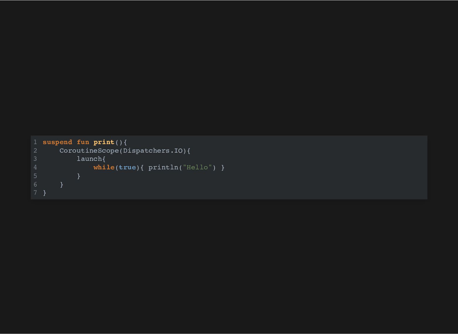 = object : Continuation<Unit>, CoroutineScope, Job { 3 init{ 4 context[Job]?.addChildren(this) 5 } 6 override val context = scopeContext + extraContext + this 7 override fun resumeWith(result: Result<Unit>) { 8 context[Job]?.waitForChildren() 9 } 10 } 11 12 val continuation = block.createCoroutineUnintercepted(completionCallback,complet 13 14 DispatchedContinuation(dispatcher,continuation).resumeWith(Result.success(Unit)) 15 } 16 val completionCallback = object : Continuation<Unit>, CoroutineScope, Job { fun CoroutineScope.launch(extraContext: CoroutineContext, block: suspend CoroutineSc 1 2 3 init{ 4 context[Job]?.addChildren(this) 5 } 6 override val context = scopeContext + extraContext + this 7 override fun resumeWith(result: Result<Unit>) { 8 context[Job]?.waitForChildren() 9 } 10 } 11 12 val continuation = block.createCoroutineUnintercepted(completionCallback,complet 13 14 DispatchedContinuation(dispatcher,continuation).resumeWith(Result.success(Unit)) 15 } 16 init{ context[Job]?.addChildren(this) } fun CoroutineScope.launch(extraContext: CoroutineContext, block: suspend CoroutineSc 1 2 val completionCallback = object : Continuation<Unit>, CoroutineScope, Job { 3 4 5 6 override val context = scopeContext + extraContext + this 7 override fun resumeWith(result: Result<Unit>) { 8 context[Job]?.waitForChildren() 9 } 10 } 11 12 val continuation = block.createCoroutineUnintercepted(completionCallback,complet 13 14 DispatchedContinuation(dispatcher,continuation).resumeWith(Result.success(Unit)) 15 } 16 context[Job]?.waitForChildren() fun CoroutineScope.launch(extraContext: CoroutineContext, block: suspend CoroutineSc 1 2 val completionCallback = object : Continuation<Unit>, CoroutineScope, Job { 3 init{ 4 context[Job]?.addChildren(this) 5 } 6 override val context = scopeContext + extraContext + this 7 override fun resumeWith(result: Result<Unit>) { 8 9 } 10 } 11 12 val continuation = block.createCoroutineUnintercepted(completionCallback,complet 13 14 DispatchedContinuation(dispatcher,continuation).resumeWith(Result.success(Unit)) 15 } 16 fun CoroutineScope.launch(extraContext: CoroutineContext, block: suspend CoroutineSc val completionCallback = object : Continuation<Unit>, CoroutineScope, Job { init{ context[Job]?.addChildren(this) } override val context = scopeContext + extraContext + this override fun resumeWith(result: Result<Unit>) { context[Job]?.waitForChildren() } } val continuation = block.createCoroutineUnintercepted(completionCallback,complet DispatchedContinuation(dispatcher,continuation).resumeWith(Result.success(Unit)) } 1 2 3 4 5 6 7 8 9 10 11 12 13 14 15 16