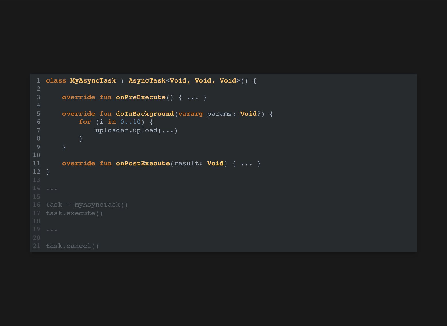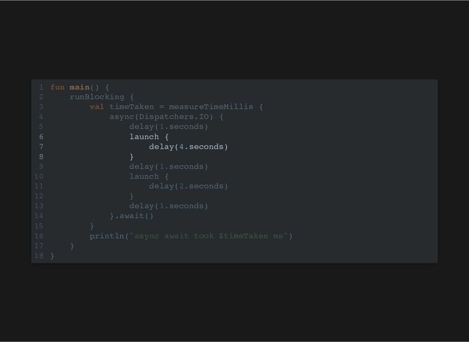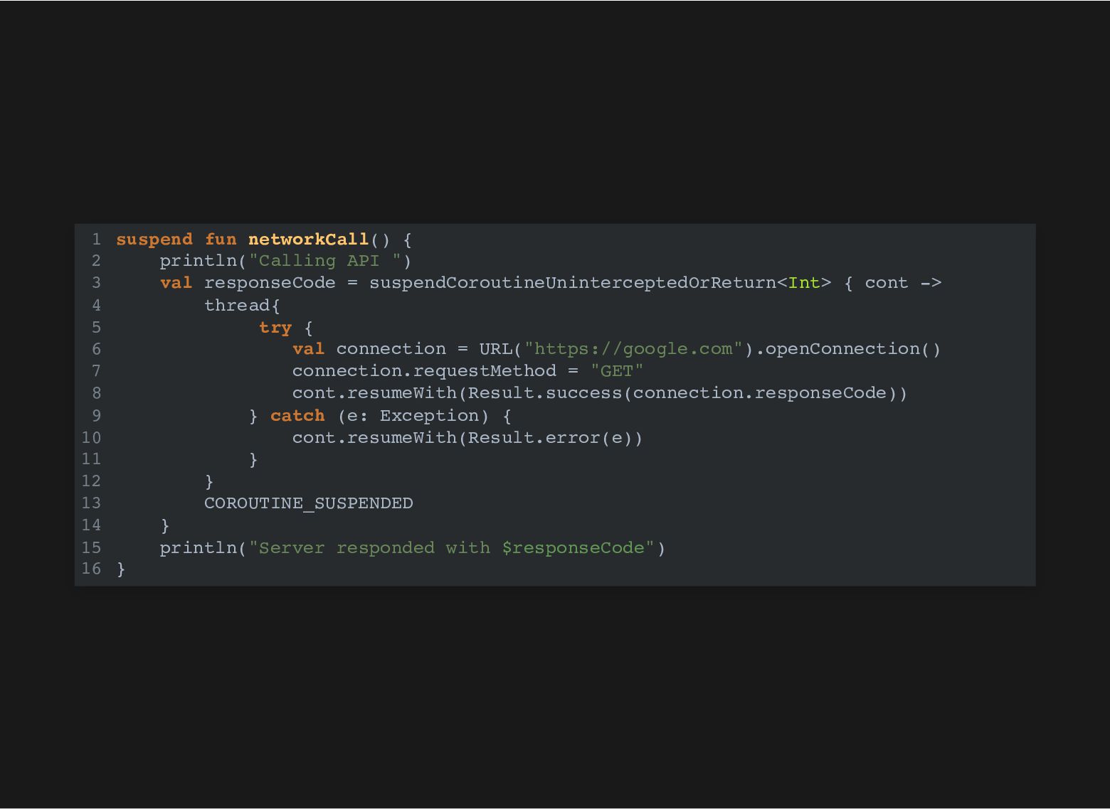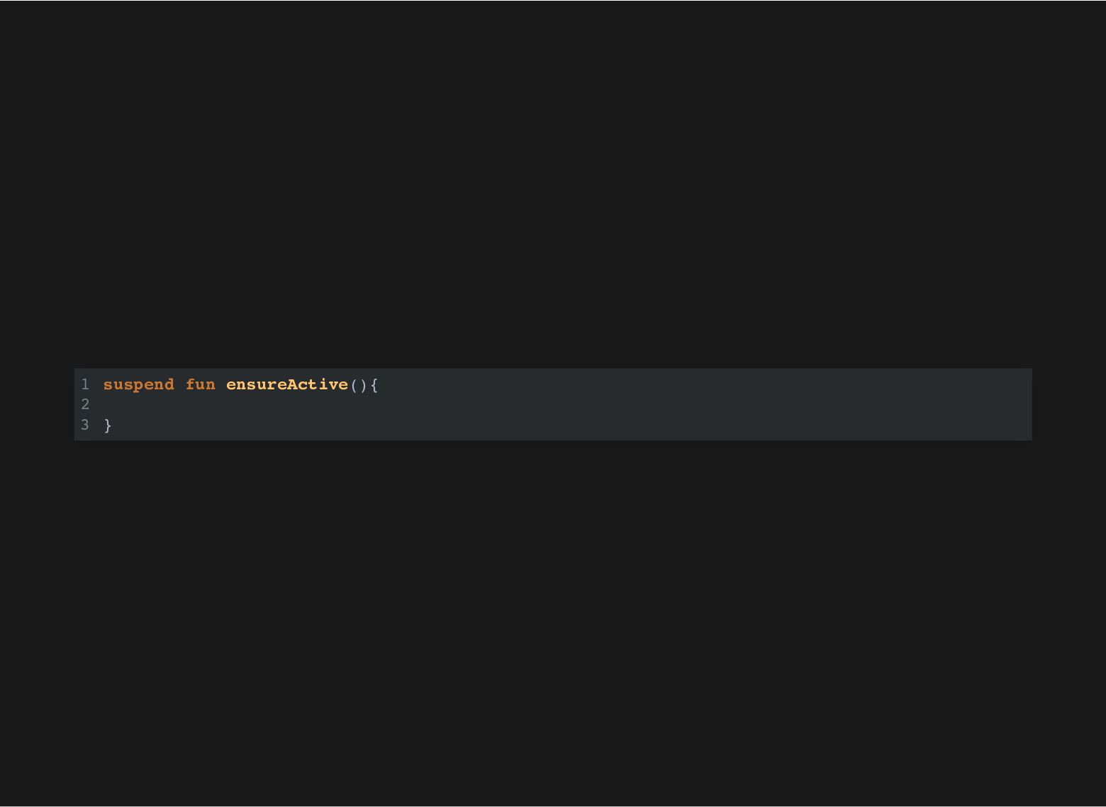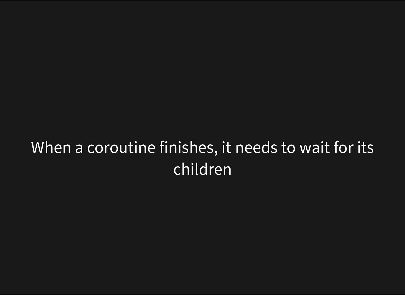 = object : Continuation<Unit>, CoroutineScope, Job { 3 init{ 4 context[Job]?.addChildren(this) 5 } 6 override val context = scopeContext + extraContext + this 7 override fun resumeWith(result: Result<Unit>) { 8 context[Job]?.waitForChildren() 9 } 10 } 11 12 val continuation = block.createCoroutineUnintercepted(completionCallback,complet 13 14 DispatchedContinuation(dispatcher,continuation).resumeWith(Result.success(Unit)) 15 } 16 val completionCallback = object : Continuation<Unit>, CoroutineScope, Job { fun CoroutineScope.launch(extraContext: CoroutineContext, block: suspend CoroutineSc 1 2 3 init{ 4 context[Job]?.addChildren(this) 5 } 6 override val context = scopeContext + extraContext + this 7 override fun resumeWith(result: Result<Unit>) { 8 context[Job]?.waitForChildren() 9 } 10 } 11 12 val continuation = block.createCoroutineUnintercepted(completionCallback,complet 13 14 DispatchedContinuation(dispatcher,continuation).resumeWith(Result.success(Unit)) 15 } 16 init{ context[Job]?.addChildren(this) } fun CoroutineScope.launch(extraContext: CoroutineContext, block: suspend CoroutineSc 1 2 val completionCallback = object : Continuation<Unit>, CoroutineScope, Job { 3 4 5 6 override val context = scopeContext + extraContext + this 7 override fun resumeWith(result: Result<Unit>) { 8 context[Job]?.waitForChildren() 9 } 10 } 11 12 val continuation = block.createCoroutineUnintercepted(completionCallback,complet 13 14 DispatchedContinuation(dispatcher,continuation).resumeWith(Result.success(Unit)) 15 } 16 context[Job]?.waitForChildren() fun CoroutineScope.launch(extraContext: CoroutineContext, block: suspend CoroutineSc 1 2 val completionCallback = object : Continuation<Unit>, CoroutineScope, Job { 3 init{ 4 context[Job]?.addChildren(this) 5 } 6 override val context = scopeContext + extraContext + this 7 override fun resumeWith(result: Result<Unit>) { 8 9 } 10 } 11 12 val continuation = block.createCoroutineUnintercepted(completionCallback,complet 13 14 DispatchedContinuation(dispatcher,continuation).resumeWith(Result.success(Unit)) 15 } 16 fun CoroutineScope.launch(extraContext: CoroutineContext, block: suspend CoroutineSc val completionCallback = object : Continuation<Unit>, CoroutineScope, Job { init{ context[Job]?.addChildren(this) } override val context = scopeContext + extraContext + this override fun resumeWith(result: Result<Unit>) { context[Job]?.waitForChildren() } } val continuation = block.createCoroutineUnintercepted(completionCallback,complet DispatchedContinuation(dispatcher,continuation).resumeWith(Result.success(Unit)) } 1 2 3 4 5 6 7 8 9 10 11 12 13 14 15 16