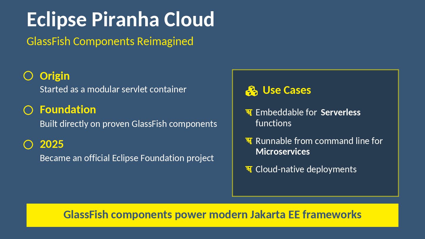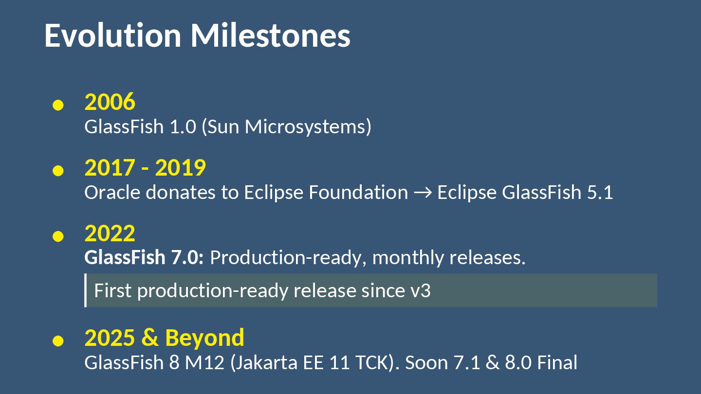 For years, GlassFish was seen only as the reference implementation of Java EE and later Jakarta EE, useful only for demos. in 2025, It’s not true anymore and it hasn't been true for a while. In this talk, core Eclipse GlassFish project members will explore how GlassFish has matured into a modern, reliable, and cloud-ready runtime for Jakarta EE applications in production. Like Tomcat and Jetty, GlassFish is now a production-ready Java server actively maintained under an open-source foundation, and backed by commercial companies like OmniFish or Fujitsu.