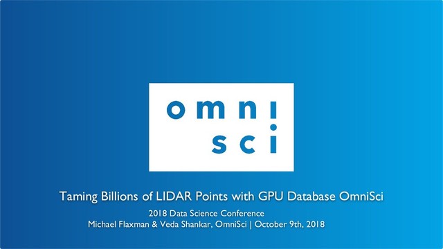 & LIDAR ◦ LIDAR data is typically available in local coordinate systems ◦ OmniSci ver4 supports Web Mercator & Geographic Coordinates (WGS84 lat/lon) ◦ Back-projection into Geo-coordinates usually required • LIDAR to OmniSci Readable Format ◦ PDAL is the best tool to convert LIDAR files to formats readable by OmniSci ◦ PDAL is an open source library installable locally using Conda ▪ conda install -c mathieu pdal ◦ PDAL Docker image available for easy execution ▪ !sudo docker run -v {laz_dir}:/data:z pdal/pdal:1.7 pdal translate -i /data/{laz_file} -o /data/{csv_file} -f filters.reprojection --filters.reprojection.out_srs="EPSG:4326"