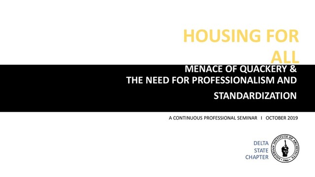 & Professional Quackery – Definition, Instances • Quackery – Causes, Dangers • Who is a Professional – Built Environment • What makes the Professional Stand Out • Building Collapse – the dangerous aftermath of Professional Quackery • Case Studies in Lagos • Conclusion DELTA STATE CHAPTER MAIN THEME #HOUSING FOR ALL SUB THEME PROFESSIONAL QUACKERY & THE NEED FOR STANDARDIZATION LAGOS STATE CHAPTER
