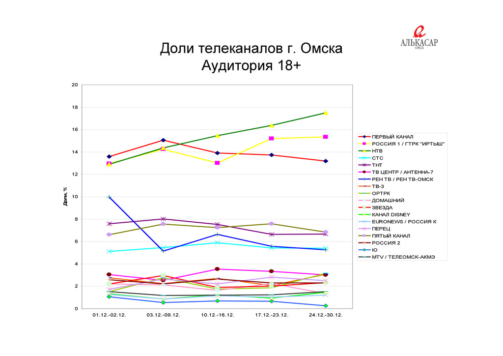 Длительность День недели Рейтинг Аудитория, тыс.чел Доли, % Охват, % 1 ПЯТЫЙ КАНАЛ 05.12.12 След 22:16:46 00:43:17 Среда 8,63 83,22 20,54 95,15 1 ПЯТЫЙ КАНАЛ 05.12.12 След 22:16:46 00:43:17 Среда 8,63 83,22 20,54 95,15 2 ПЯТЫЙ КАНАЛ 03.12.12 Сейчас (22:00) 23:00:04 00:24:19 Понедельник 6,08 58,57 20,21 80,48 3 ПЯТЫЙ КАНАЛ 03.12.12 Детективы 21:00:23 00:29:04 Понедельник 5,15 49,63 14,94 64,36 4 ПЯТЫЙ КАНАЛ 14.12.12 Противостояние 13:30:06 02:59:47 Пятница 4,39 42,27 20,3 78,81 5 ПЯТЫЙ КАНАЛ 16.12.12 Группа Zeta - 2 22:17:31 00:49:56 Воскресенье 4,07 39,2 9,09 67,4 6 ПЕРЕЦ 21.12.12 Улетное видео по-русски 11:22:07 00:07:05 Пятница 3,87 37,27 19,22 39,78 7 ПЯТЫЙ КАНАЛ 13.12.12 Место происшествия (15:00) 15:58:05 00:31:58 Четверг 3,87 37,26 17,21 52,94 8 ПЯТЫЙ КАНАЛ 25.12.12 Открытая студия (5 КАНАЛ) 17:00:23 01:02:32 Вторник 3,54 34,15 15,59 58,78 9 ПЯТЫЙ КАНАЛ 13.12.12 Сейчас (18.30) 19:30:04 00:30:14 Четверг 3,44 33,19 9,26 71,31 10 ПЯТЫЙ КАНАЛ 05.12.12 Сейчас (12:00) 13:00:03 00:31:02 Среда 3,42 32,92 25,76 32,92 11 ПЕРЕЦ 13.12.12 Стыдно, когда видно! 24:00:05 00:30:45 Четверг 3,31 31,92 11,78 53,97 Й 12 ПЯТЫЙ КАНАЛ 05.12.12 Агент национальной безопасности 12:29:45 00:30:11 Среда 3,25 31,29 21,26 37,36 13 ПЕРЕЦ 13.12.12 Улетные животные 19:30:06 00:30:12 Четверг 3,24 31,2 8,7 59,56 14 ПЯТЫЙ КАНАЛ 25.12.12 Сейчас (15:30) 16:30:05 00:30:18 Вторник 3,24 31,2 16,74 42,48 15 ПЯТЫЙ КАНАЛ 12.12.12 Группа Zeta 14:02:37 00:57:33 Среда 3,19 30,72 15,64 59,52 16 РОССИЯ 2 29.12.12 Биатлон. Рождественская гонка "звезд" 23:28:47 00:41:27 Суббота 3,11 29,93 8,66 40,01 17 РОССИЯ 2 11 12 12 Биатлон Кубок мира 2012 2013 Эстафета 17:49:59 01:44:25 Вторник 3 1 29 87 10 43 71 73 17 РОССИЯ 2 11.12.12 Биатлон. Кубок мира 2012-2013. Эстафета 17:49:59 01:44:25 Вторник 3,1 29,87 10,43 71,73 18 ПЯТЫЙ КАНАЛ 21.12.12 Место происшествия (18:00) 18:57:53 00:32:11 Пятница 3,04 29,35 11,13 53,41 19 РОССИЯ 2 12.12.12 Улицы разбитых фонарей. Менты-3 21:06:19 00:55:31 Среда 2,96 28,57 6,24 54,07 20 РОССИЯ 2 17.12.12 Профессиональный бокс 22:19:51 04:33:45 Понедельник 2,93 28,23 13,1 105,73 21 ДОМАШНИЙ 28.12.12 Богиня прайм-тайма 12:51:11 00:47:42 Пятница 2,93 28,23 16,76 47,92 22 ПЯТЫЙ КАНАЛ 17 12 12 Место происшествия 18:57:55 00:32:09 Понедельник 2 84 27 4 9 92 73 43 22 ПЯТЫЙ КАНАЛ 17.12.12 Место происшествия 18:57:55 00:32:09 Понедельник 2,84 27,4 9,92 73,43 23 ПЯТЫЙ КАНАЛ 01.12.12 Сейчас (10:00) 11:00:05 00:10:09 Суббота 2,82 27,13 13,97 34,26 24 КАНАЛ DISNEY 09.12.12 Финес и Ферб. Покорение 2-го измерения 11:12:39 01:14:59 Воскресенье 2,81 27,11 12,12 55,52 25 ПЯТЫЙ КАНАЛ 13.12.12 Не может быть! 14:05:18 01:52:47 Четверг 2,81 27,08 12,53 92,48 26 ЗВЕЗДА 09.12.12 Пираты ХХ века 18:18:24 01:35:42 Воскресенье 2,8 27,01 7,23 62,95 27 ПЕРЕЦ 26.12.12 Вне закона. Риэлторы с большой дороги 15:58:58 00:30:09 Среда 2,79 26,91 15,81 37,4 Ц р р р 28 ПЕРЕЦ 26.12.12 Вне закона. Схватка за мужика 16:29:07 00:30:25 Среда 2,78 26,78 14,16 50,95 29 ПЯТЫЙ КАНАЛ 20.12.12 Белые росы 14:04:17 01:53:49 Четверг 2,75 26,54 11,59 79,63 30 РОССИЯ 2 19.12.12 Хоккей. КХЛ. Открытый чемпионат России 21:06:00 01:03:37 Среда 2,74 26,42 6,18 62,72