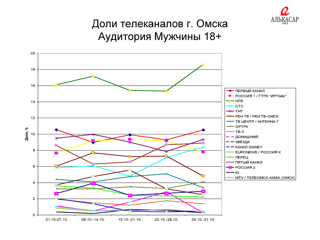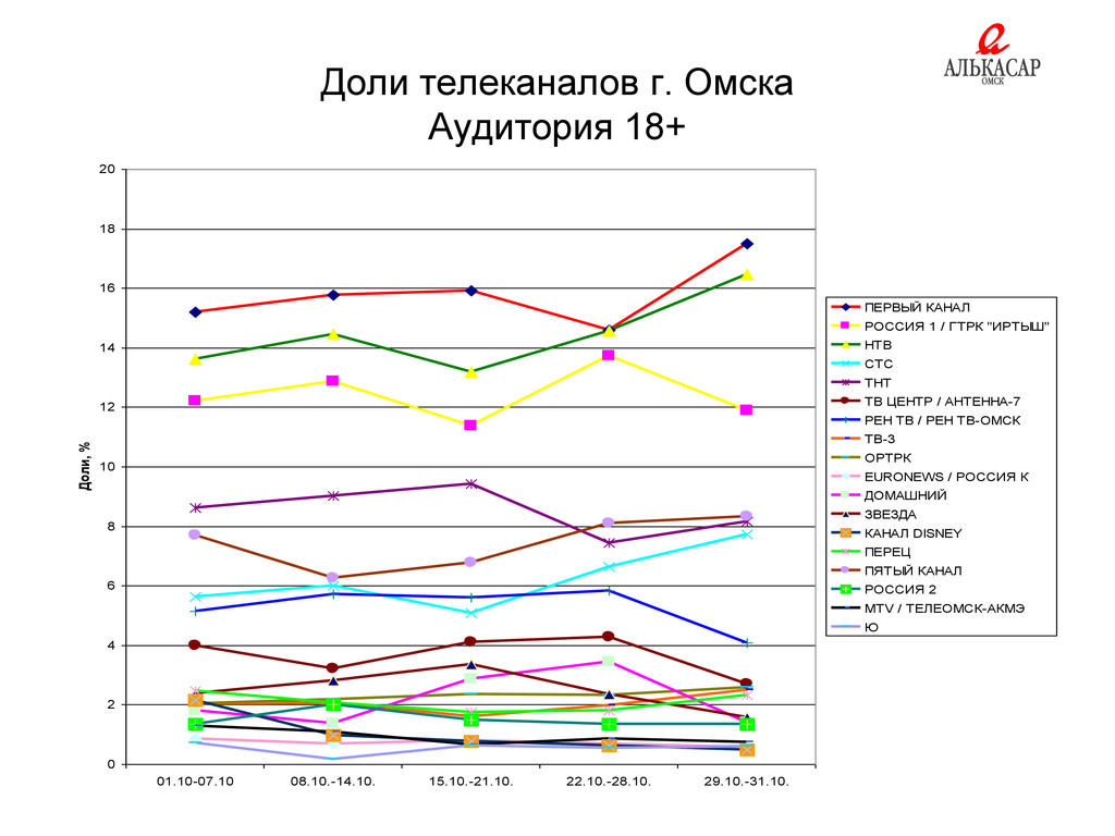Длительность День недели Рейтинг Аудитор ия, тыс.чел Доли,% Охват, % 1 ПЕРВЫЙ КАНАЛ 01.10.12 Пусть говорят 20:54:16 01:05:43 Понедельник 13,54 130,5 29,64 255,46 2 ПЕРВЫЙ КАНАЛ 31.10.12 Время 22:00:02 00:30:26 Среда 11,3 108,96 24,19 204,18 3 НТВ 10.10.12 Карпов 22:24:38 00:50:04 Среда 10,88 104,84 25,08 172,54 4 ПЕРВЫЙ КАНАЛ 15.10.12 Однолюбы 22:30:45 02:02:05 Понедельник 10,66 102,72 31,15 184,61 5 ПЕРВЫЙ КАНАЛ 07.10.12 Большие гонки. Братство колец 18:23:01 01:35:10 Воскресенье 10,25 98,78 27,48 162,03 6 ПЕРВЫЙ КАНАЛ 20.10.12 Минута славы шагает по стране 20:13:17 01:46:42 Суббота 9,66 93,06 21,11 173,64 7 НТВ 25.10.12 Пятницкий. Глава вторая 21:30:42 00:55:27 Четверг 9,38 90,4 24,31 150,66 8 НТВ 27.10.12 Русские сенсации. 20:58:56 00:59:19 Суббота 9,21 88,77 26,34 167,55 9 РОССИЯ 1 28.10.12 Вести недели 20:59:59 01:31:35 Воскресенье 8,88 85,63 20,69 247,15 10 НТВ 21.10.12 Чистосердечное признание 20:01:41 00:50:06 Воскресенье 8,75 84,32 22,25 147,18 11 ТНТ 30.10.12 Универ. Новая общага 20:30:55 00:31:08 Вторник 8,73 84,13 23,07 108,9 12 НТВ 22.10.12 Инспектор Купер 20:29:27 00:59:09 Понедельник 8,72 84,08 23,47 129,21 13 ТНТ 19.10.12 Битва экстрасенсов 20:00:07 01:01:41 Пятница 8,7 83,85 22,88 116,19 14 ТНТ 30.10.12 Интерны 20:00:06 00:30:49 Вторник 8,63 83,18 26,06 100,89 15 ПЕРВЫЙ КАНАЛ 27.10.12 Сегодня вечером 22:19:39 01:36:13 Суббота 8,42 81,12 22,52 202,37 16 РОССИЯ 1 13.10.12 Деревенская история 21:57:14 03:47:48 Суббота 8,15 78,56 25,6 207,38 17 ПЕРВЫЙ КАНАЛ 19.10.12 Голос 22:30:18 01:52:17 Пятница 8,15 78,56 22,64 189,17 18 РОССИЯ 1 28.10.12 Мечты из пластилина 22:31:34 01:51:57 Воскресенье 8,15 78,52 24,54 160,64 19 ПЕРВЫЙ КАНАЛ 14.10.12 Воскресное "Время". 22:00:05 01:02:28 Воскресенье 8,03 77,37 19,07 178,48 20 ПЕРВЫЙ КАНАЛ 18.10.12 Развод 22:30:07 01:59:42 Четверг 7,95 76,64 23,43 165,83 21 НТВ 07.10.12 Центральное телевидение. 20:48:41 01:00:00 Воскресенье 7,82 75,34 16,75 214,48 22 НТВ 21.10.12 Сегодня. Итоговая программа 19:00:05 00:59:39 Воскресенье 7,68 73,98 23,81 175,87 23 РОССИЯ 1 14.10.12 Путь к себе 13:17:03 00:59:45 Воскресенье 7,66 73,8 32,02 99,81 24 ПЕРВЫЙ КАНАЛ 14.10.12 КВН - 2012. Высшая лига 19:46:30 02:13:27 Воскресенье 7,57 73 17,33 221,96 25 ПЕРВЫЙ КАНАЛ 05.10.12 Вечерние новости 19:00:10 00:44:28 Пятница 7,36 70,98 30,1 132,59 26 ПЕРВЫЙ КАНАЛ 20.10.12 Человек и закон 19:11:15 01:02:02 Суббота 7,31 70,49 19,68 189,63 27 РОССИЯ 1 10.10.12 Прямой эфир 21:42:00 00:46:48 Среда 7,26 69,99 16,28 130,09 28 ПЕРВЫЙ КАНАЛ 04.10.12 Чкалов 23:33:28 00:56:50 Четверг 7,1 68,41 27,48 107,09 29 НТВ 27.10.12 Ты не поверишь! 21:58:15 00:58:43 Суббота 7,09 68,36 19,09 154,57 30 НТВ 24.10.12 Мой грех 19:32:54 01:59:55 Среда 7,09 68,3 19,15 194,39