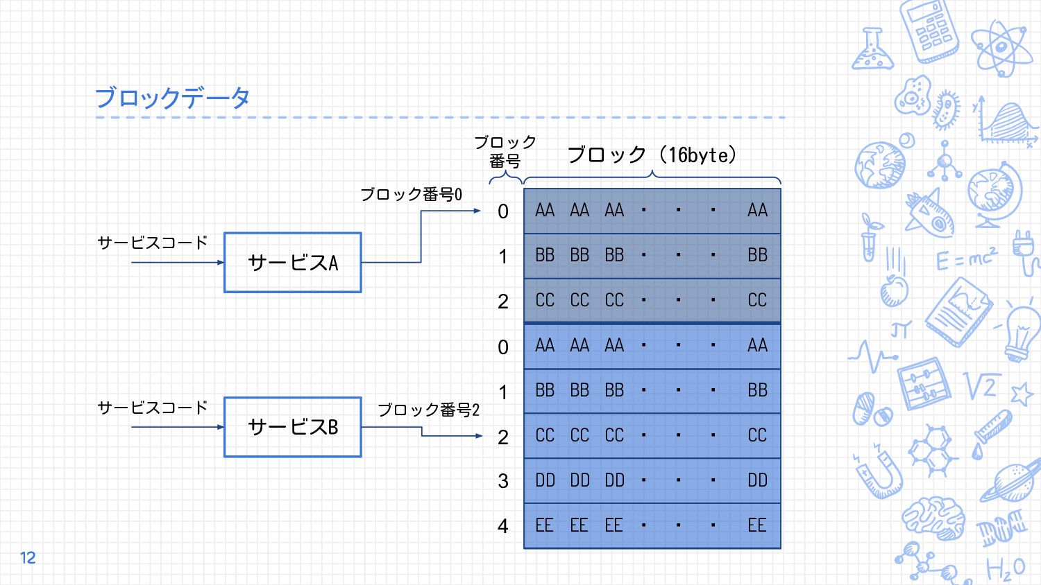AA BB CC AA BB CC DD EE AA BB CC AA BB CC DD EE AA BB CC AA BB CC DD EE ・ ・ ・ ・ ・ ・ ・ ・ ・ ・ ・ ・ ・ ・ ・ ・ ・ ・ ・ ・ ・ ・ ・ ・ AA BB CC AA BB CC DD EE ブロック (16byte) サービスA サービスB ブロック番号0 ブロック番号2 ブロック 番号 サービスコード サービスコード