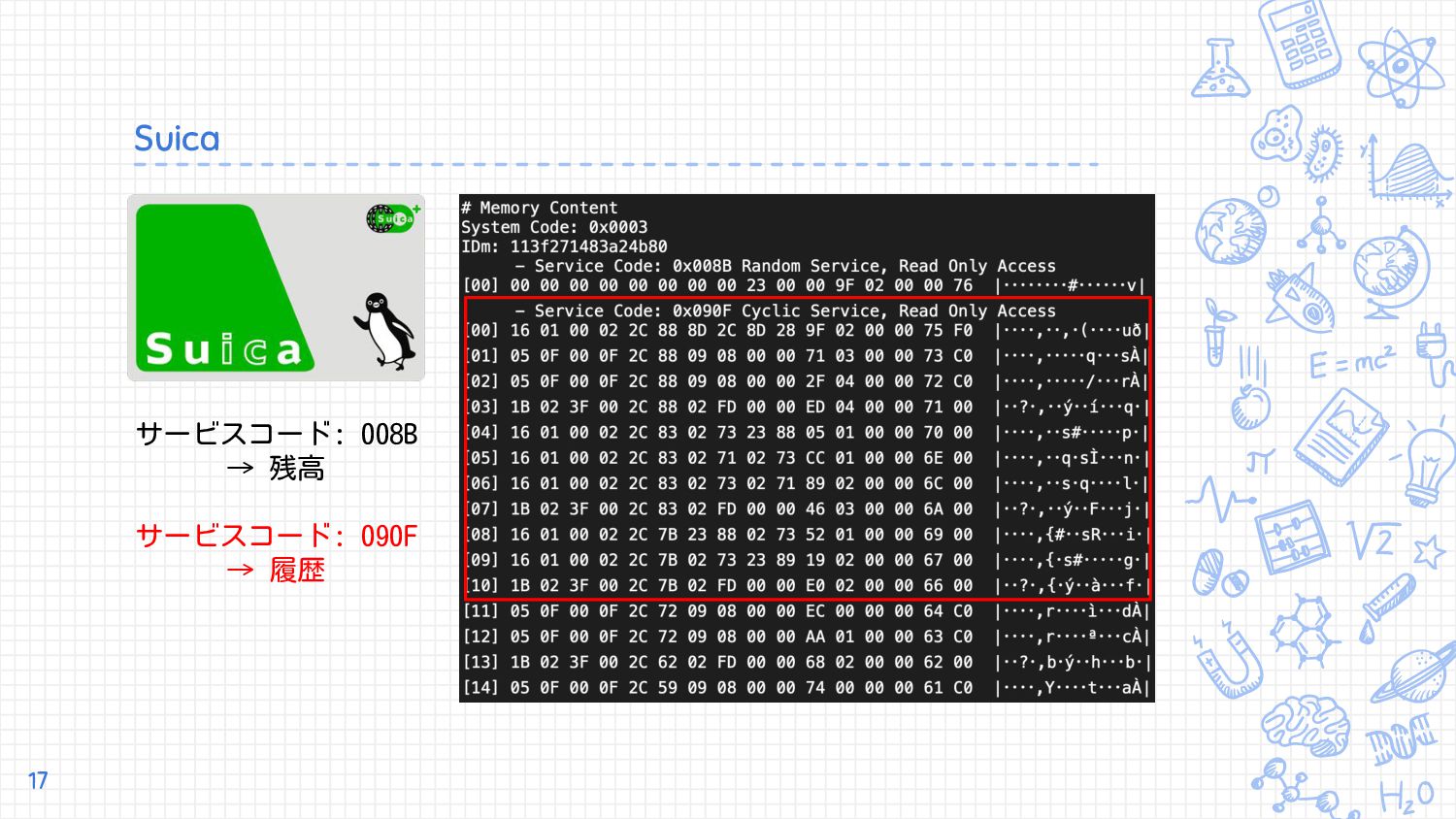 Suica 17 サービスコード: 008B → 残高 サービスコード: 090F → 履歴