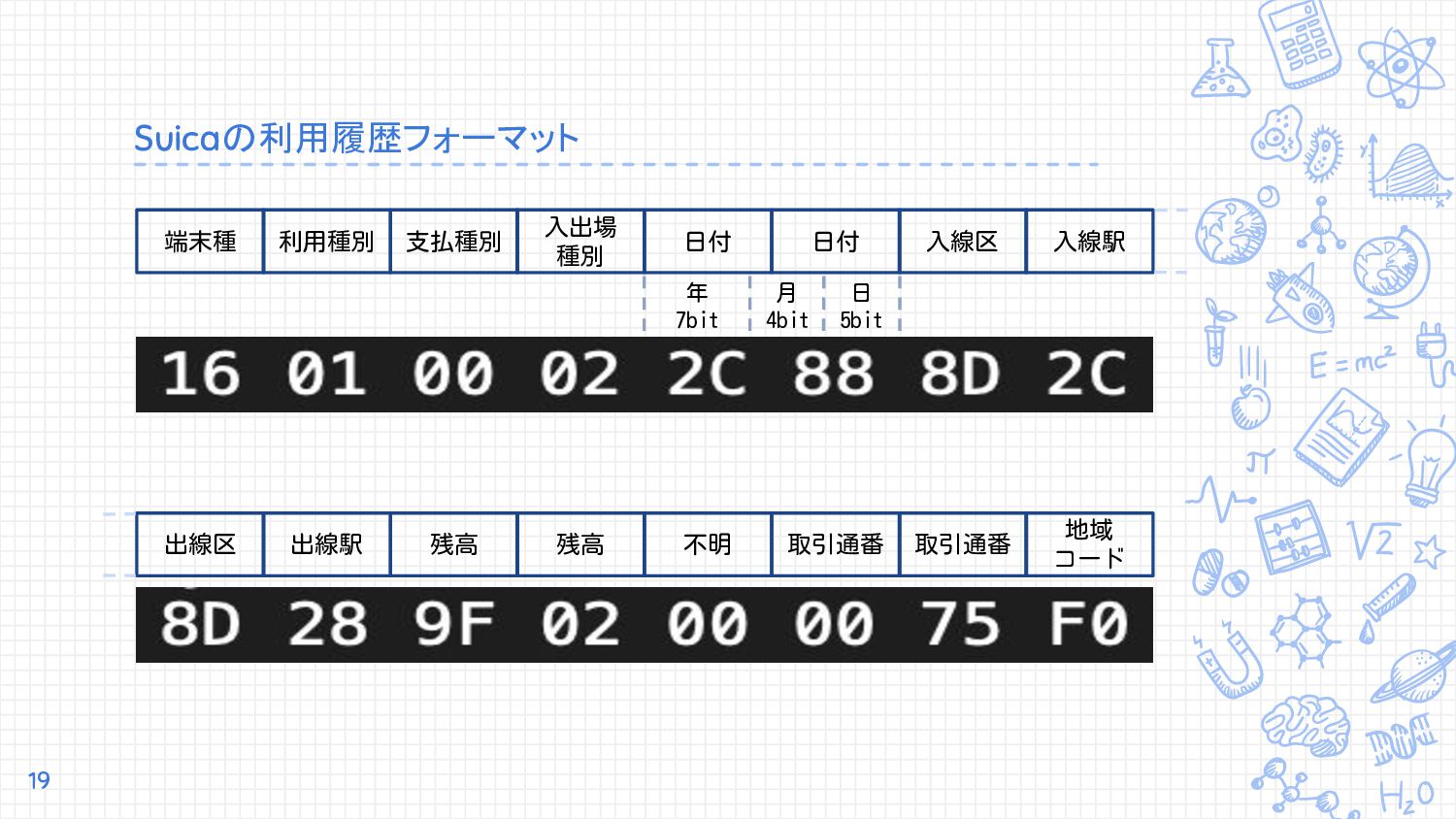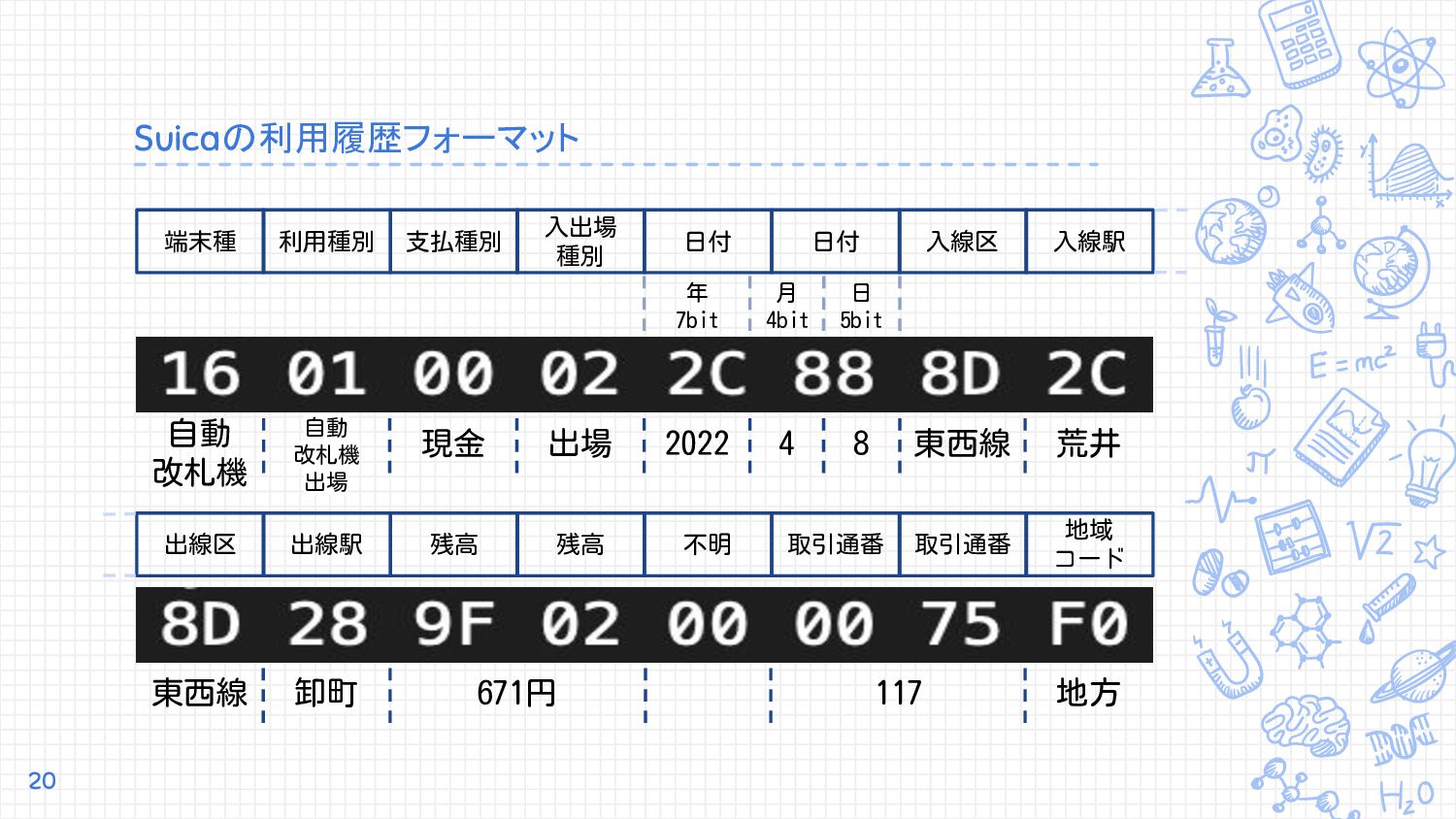 日付 利用履歴 http://jennychan.web.fc2.com/format/suica.html#090F 駅コード『自動改札機の研究』https://ja.ysrl.org/atc/station-code.html Suicaの利用履歴フォーマット 18 端末種 利用種別 支払種別 入出場