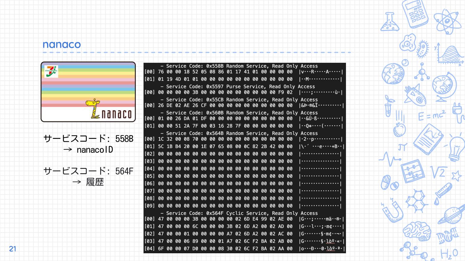 NFCについての概要とSuica、nanacoカードの読み取りなどを行い、データフォーマットなどの解説などについての資料になります。