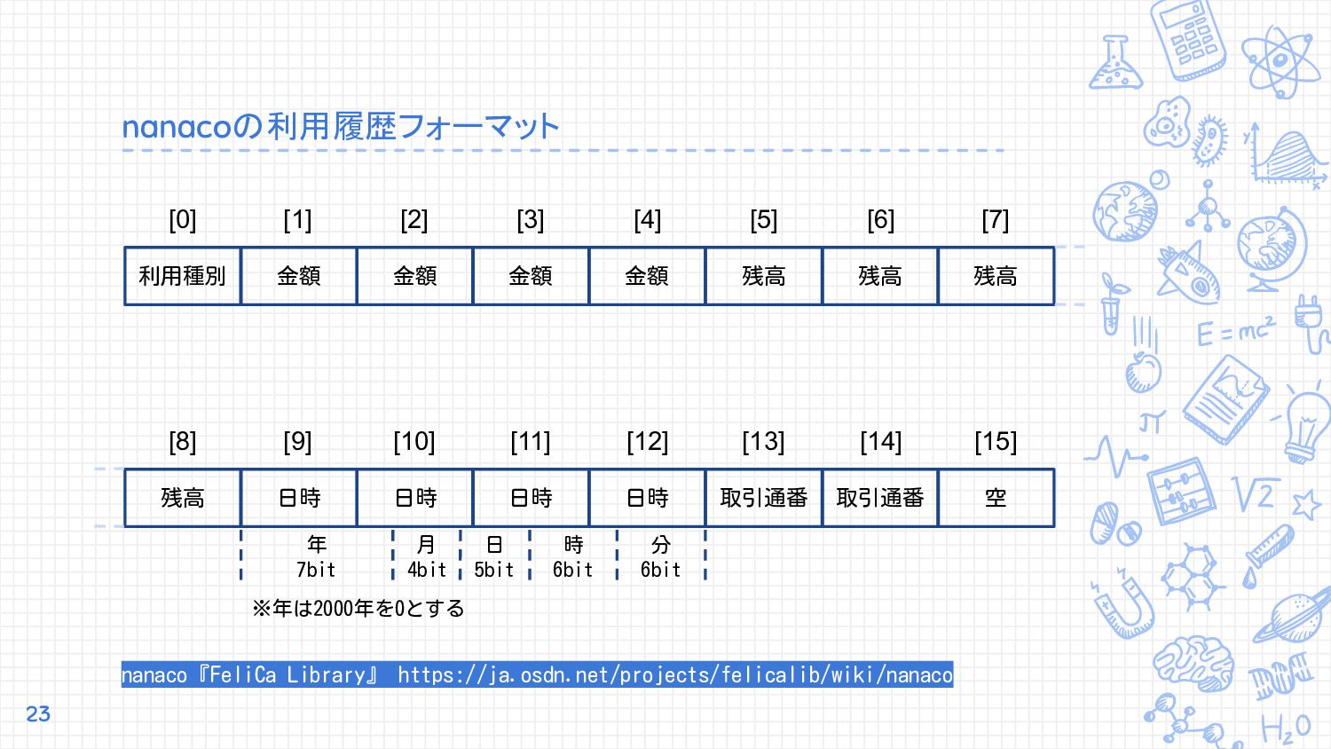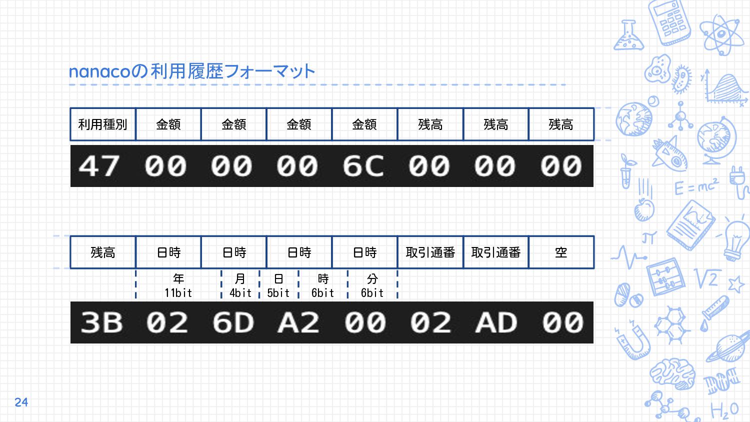 残高 nanaco『FeliCa Library』 https://ja.osdn.net/projects/felicalib/wiki/nanaco nanacoの利用履歴フォーマット 23 利用種別 金額 金額 金額