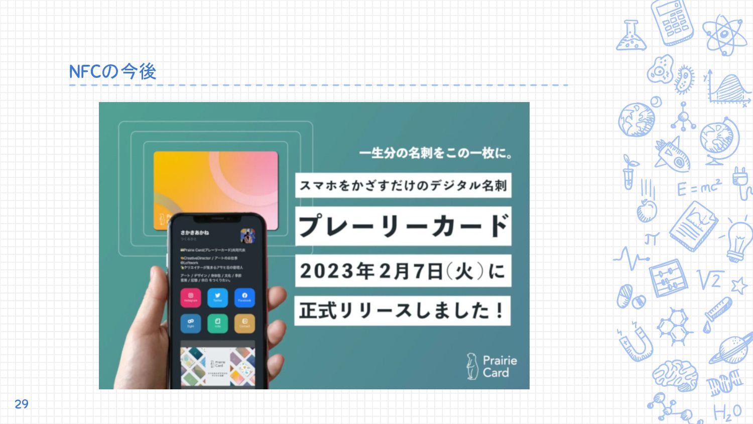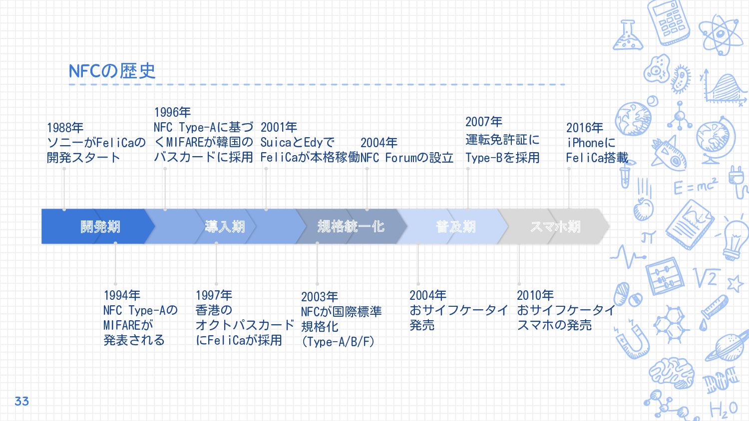 2001年 SuicaとEdyで FeliCaが本格稼働 2004年 NFC Forumの設立 2007年 運転免許証に Type-Bを採用 2016年 iPhoneに FeliCa搭載 1994年 NFC Type-Aの MIFAREが 発表される 1997年 香港の オクトパスカード にFeliCaが採用 2003年 NFCが国際標準 規格化 (Type-A/B/F) 2004年 おサイフケータイ 発売 2010年 おサイフケータイ スマホの発売 開発期 導入期 規格統一化 普及期 スマホ期