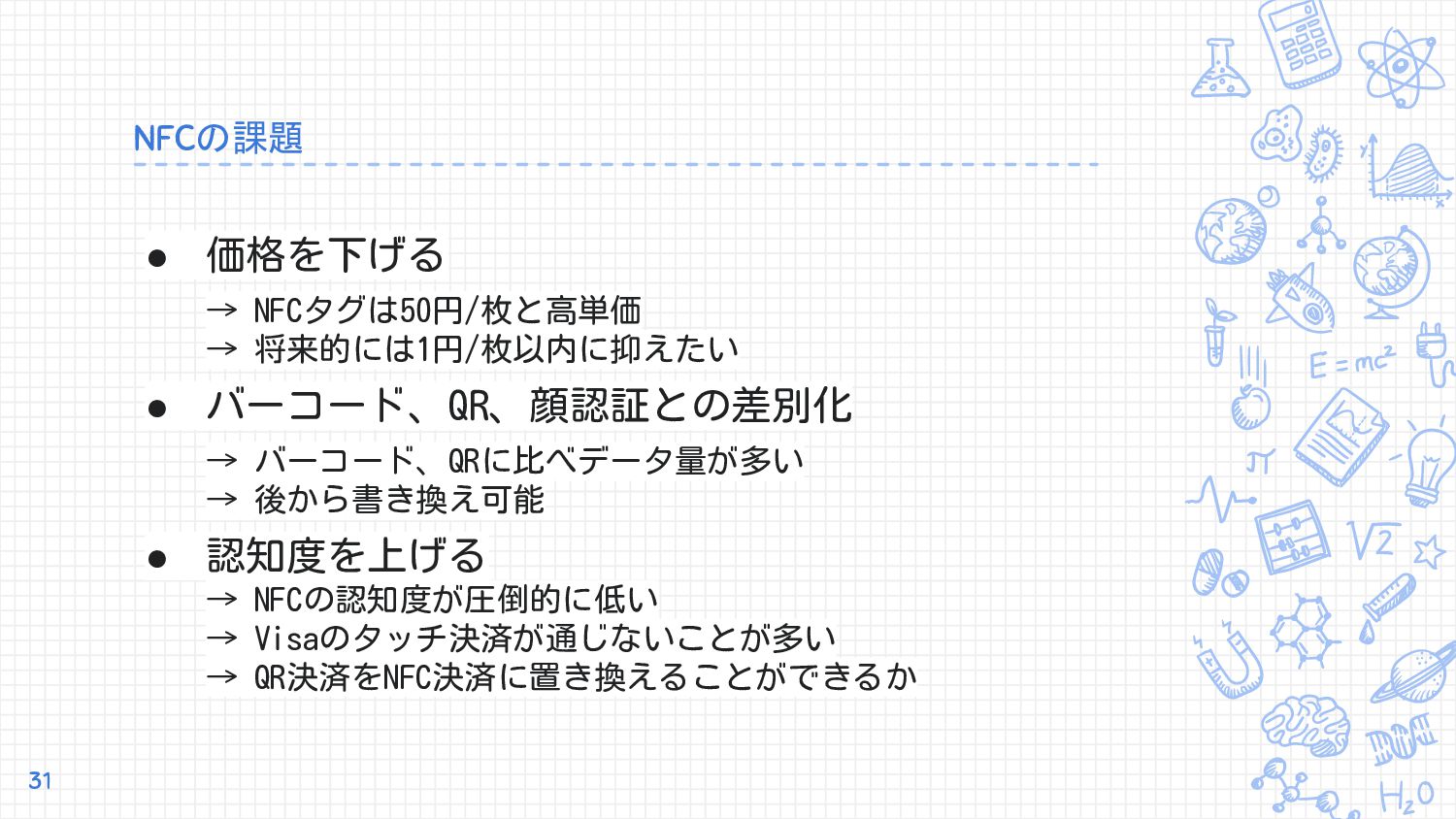 → バーコード、QRに比べデータ量が多い → 後から書き換え可能 • 認知度を上げる → NFCの認知度が圧倒的に低い → Visaのタッチ決済が通じないことが多い → QR決済をNFC決済に置き換えることができるか