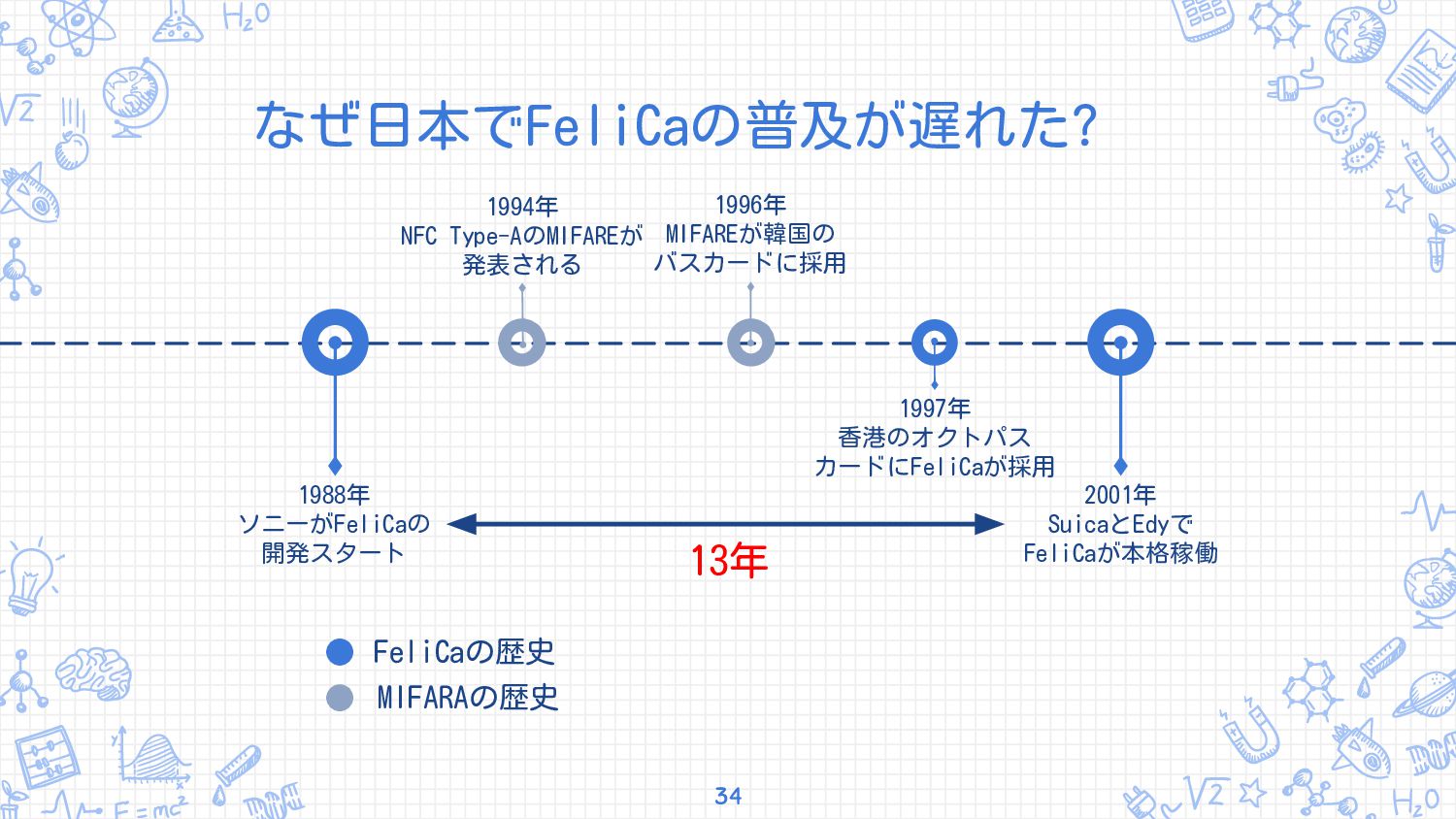 NFCの歴史 33 1988年 ソニーがFeliCaの 開発スタート 1996年 NFC Type-Aに基づ くMIFAREが韓国の バスカードに採用