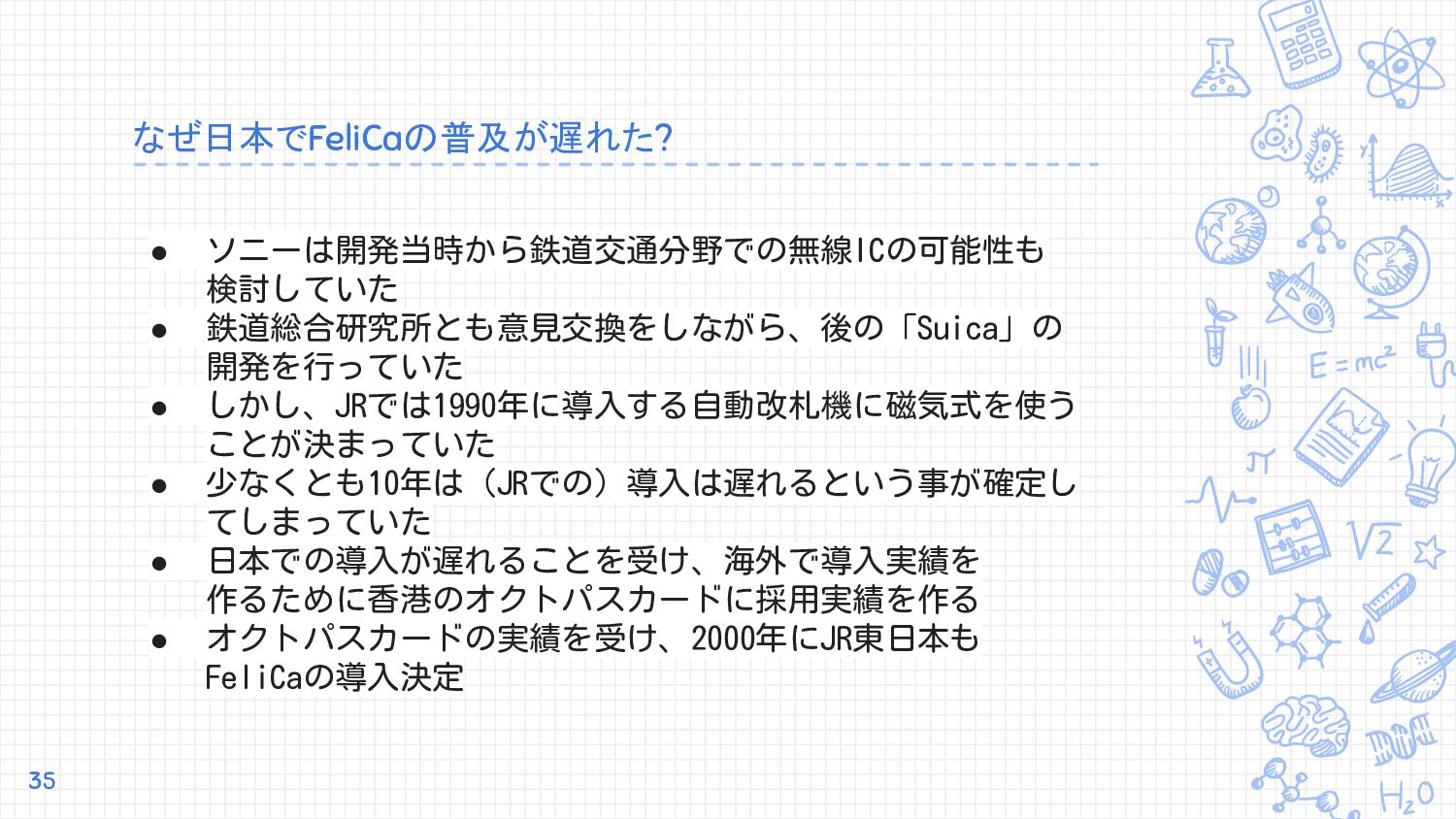 34 1994年 NFC Type-AのMIFAREが 発表される 1996年 MIFAREが韓国の バスカードに採用 13年 FeliCaの歴史 MIFARAの歴史