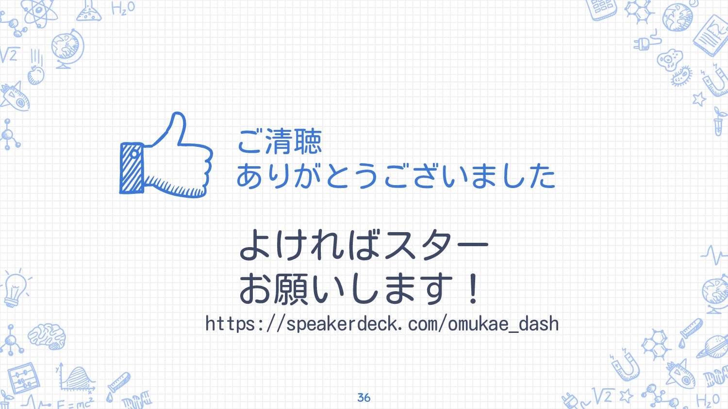 ご清聴 ありがとうございました よければスター お願いします! https://speakerdeck.com/omukae_dash 36