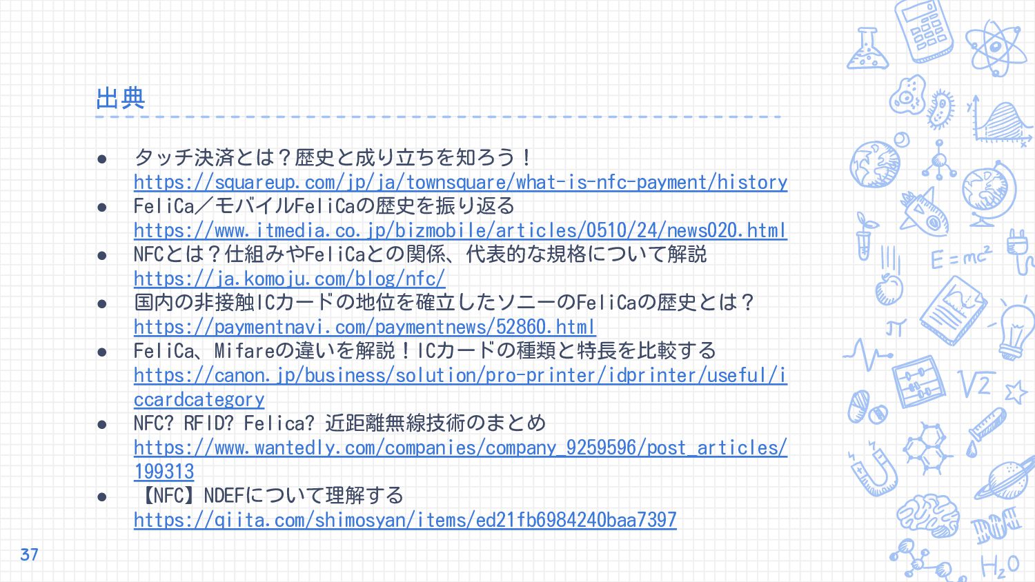 • 国内の非接触ICカードの地位を確立したソニーのFeliCaの歴史とは? https://paymentnavi.com/paymentnews/52860.html • FeliCa、Mifareの違いを解説!ICカードの種類と特長を比較する https://canon.jp/business/solution/pro-printer/idprinter/useful/i ccardcategory • NFC? RFID? Felica? 近距離無線技術のまとめ https://www.wantedly.com/companies/company_9259596/post_articles/ 199313 • 【NFC】NDEFについて理解する https://qiita.com/shimosyan/items/ed21fb6984240baa7397 37