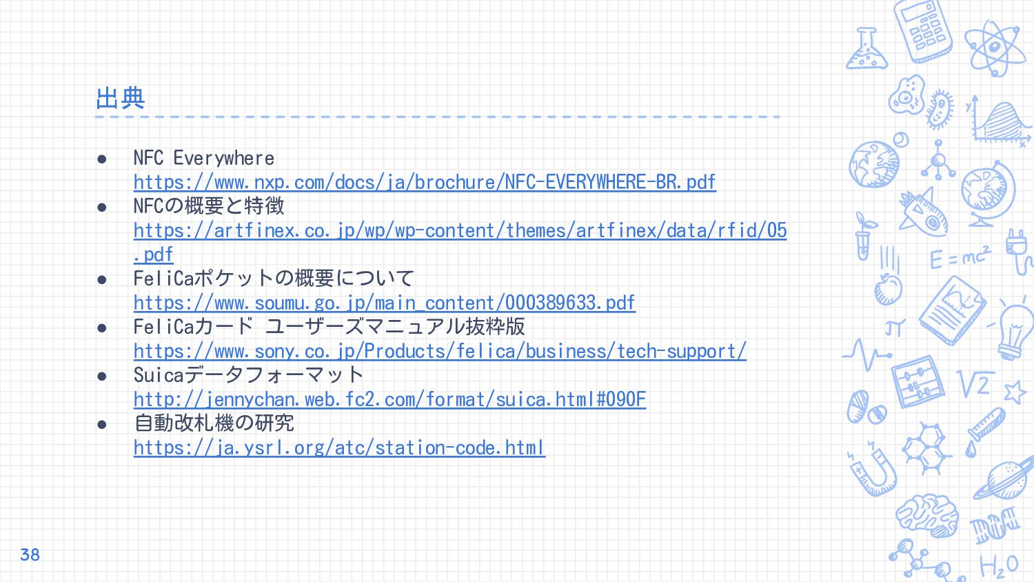 FeliCaポケットの概要について https://www.soumu.go.jp/main_content/000389633.pdf • FeliCaカード ユーザーズマニュアル抜粋版 https://www.sony.co.jp/Products/felica/business/tech-support/ • Suicaデータフォーマット http://jennychan.web.fc2.com/format/suica.html#090F • 自動改札機の研究 https://ja.ysrl.org/atc/station-code.html 38