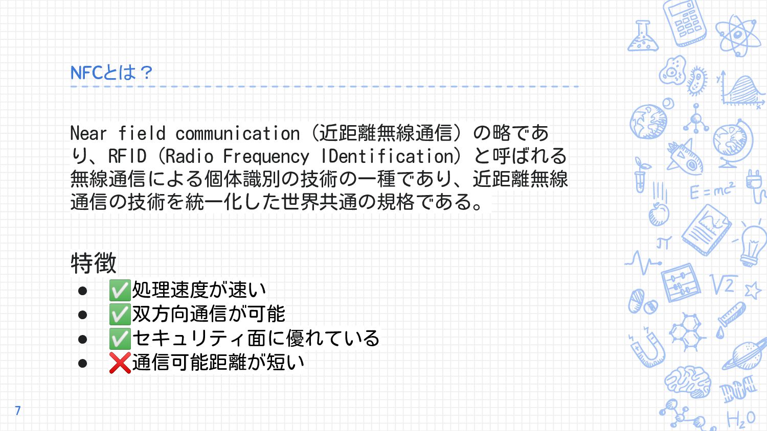 特徴 • ✅処理速度が速い • ✅双方向通信が可能 • ✅セキュリティ面に優れている • ❌通信可能距離が短い NFCとは? 7