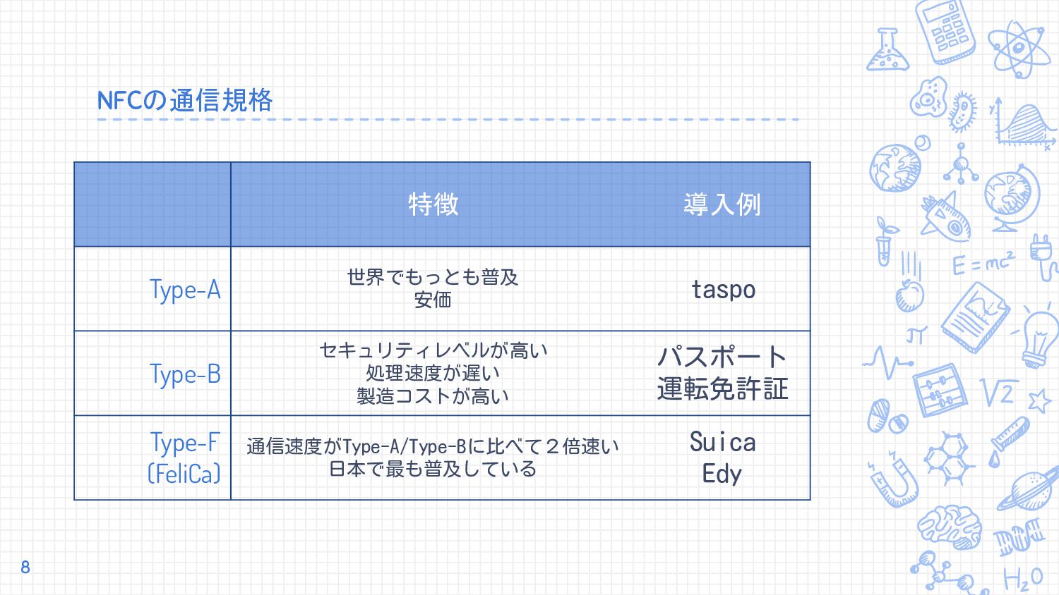 製造コストが高い パスポート 運転免許証 Type-F (FeliCa) 通信速度がType-A/Type-Bに比べて2倍速い 日本で最も普及している Suica Edy 8